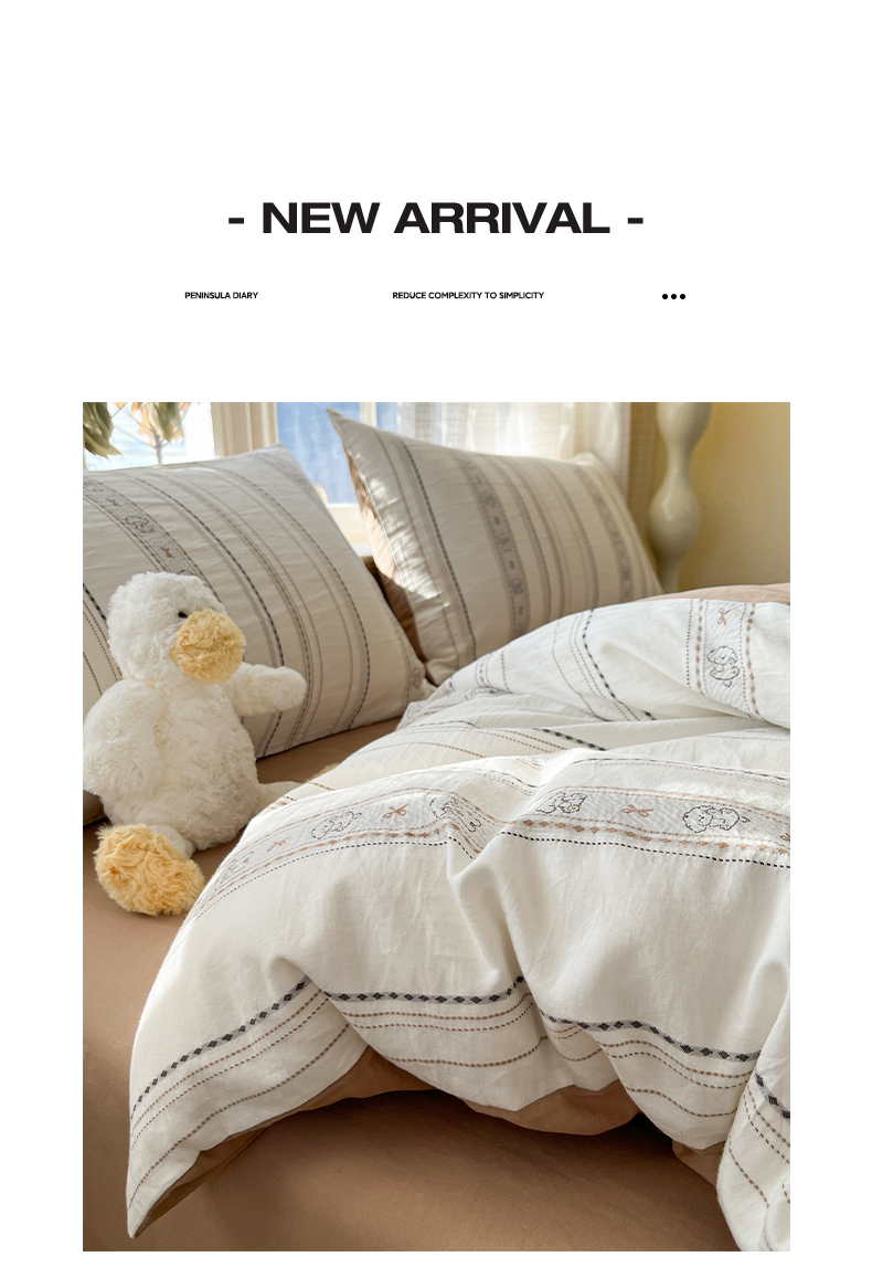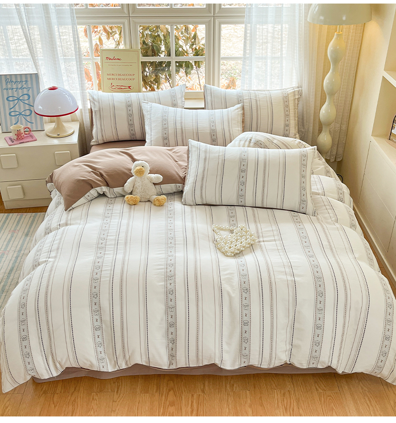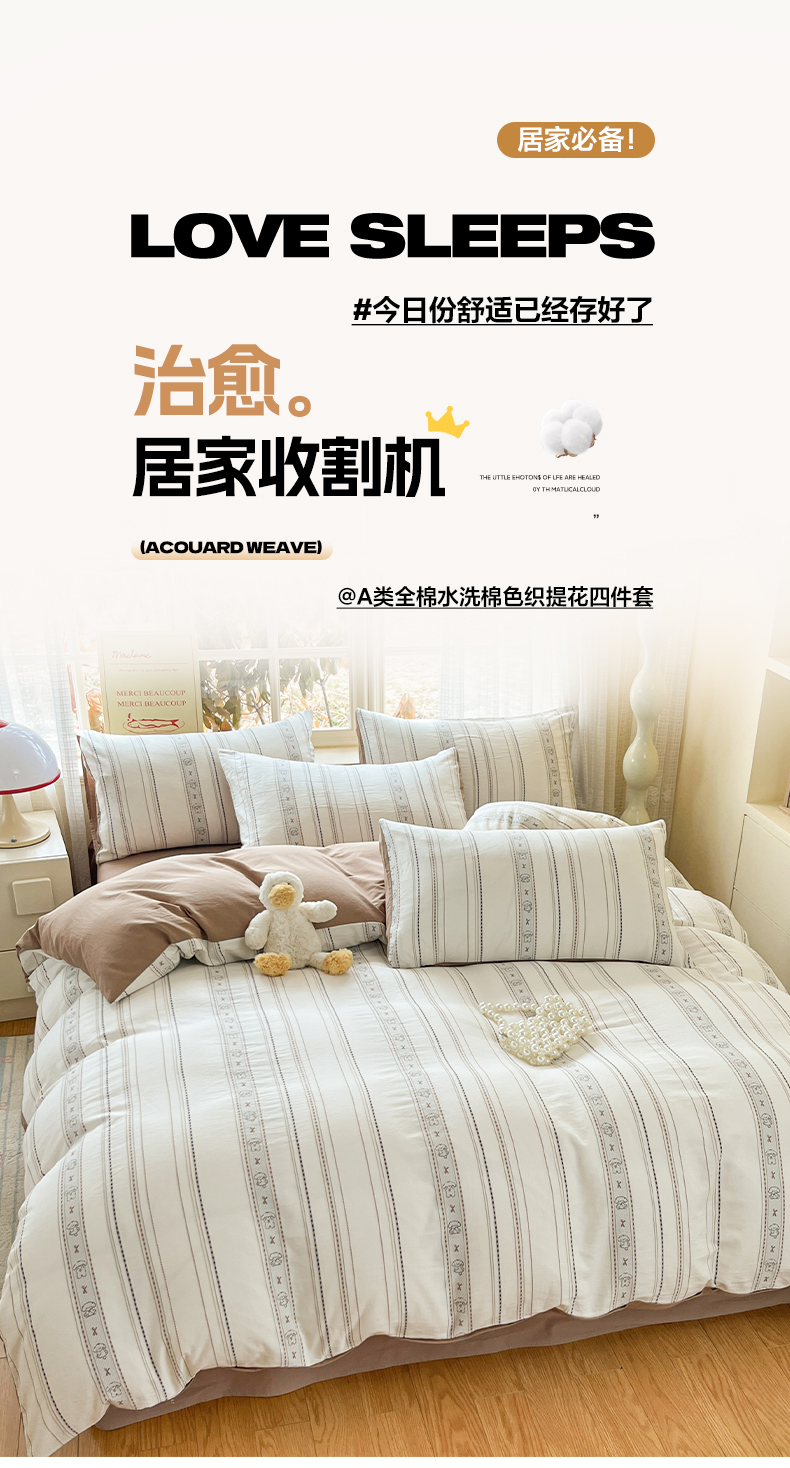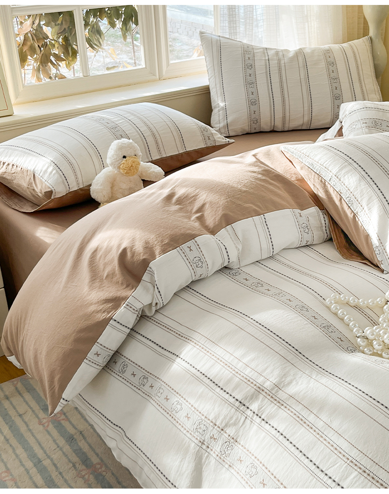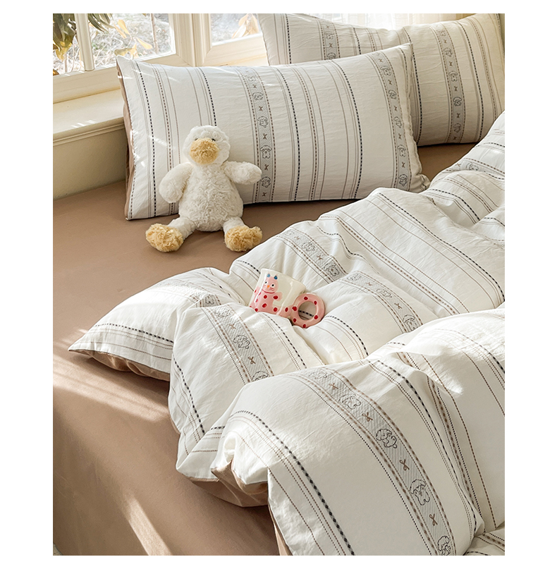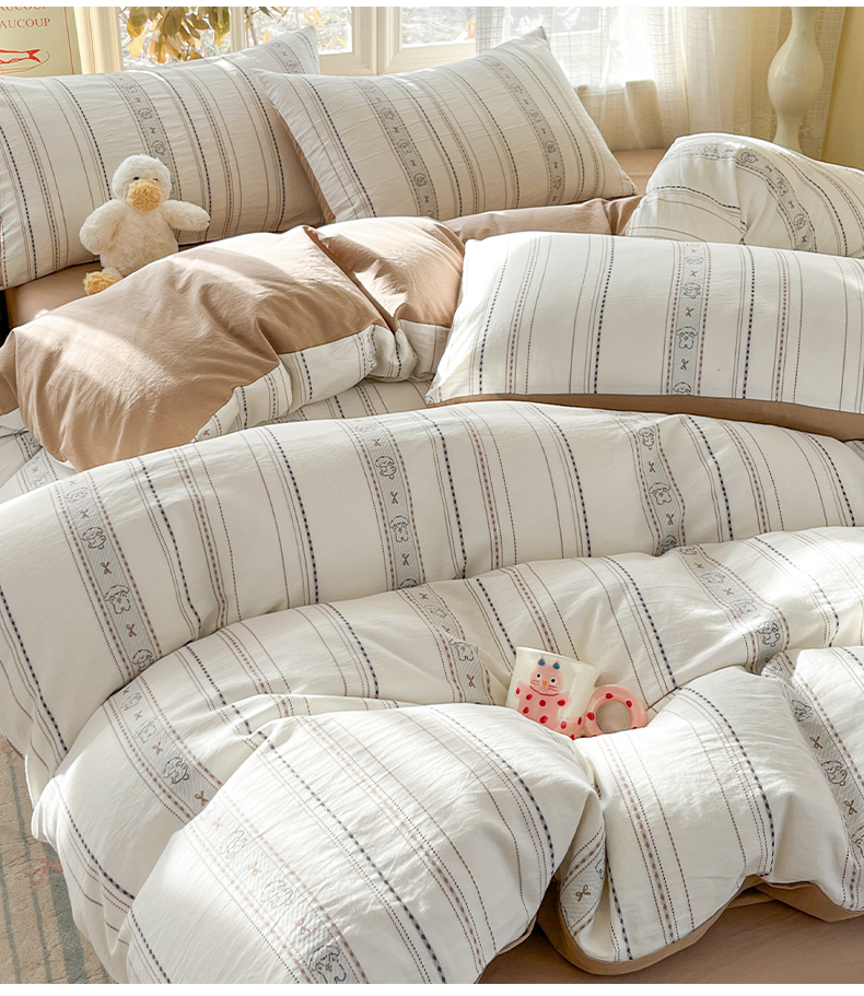 > 莱登卡奴 2026新款全棉纯棉A类水洗棉色织提花剪花系列四件套 条纹日记摩卡