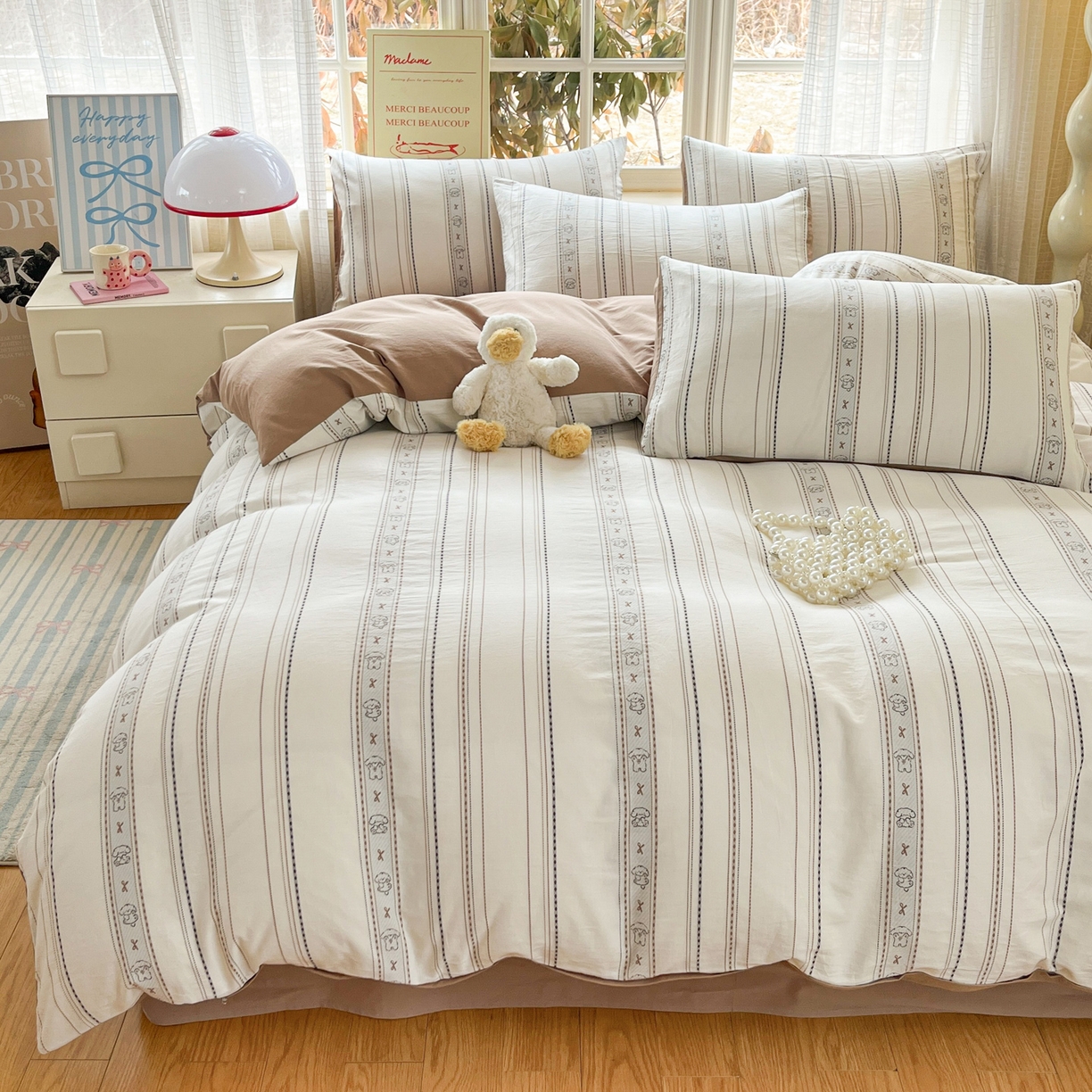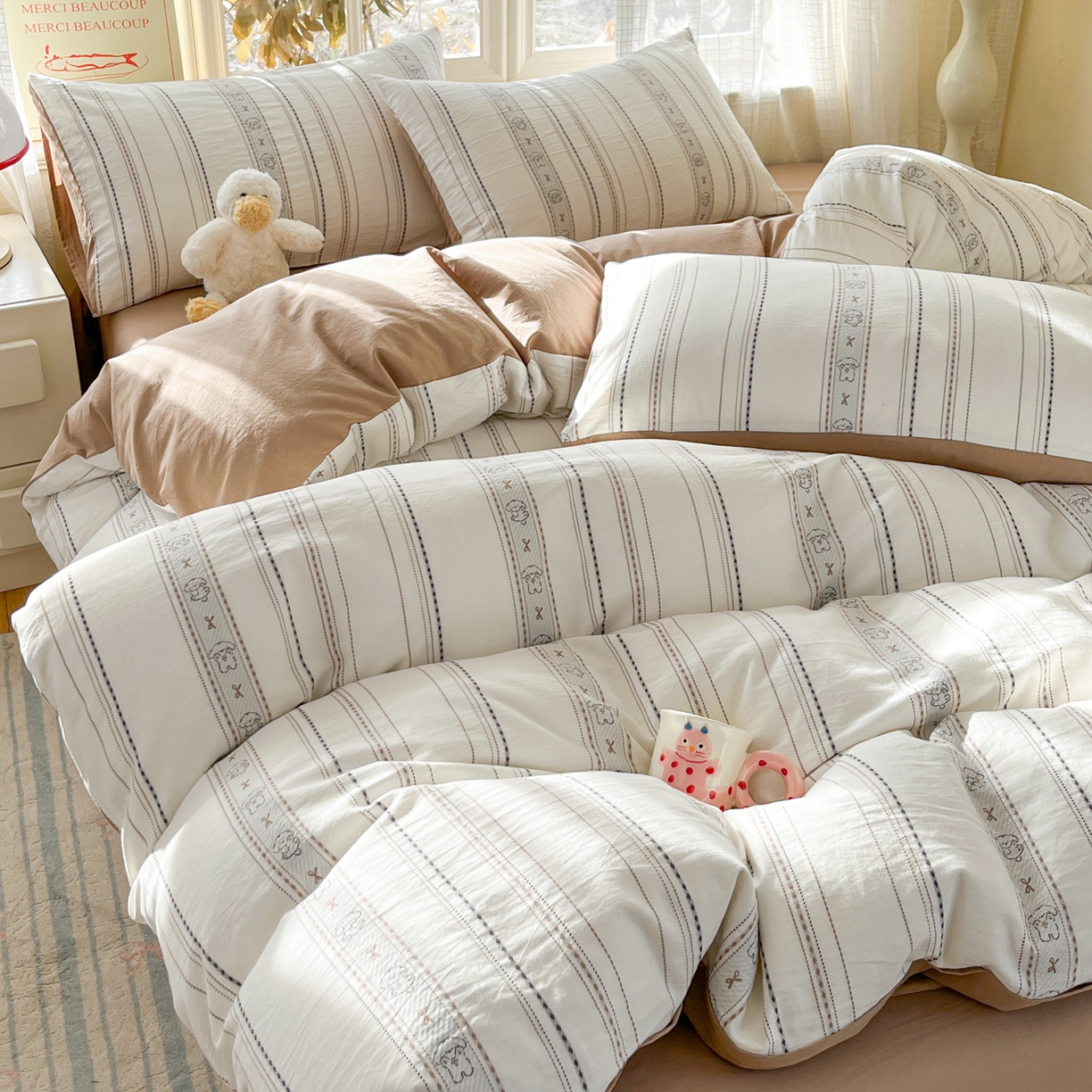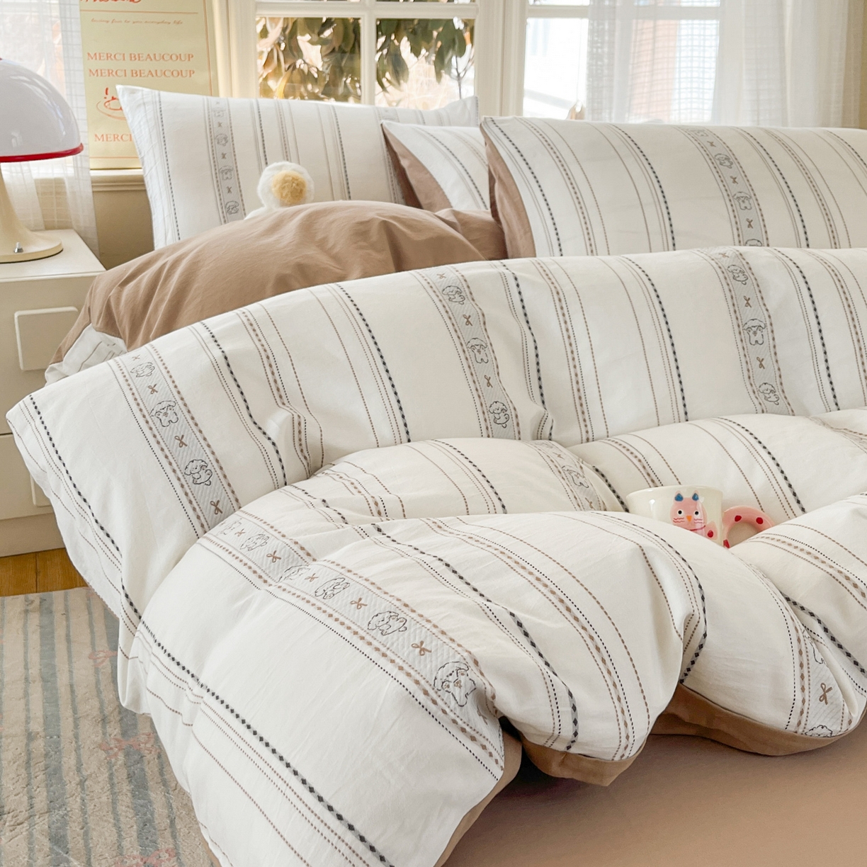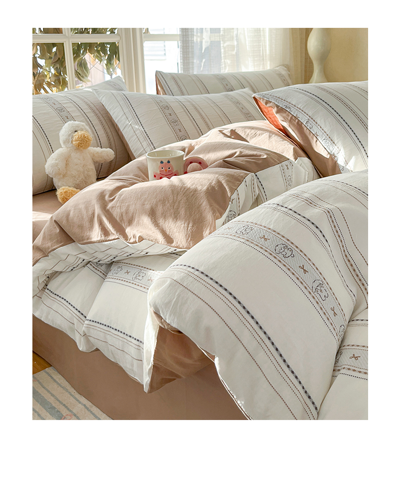 > 莱登卡奴 2026新款全棉纯棉A类水洗棉色织提花剪花系列四件套 条纹日记摩卡
