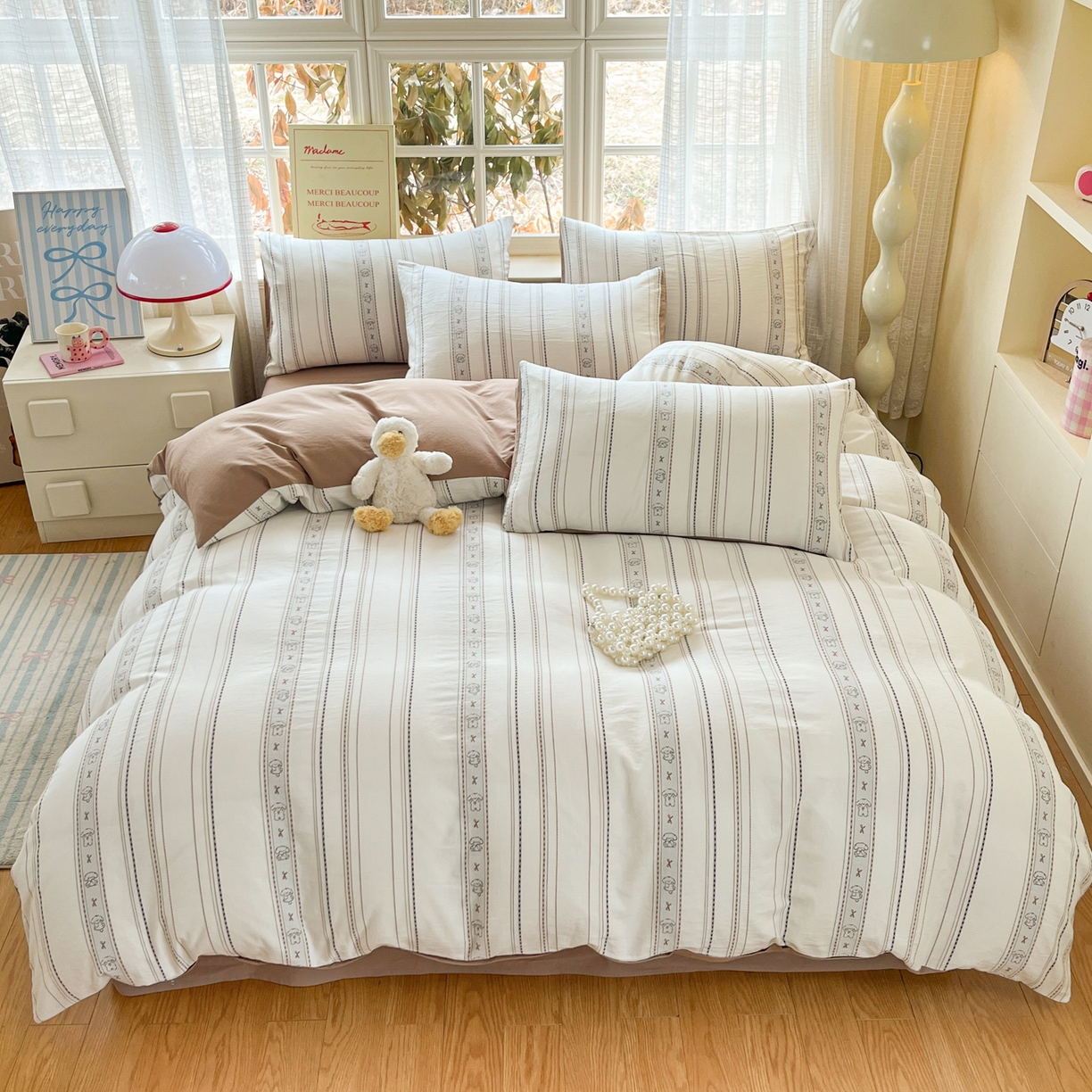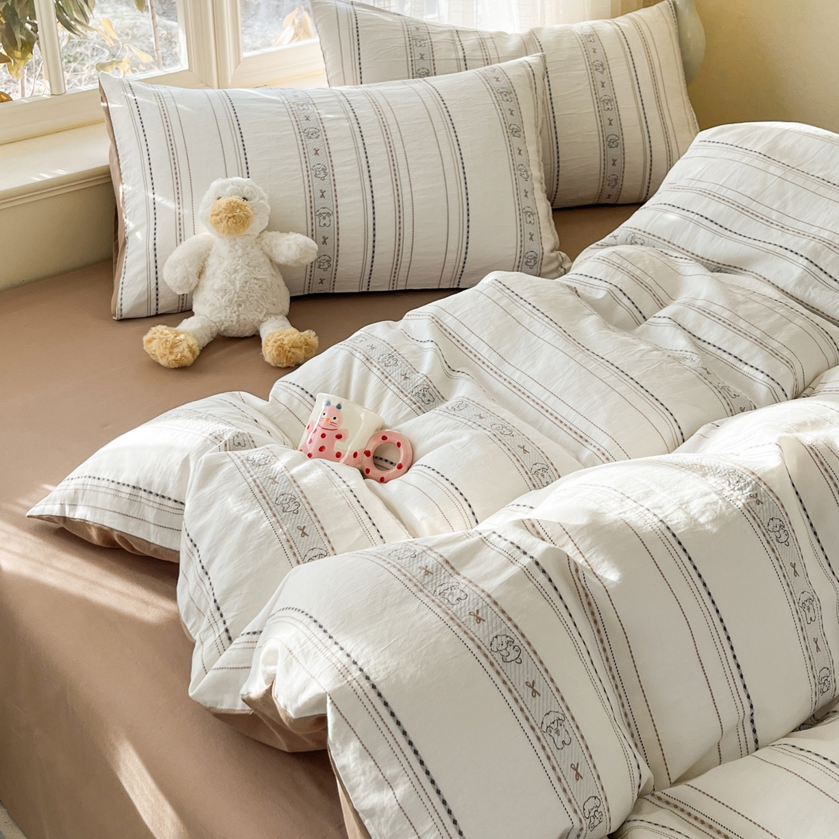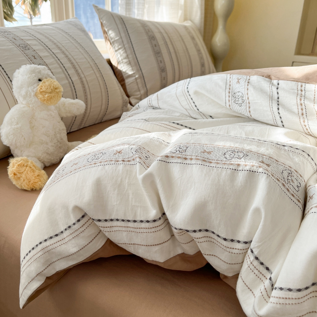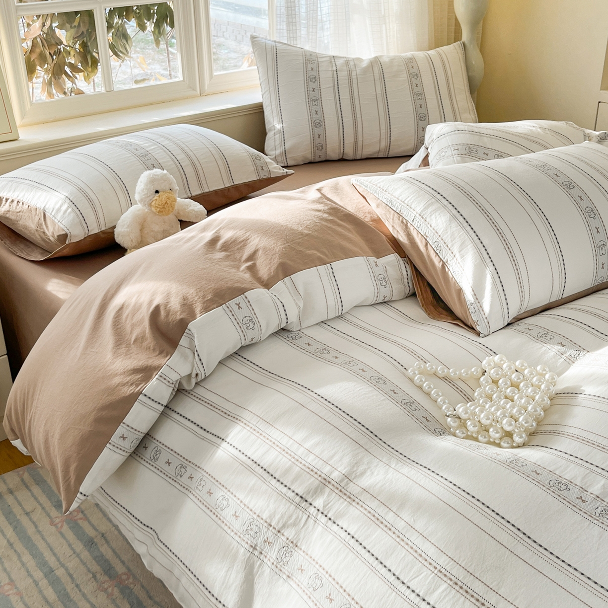 > 莱登卡奴 2026新款全棉纯棉A类水洗棉色织提花剪花系列四件套 条纹日记摩卡