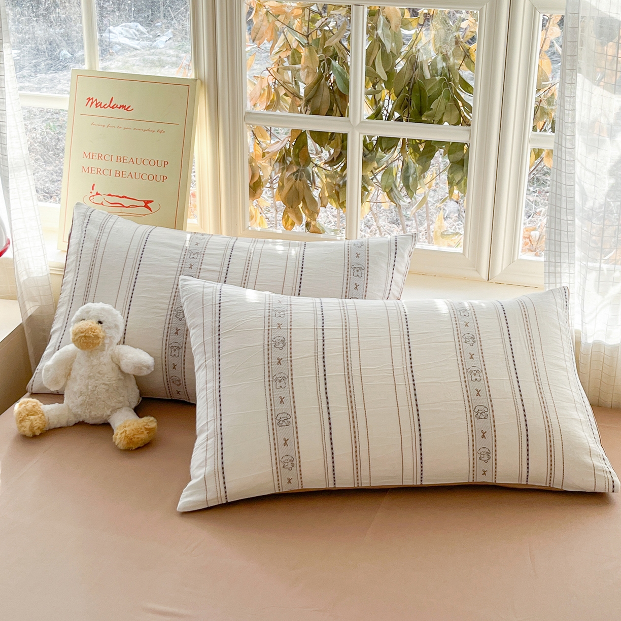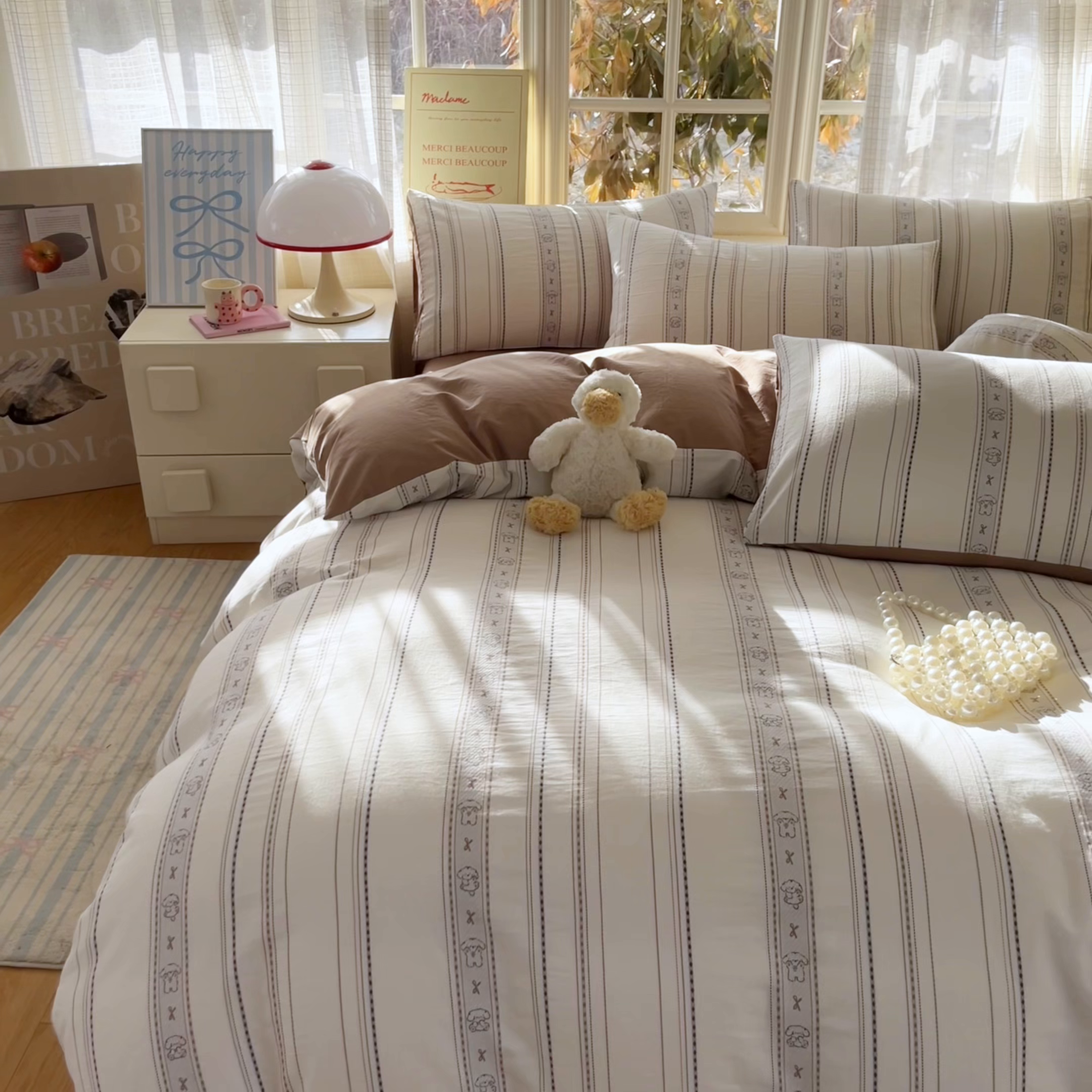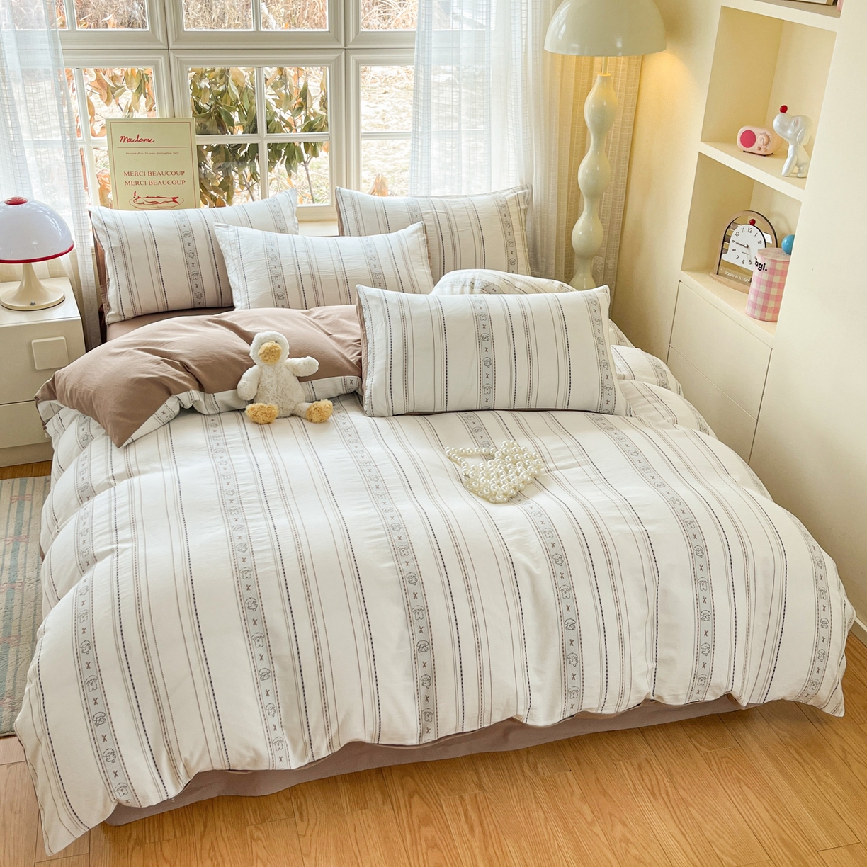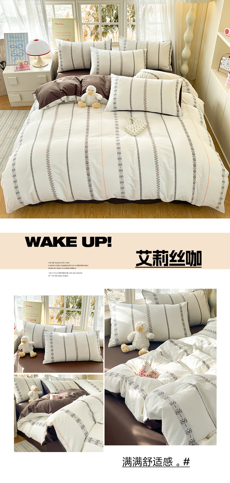 > 莱登卡奴 2026新款全棉纯棉A类水洗棉色织提花剪花系列四件套 条纹日记摩卡