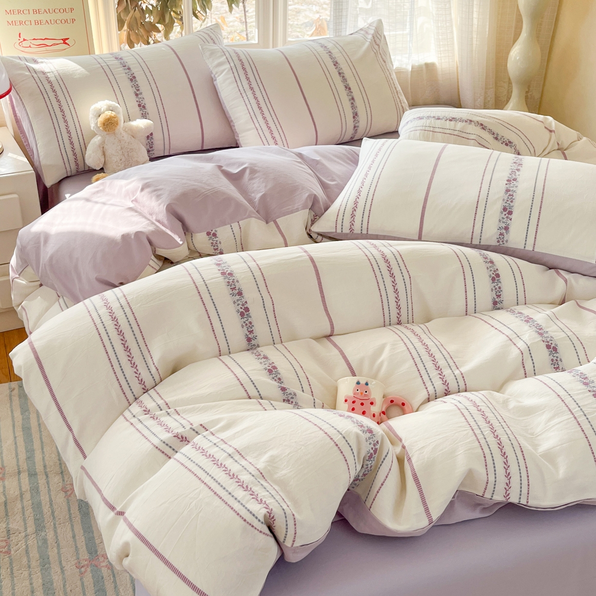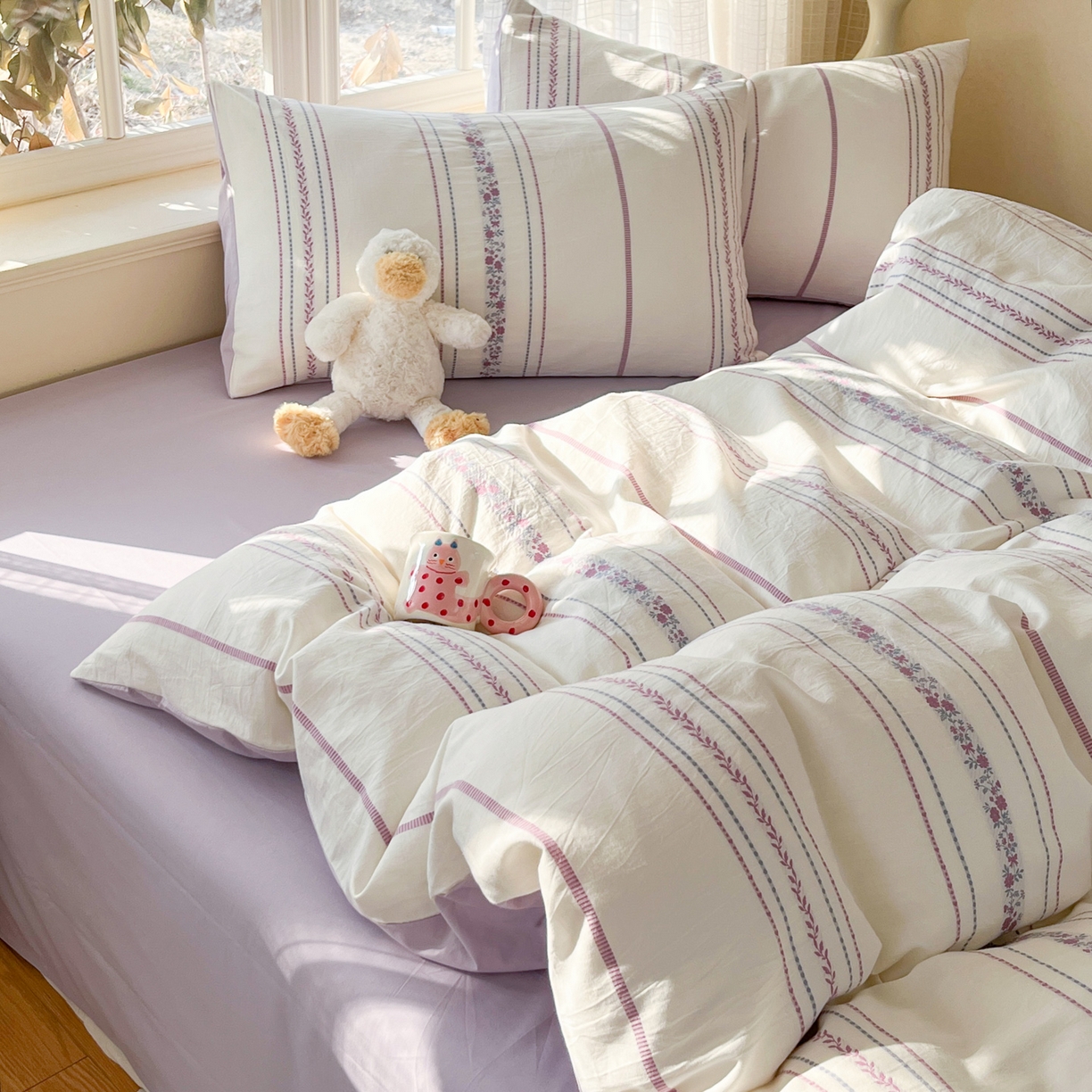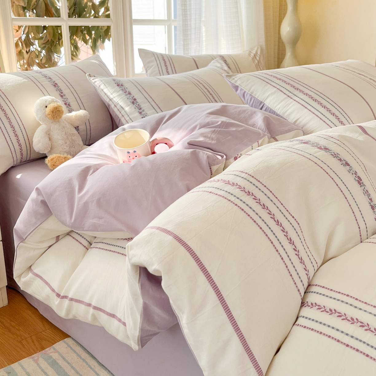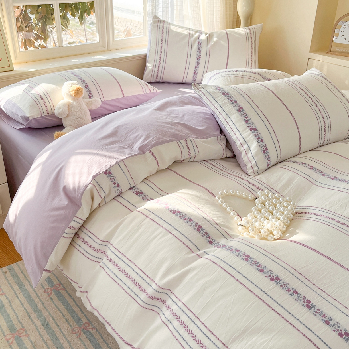 > 莱登卡奴 2026新款全棉纯棉A类水洗棉色织提花剪花系列四件套 纹络花时紫