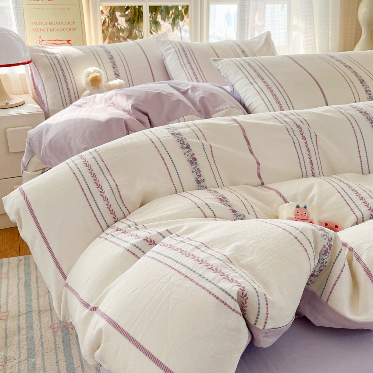 莱登卡奴 2026新款全棉纯棉A类水洗棉色织提花剪花系列四件套 纹络花时紫
