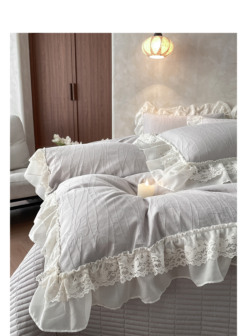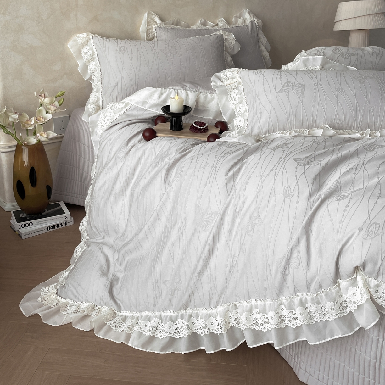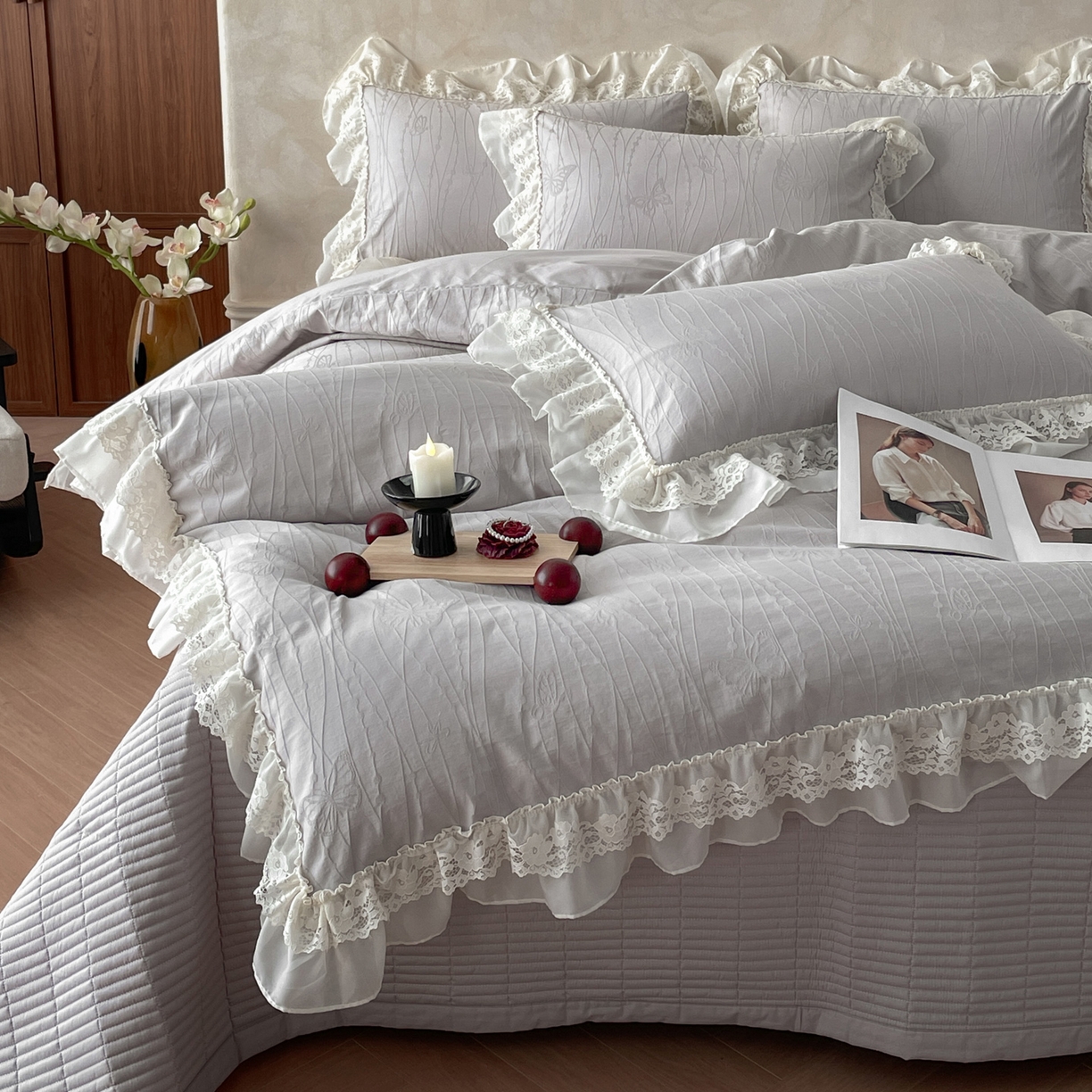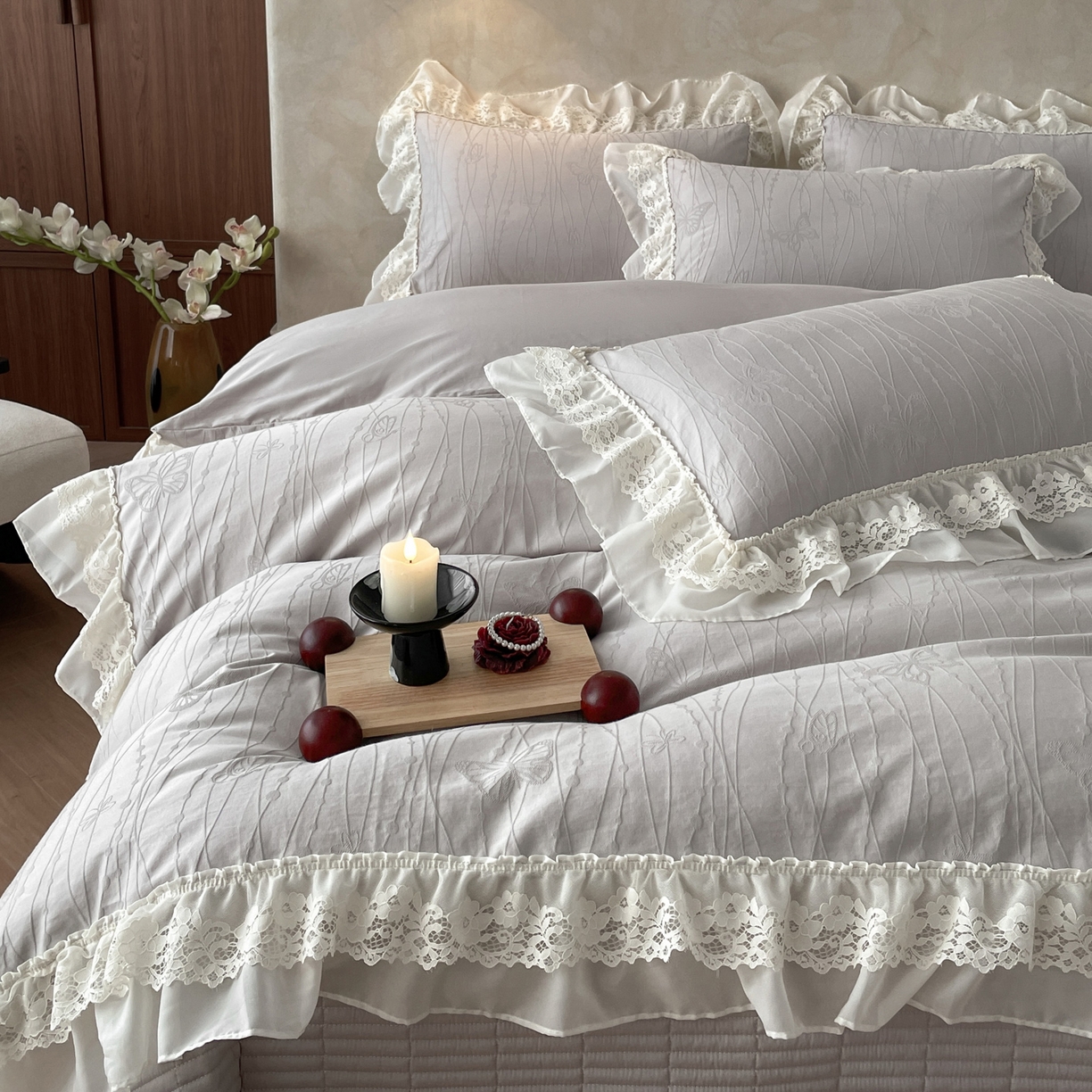 > 莱登卡奴 2026新款全棉纯棉A类60S水洗浮雕立体提花花边床盖款四件套-温馨系列 蝶梦银灰