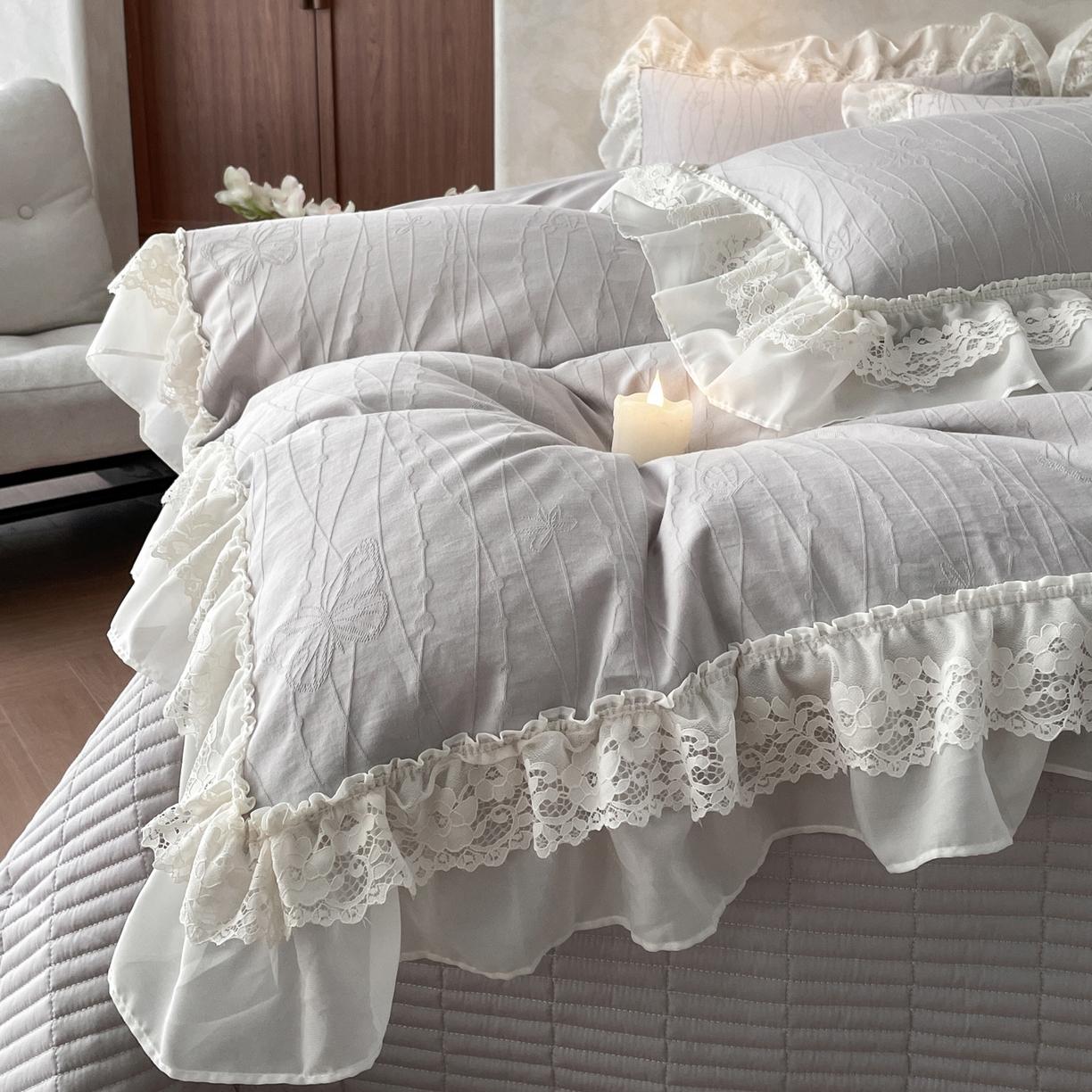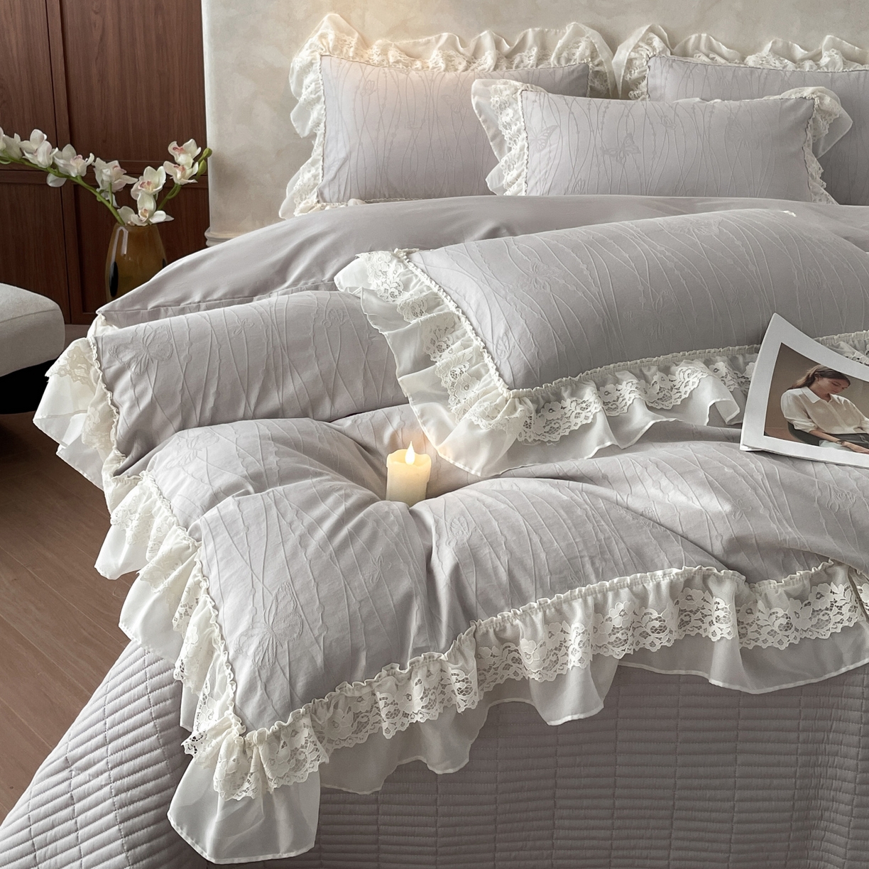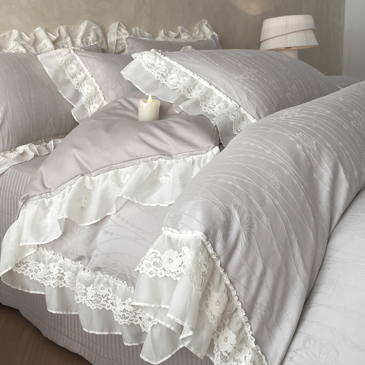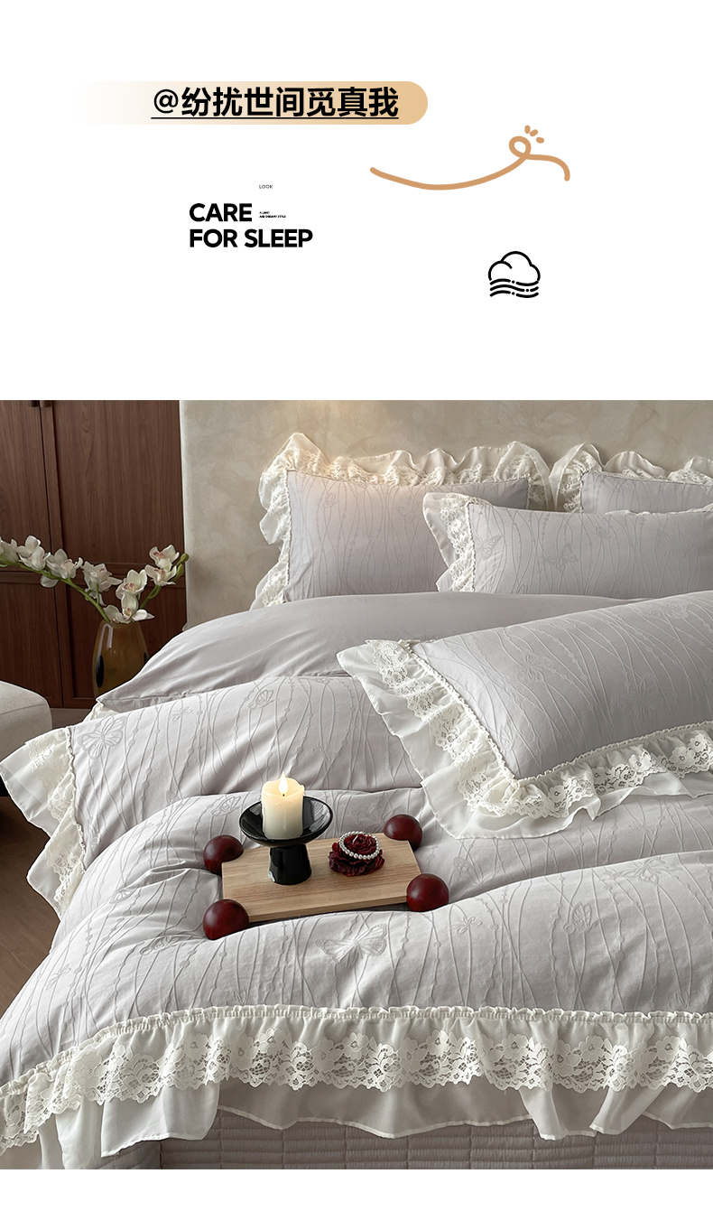 > 莱登卡奴 2026新款全棉纯棉A类60S水洗浮雕立体提花花边床盖款四件套-温馨系列 蝶梦银灰