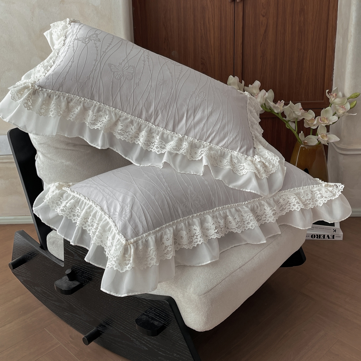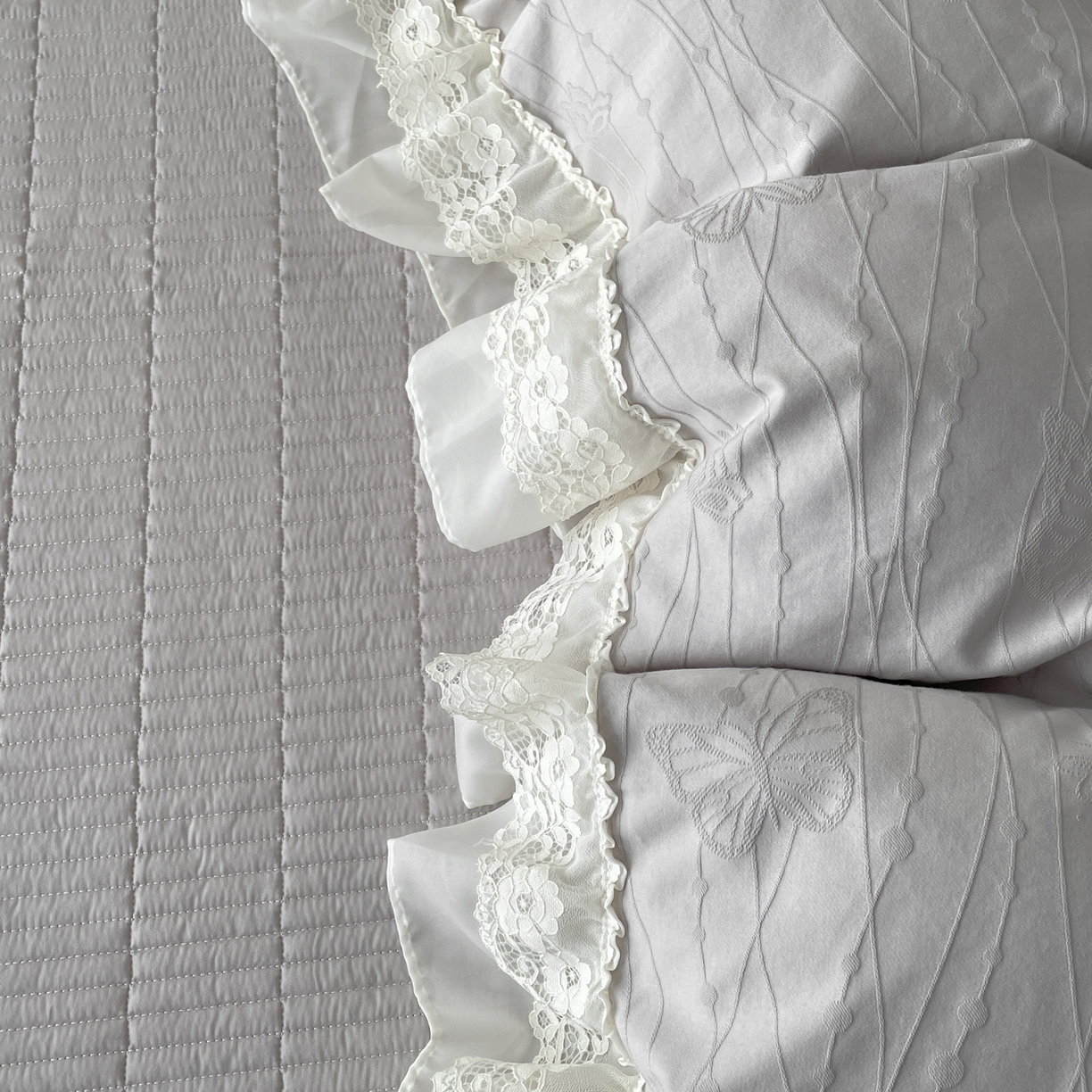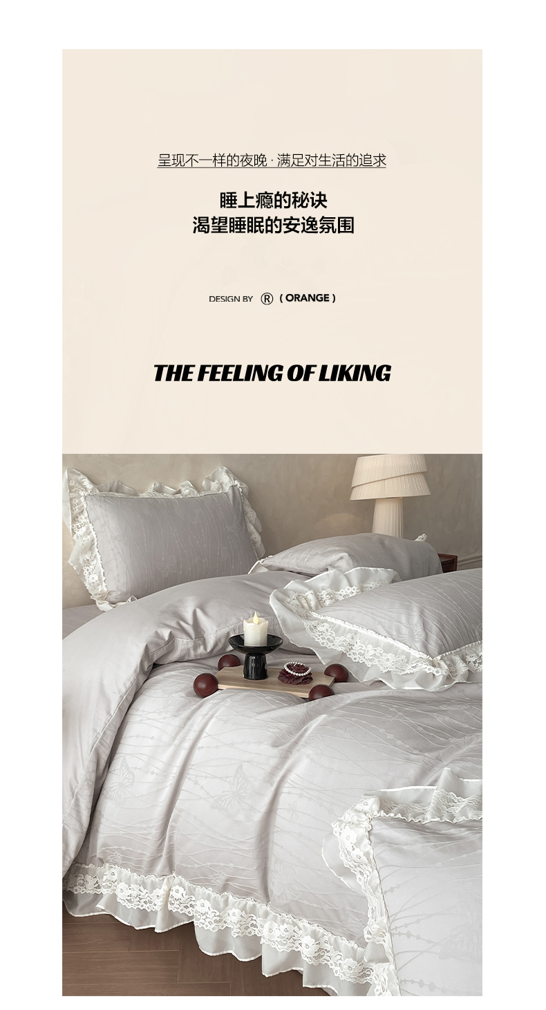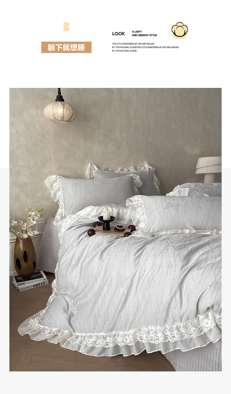 > 莱登卡奴 2026新款全棉纯棉A类60S水洗浮雕立体提花花边床盖款四件套-温馨系列 蝶梦银灰