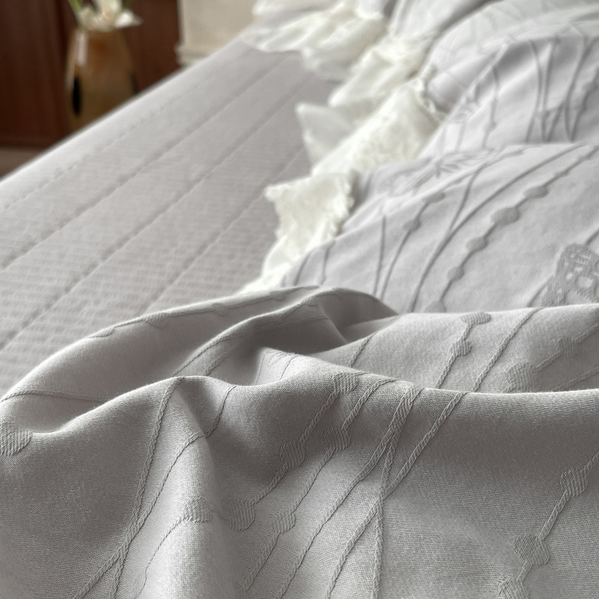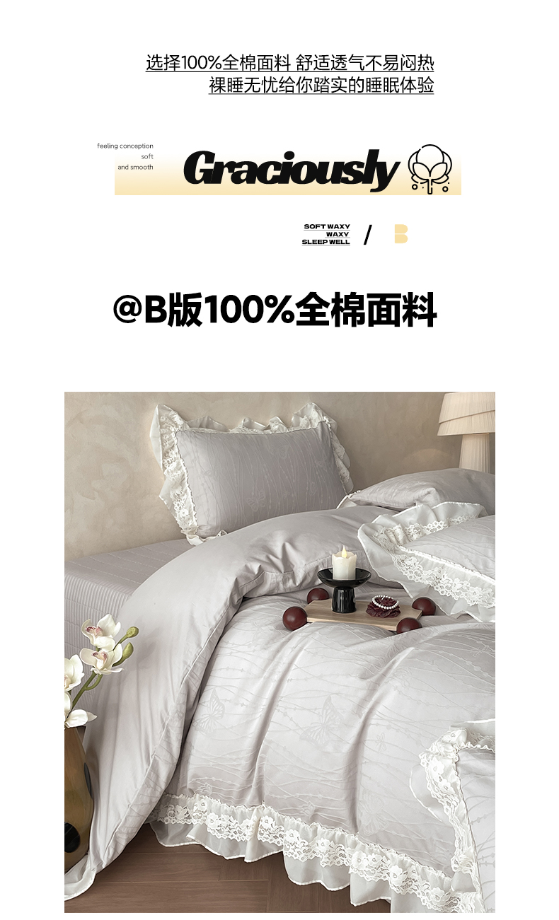 莱登卡奴 2026新款全棉纯棉A类60S水洗浮雕立体提花花边床盖款四件套-温馨系列 蝶梦银灰