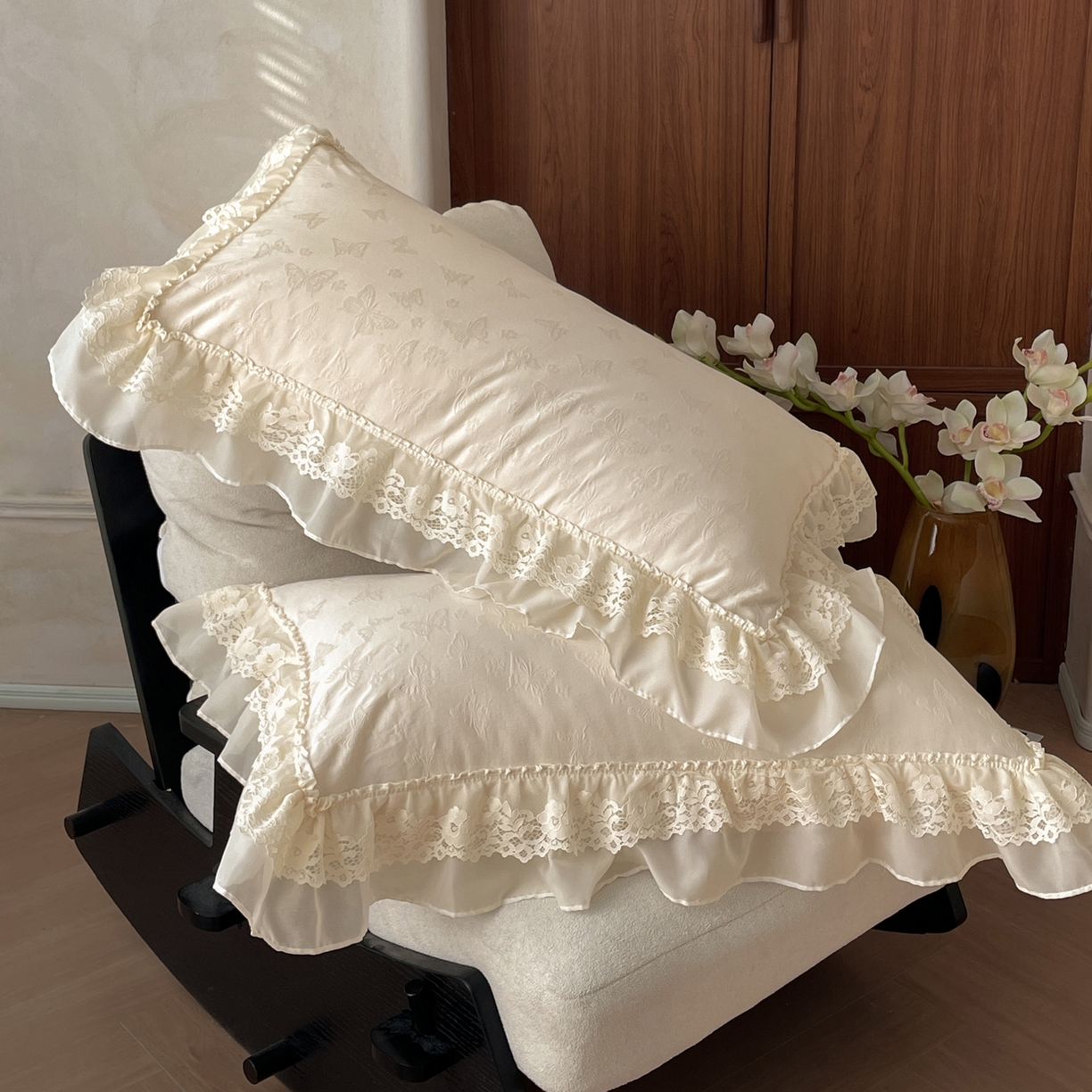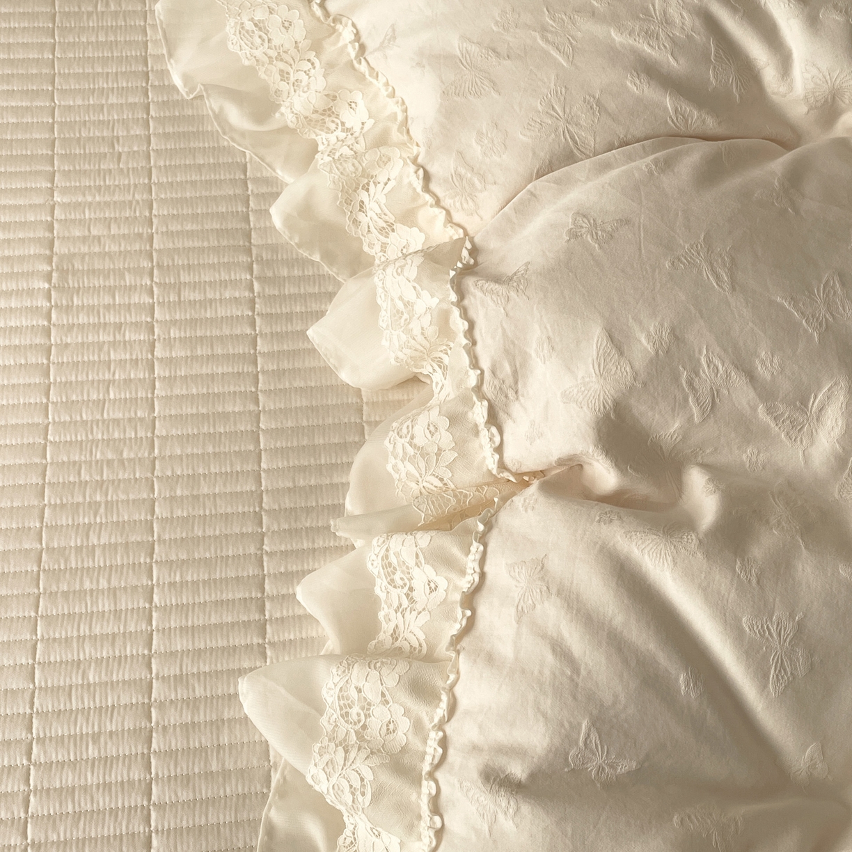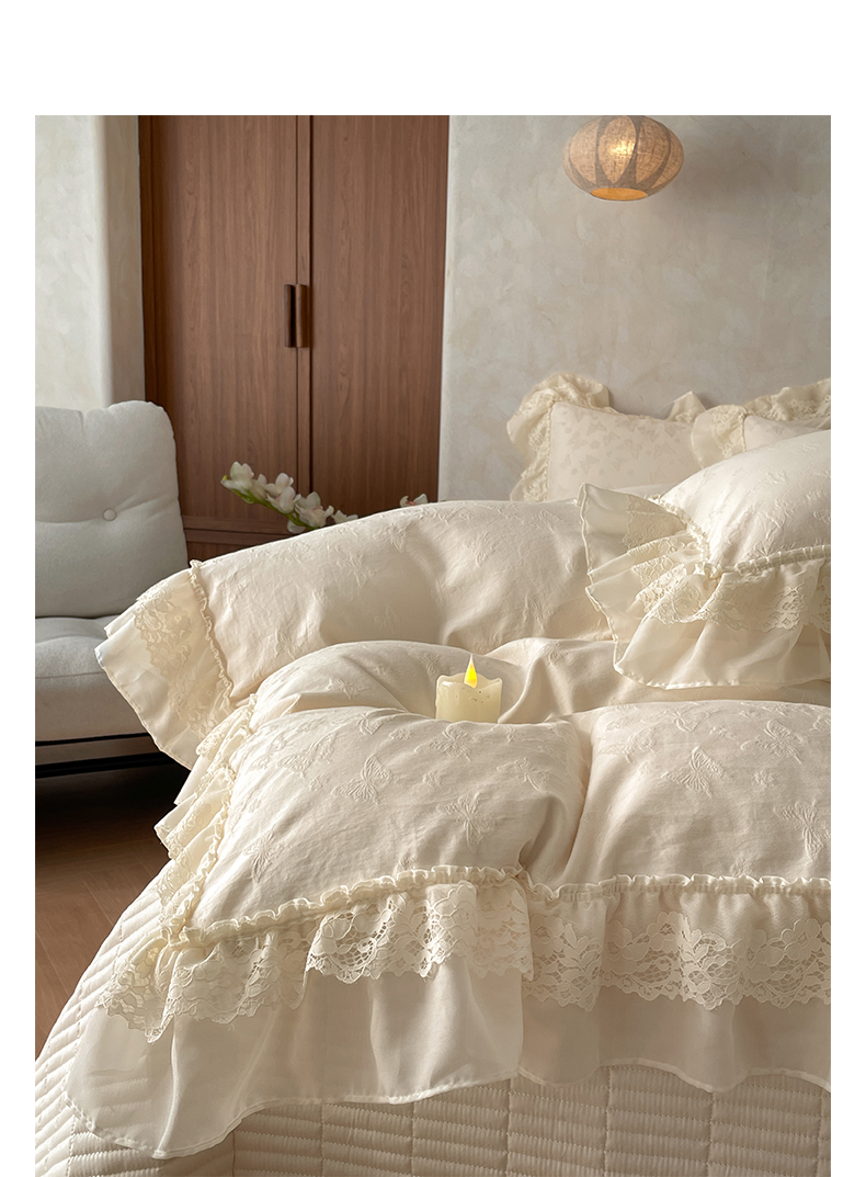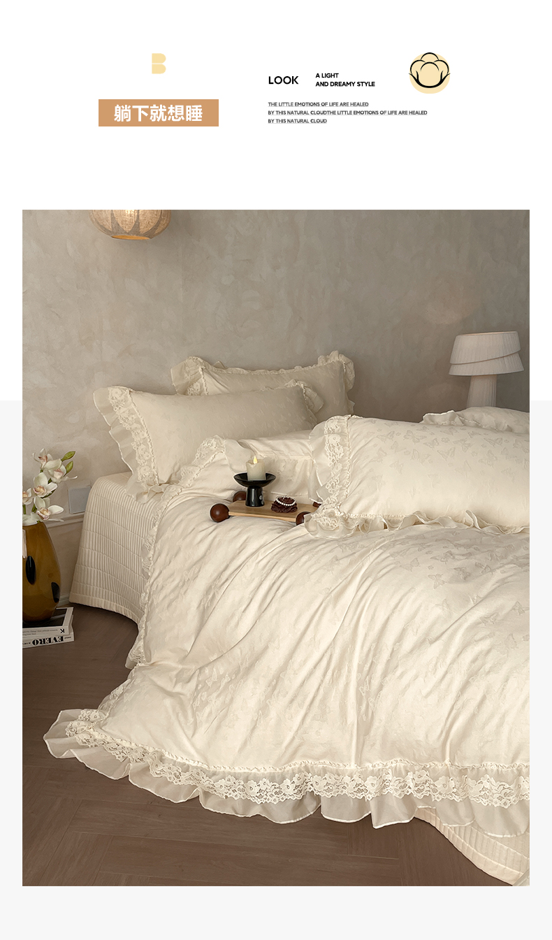 > 莱登卡奴 2026新款全棉纯棉A类60S水洗浮雕立体提花花边床盖款四件套-温馨系列 蝶音之舞奶昔白