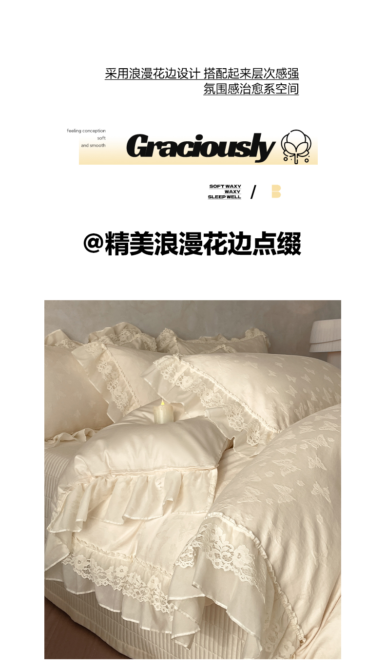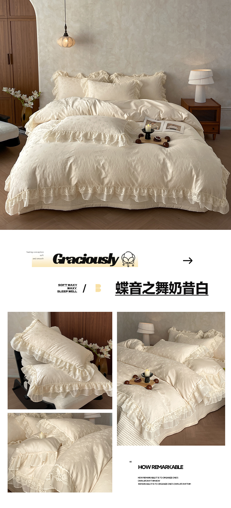 莱登卡奴 2026新款全棉纯棉A类60S水洗浮雕立体提花花边床盖款四件套-温馨系列 蝶音之舞奶昔白