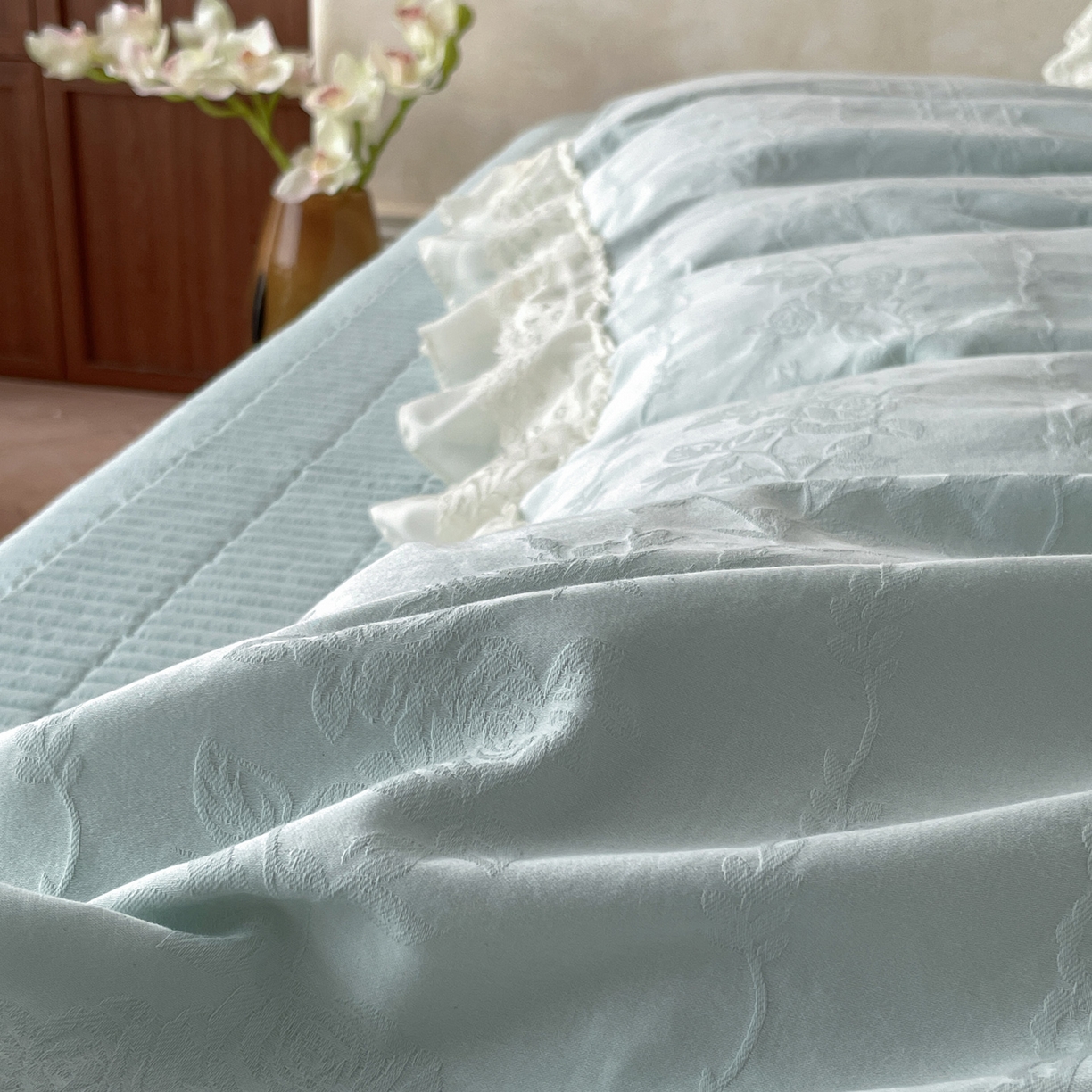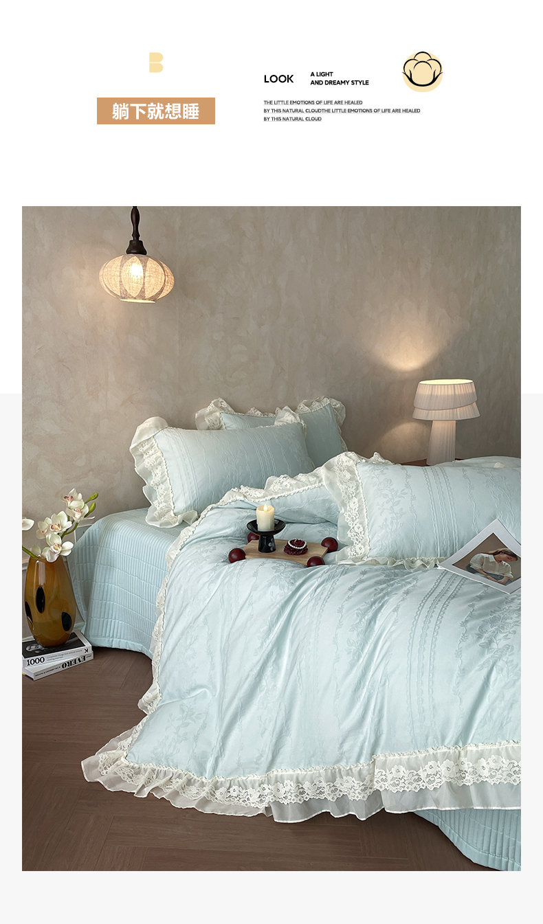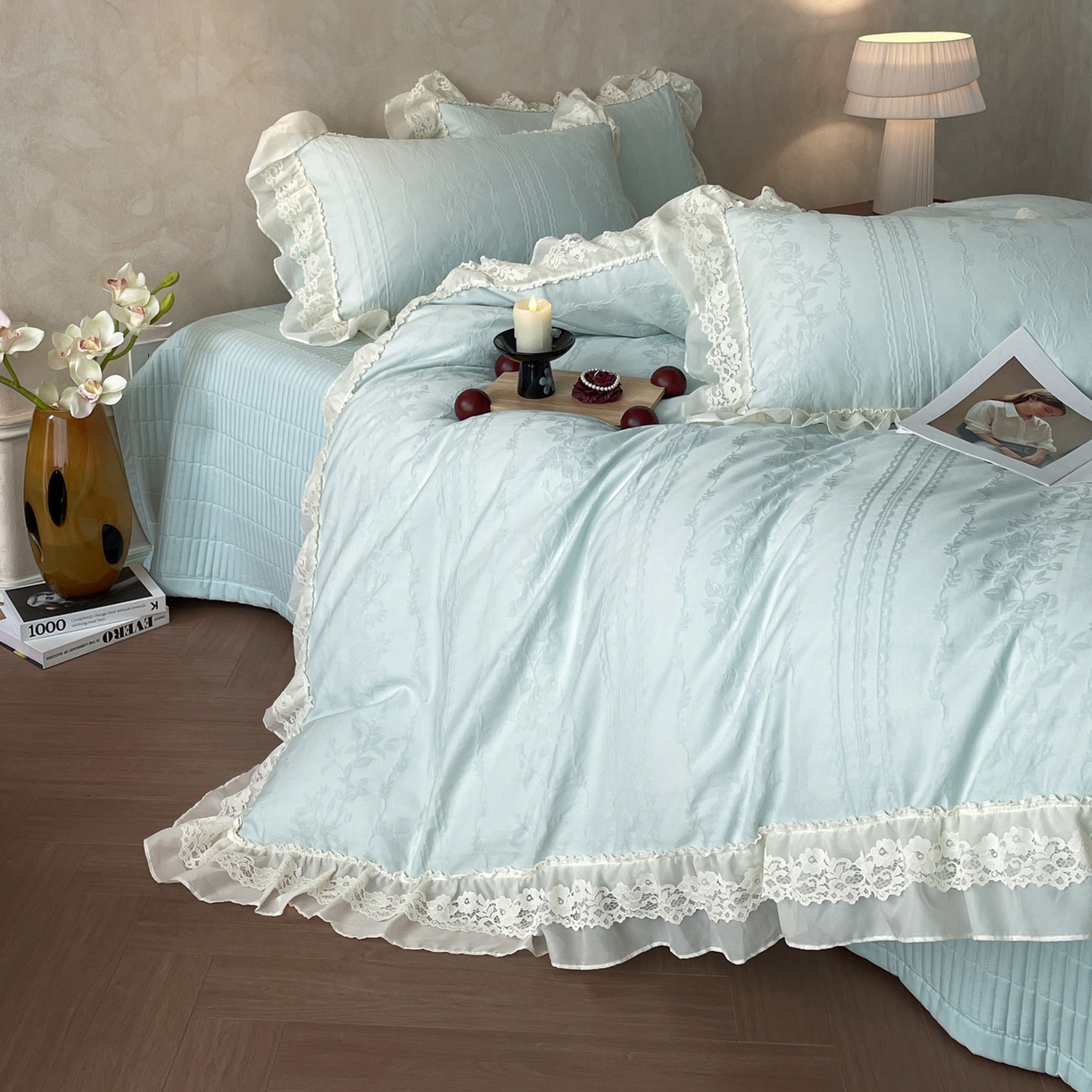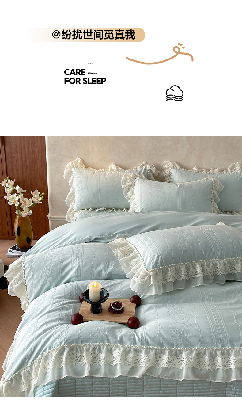 > 莱登卡奴 2026新款全棉纯棉A类60S水洗浮雕立体提花花边床盖款四件套-温馨系列 花漾甜心绿