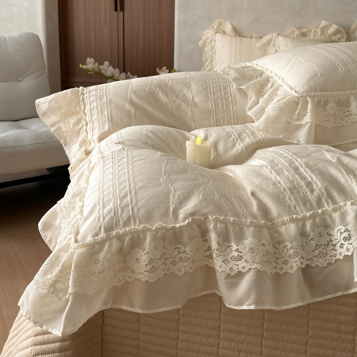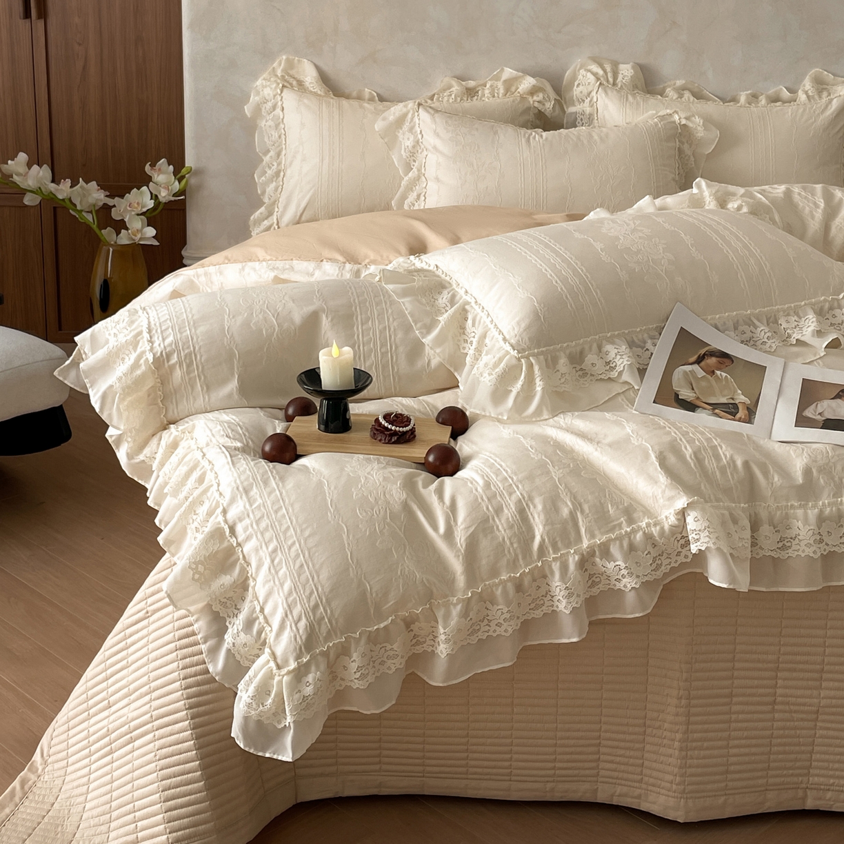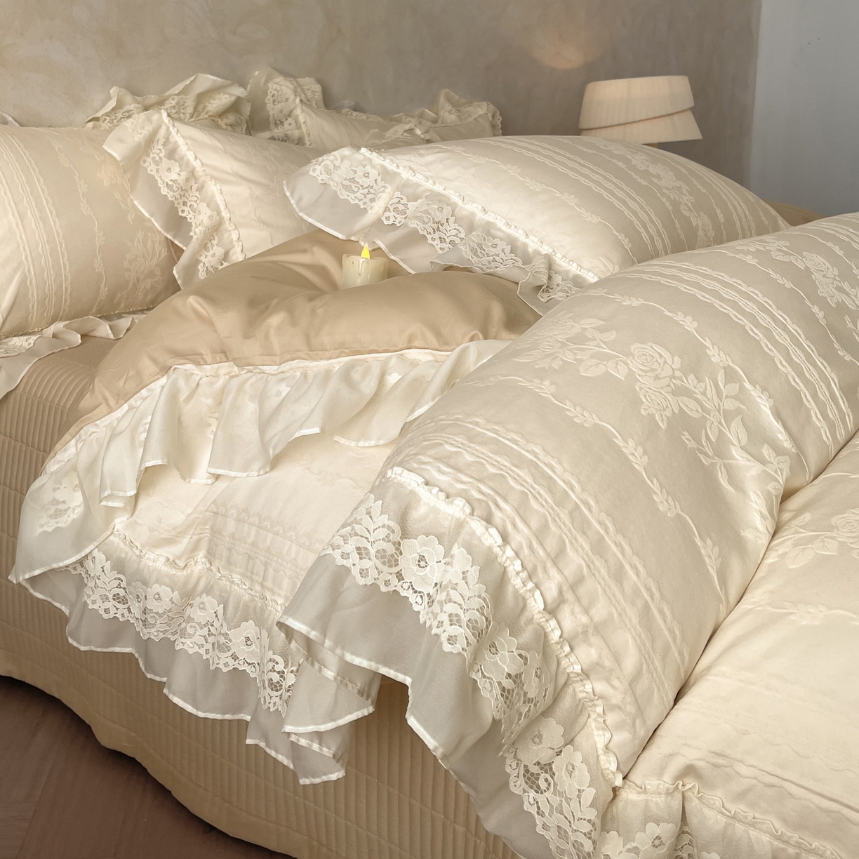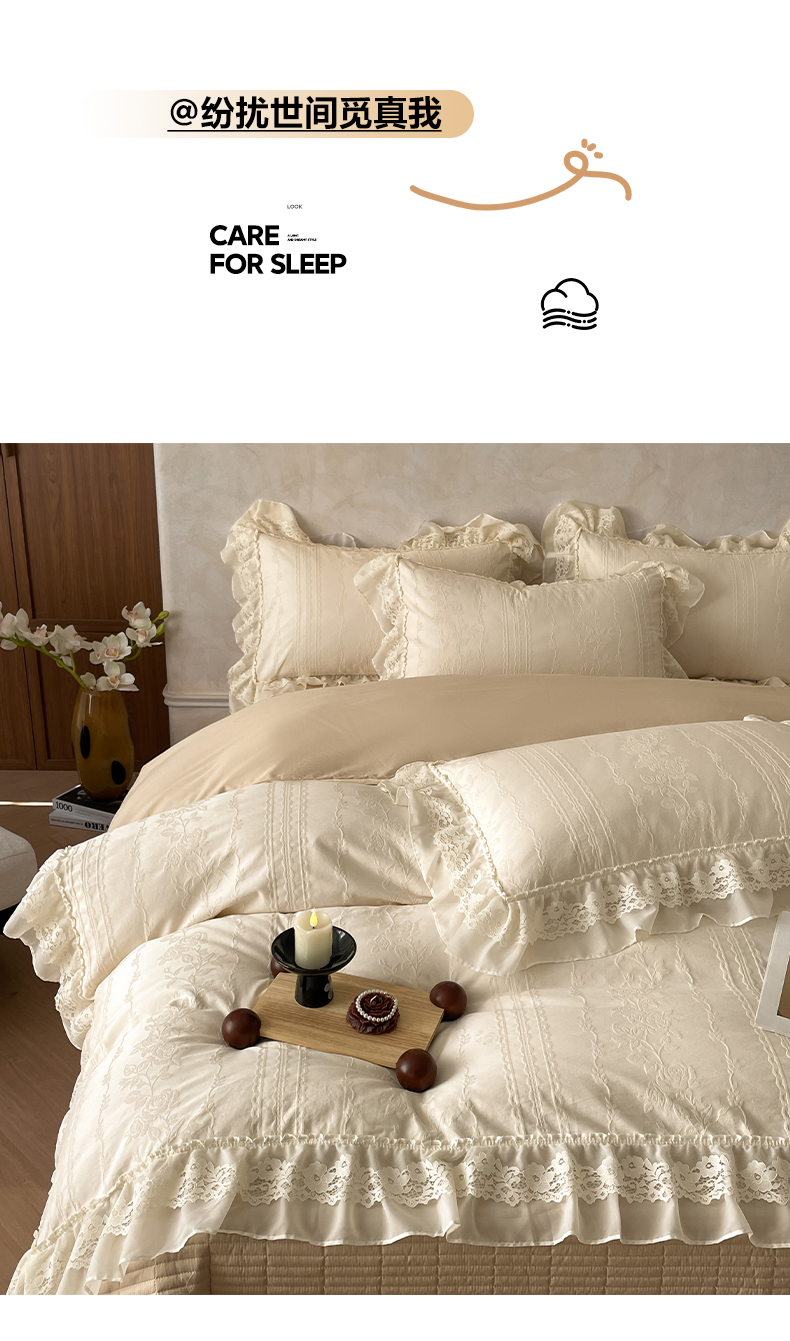 > 莱登卡奴 2026新款全棉纯棉A类60S水洗浮雕立体提花花边床盖款四件套-温馨系列 花漾甜心米杏