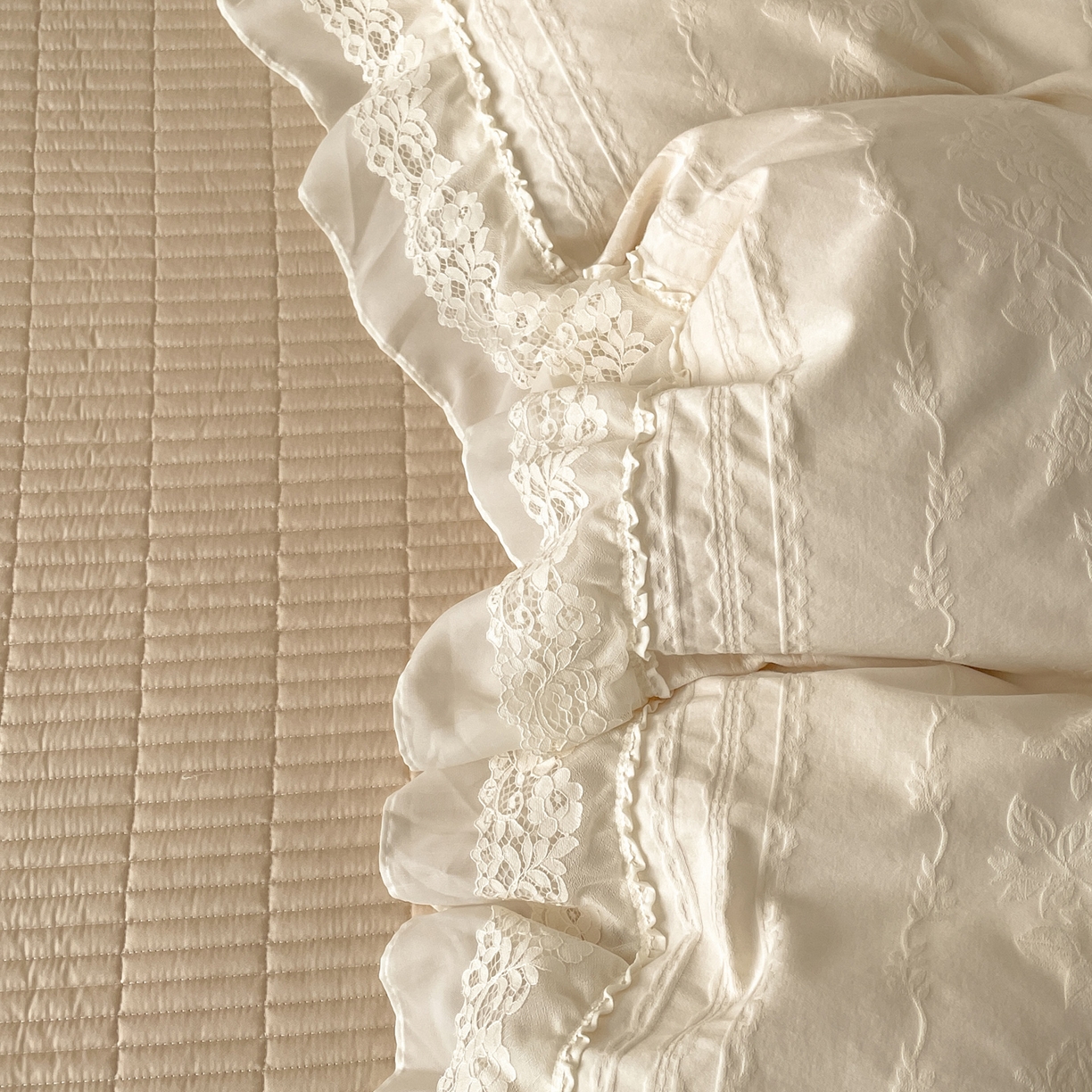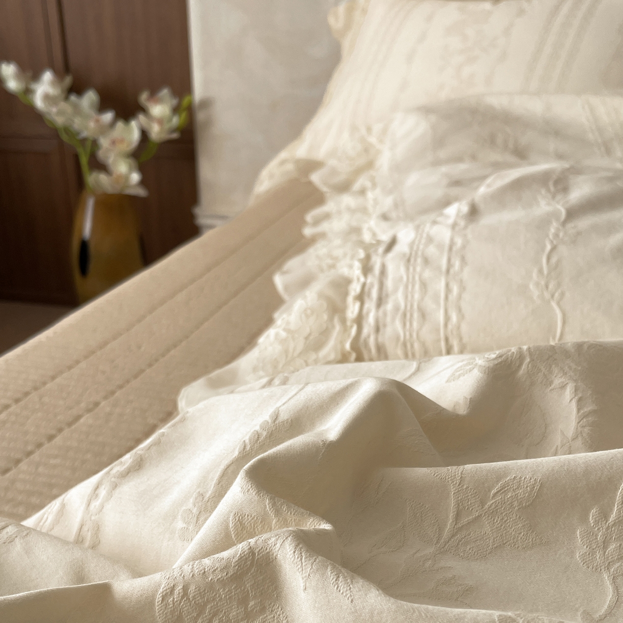 莱登卡奴 2026新款全棉纯棉A类60S水洗浮雕立体提花花边床盖款四件套-温馨系列 花漾甜心米杏