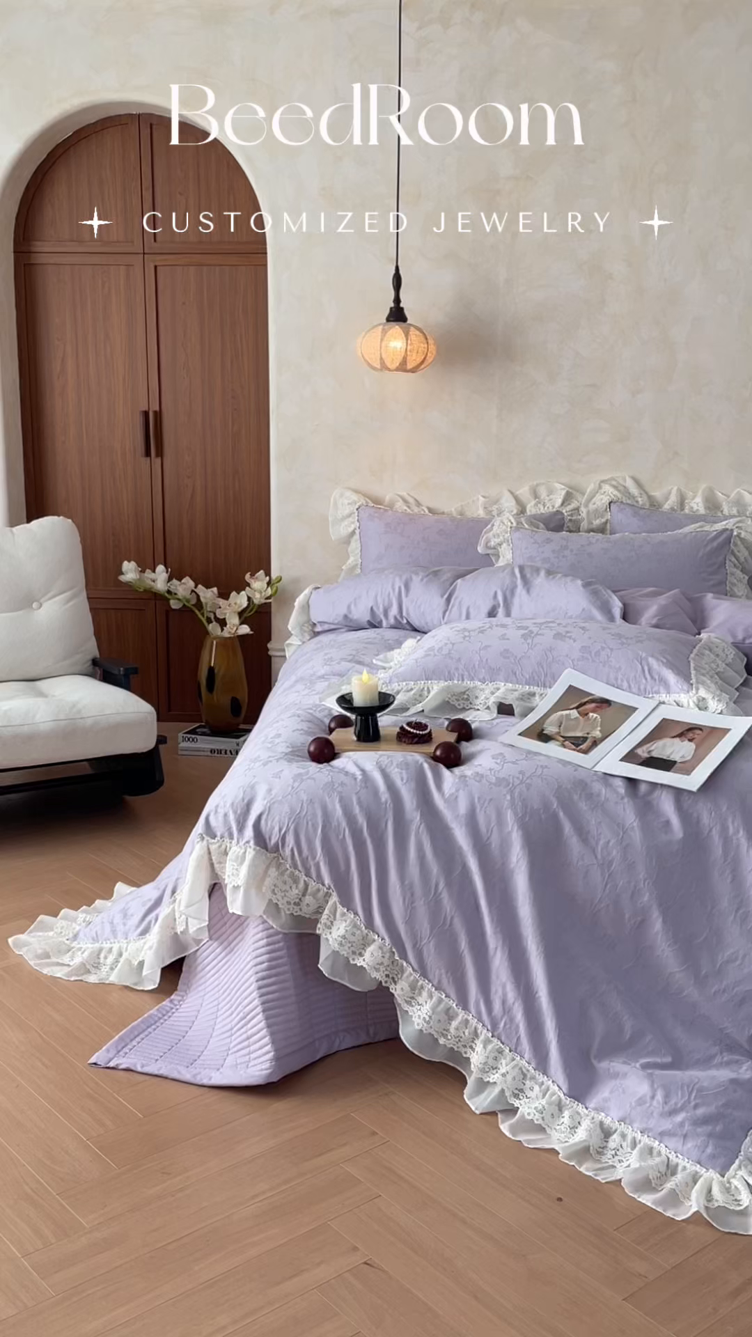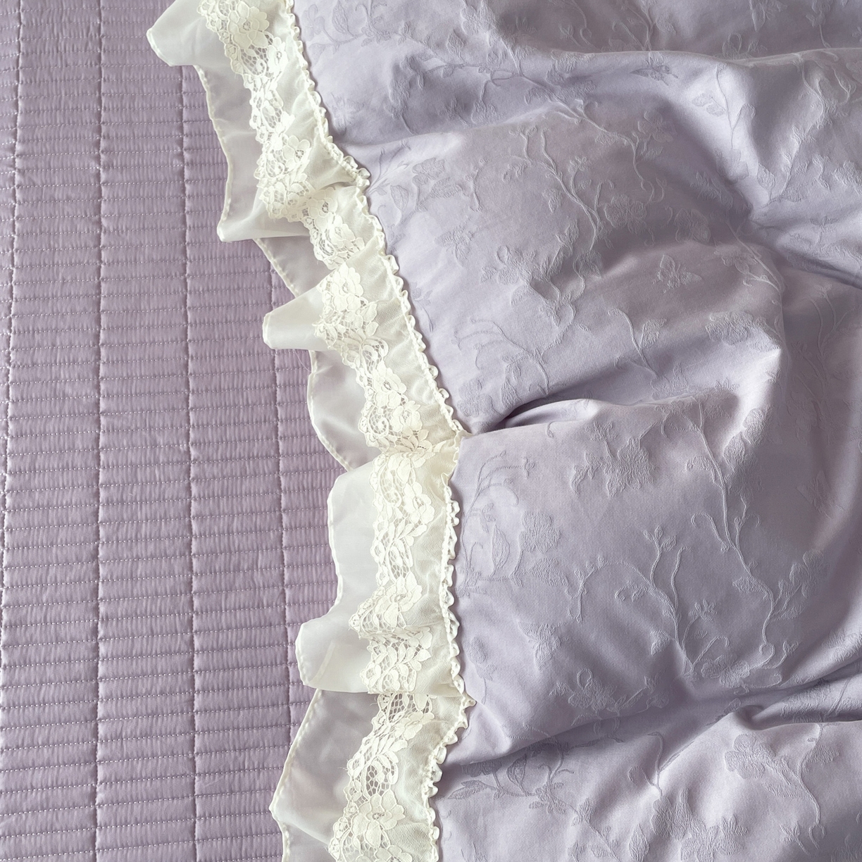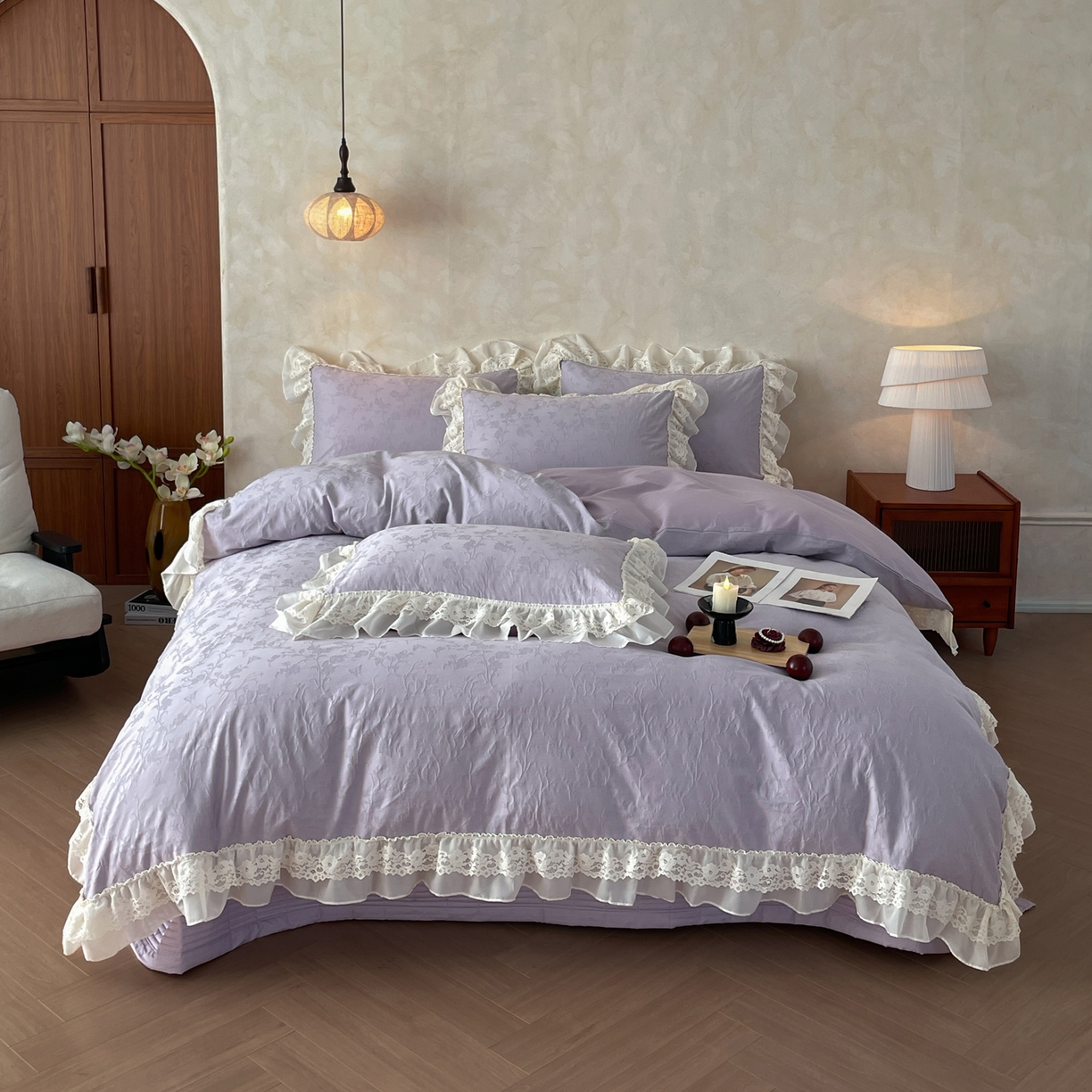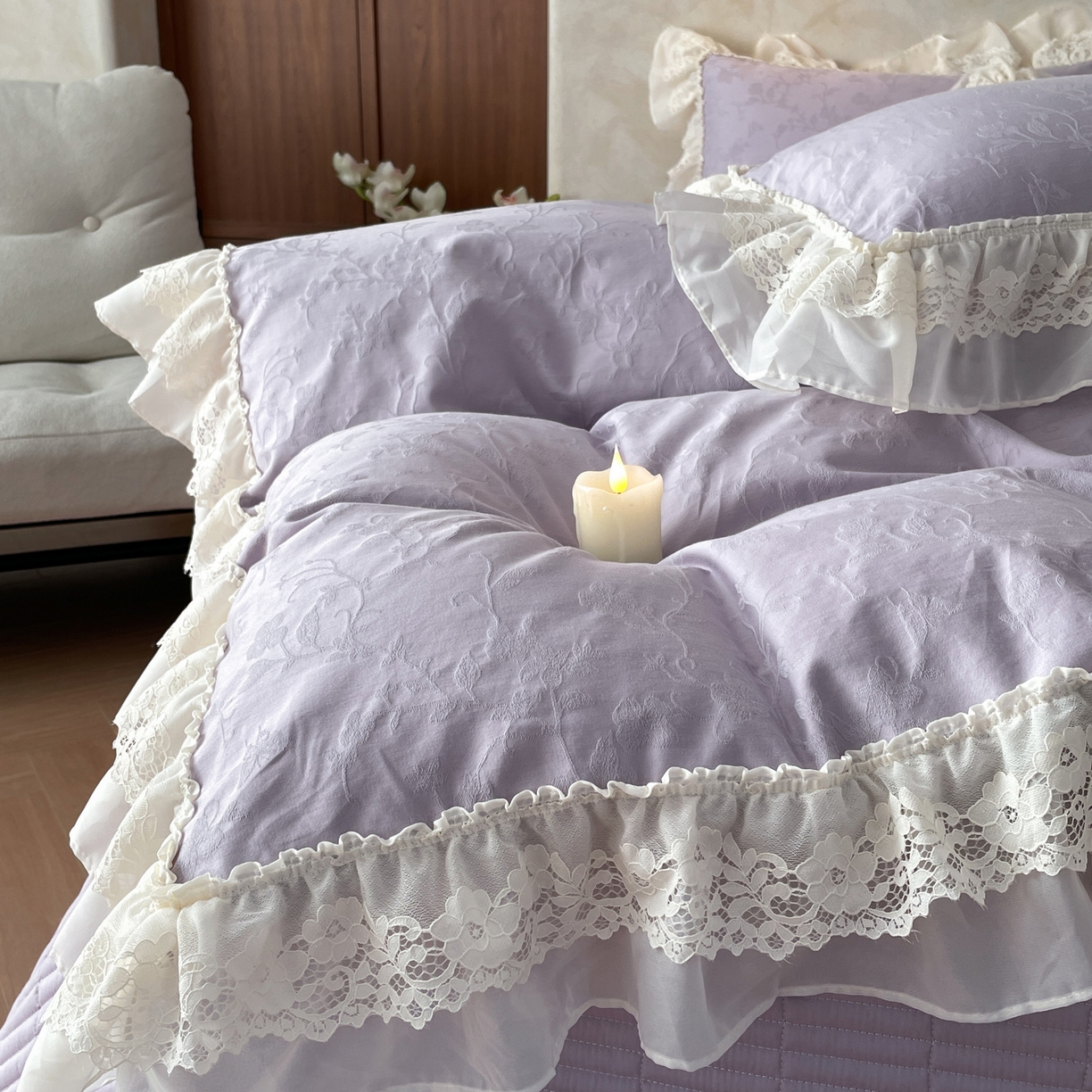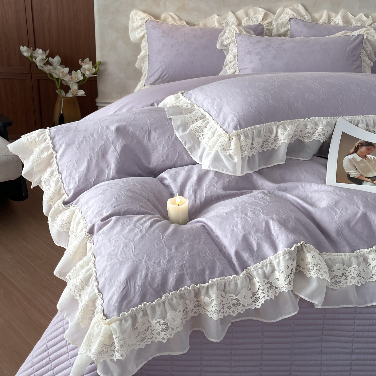 > 莱登卡奴 2026新款全棉纯棉A类60S水洗浮雕立体提花花边床盖款四件套-温馨系列 露柯紫