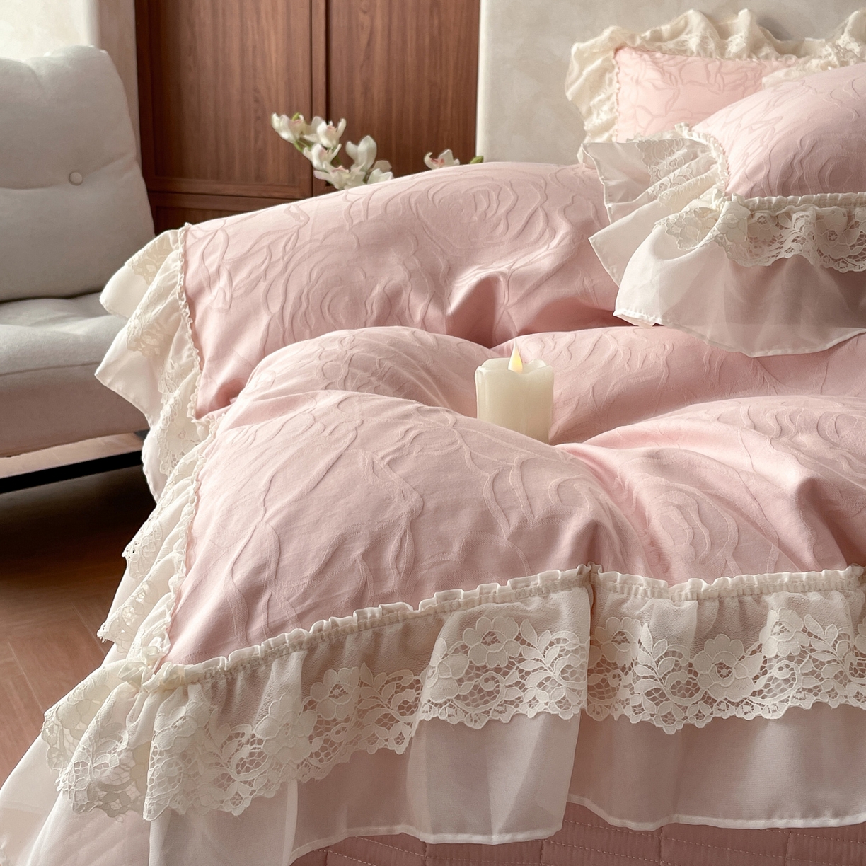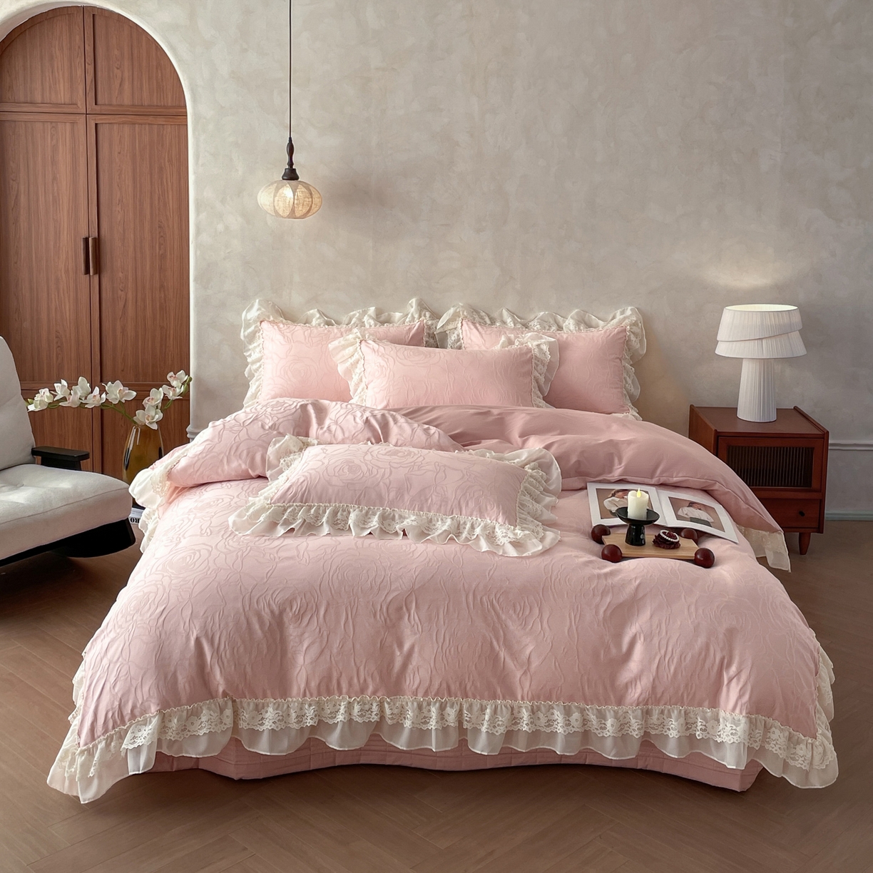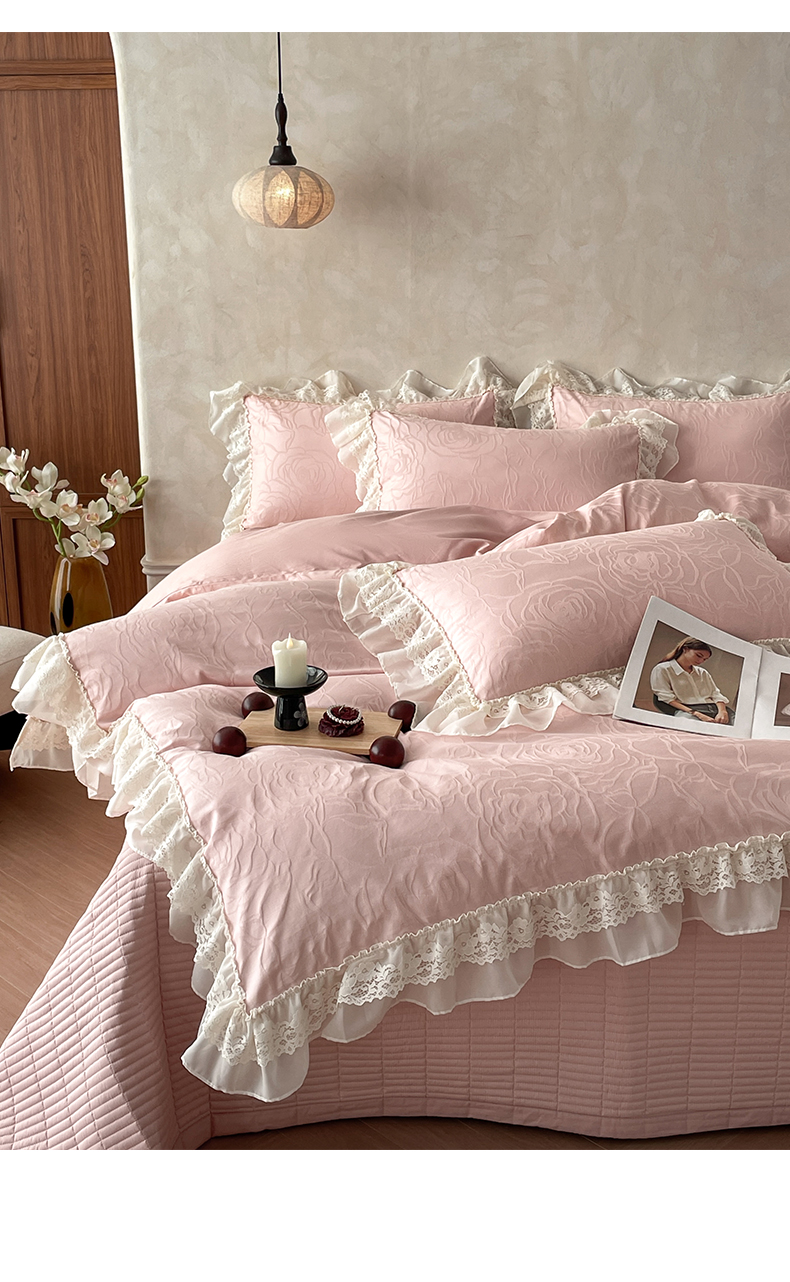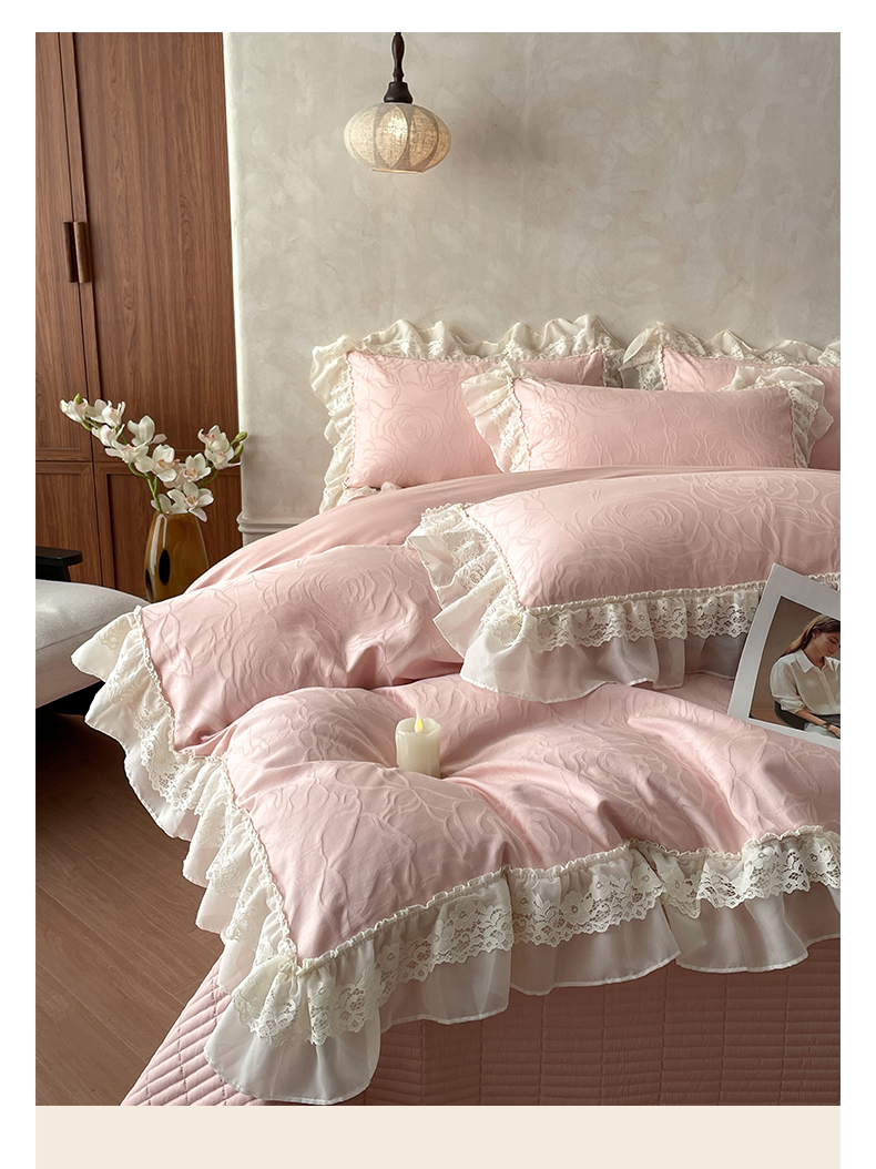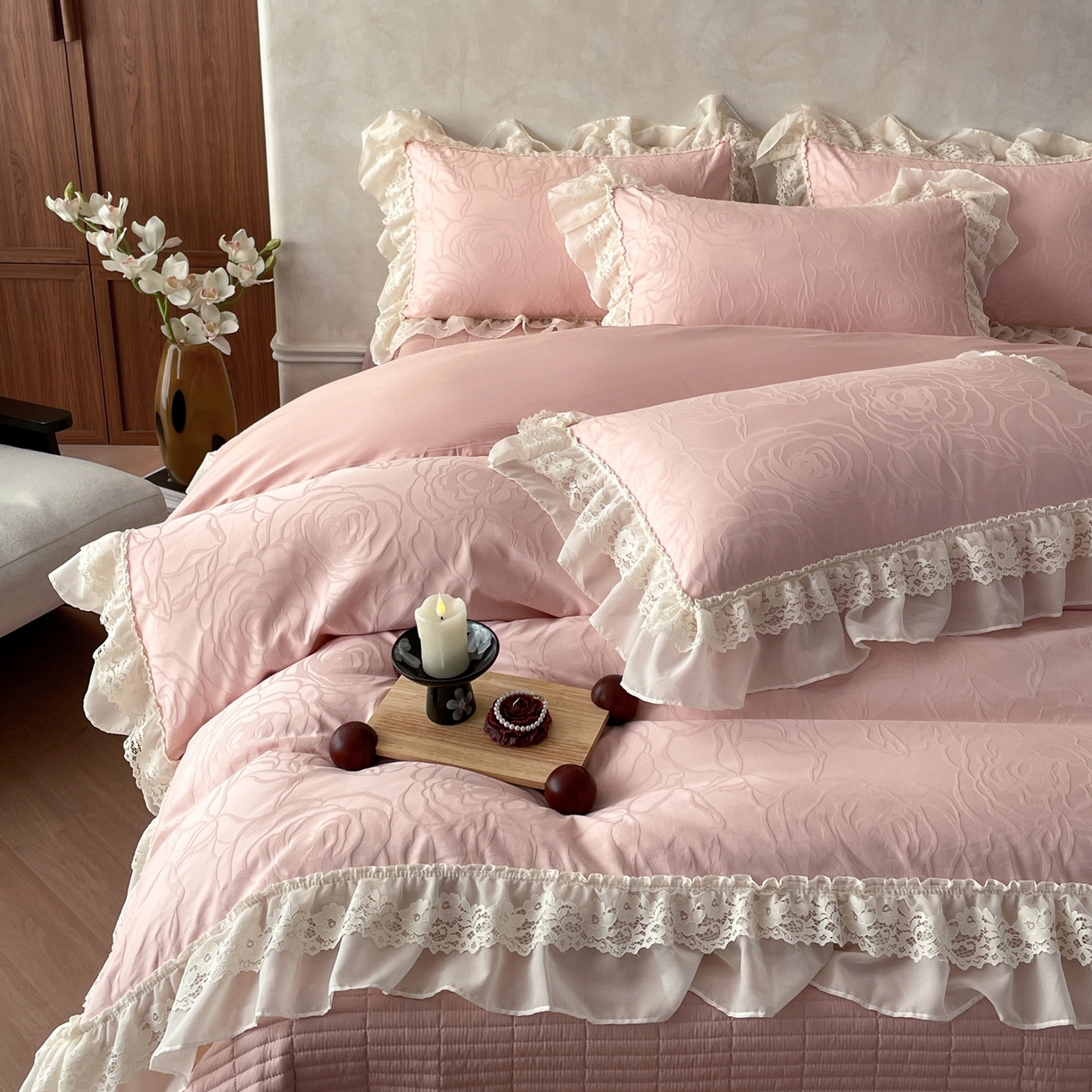 > 莱登卡奴 2026新款全棉纯棉A类60S水洗浮雕立体提花花边床盖款四件套-温馨系列 玫香浓粉