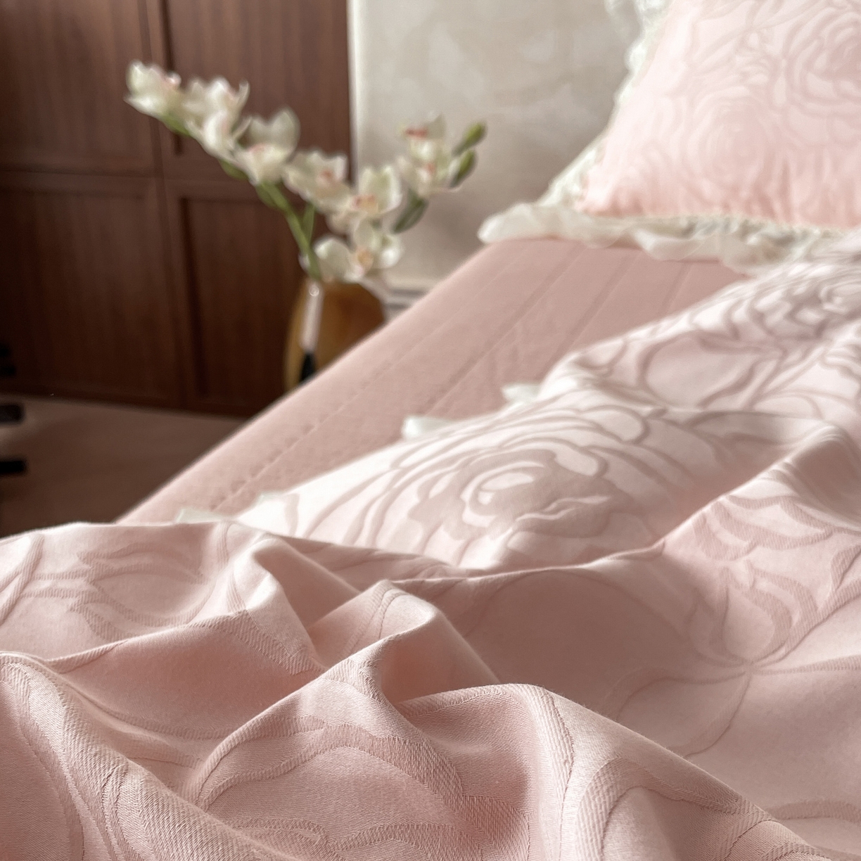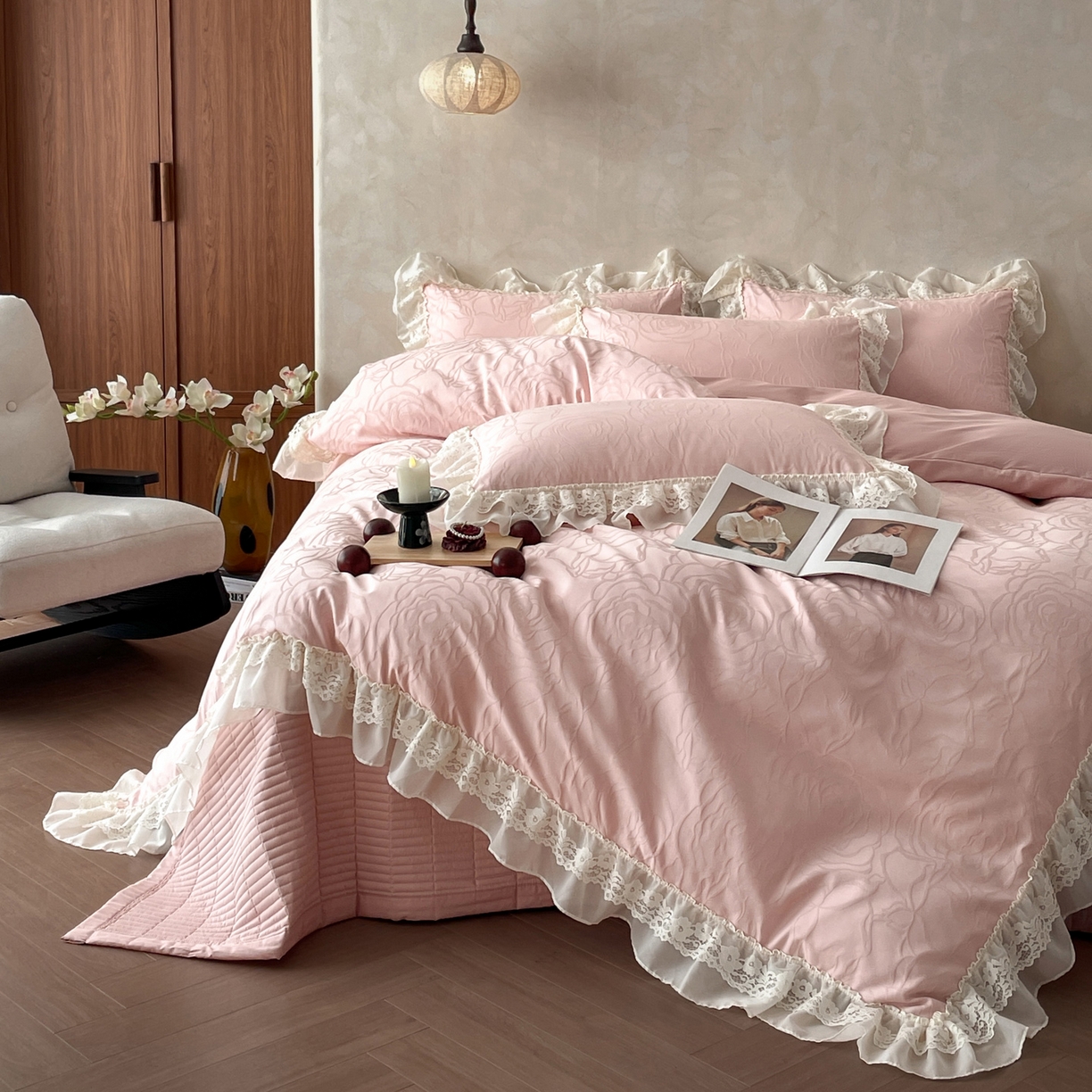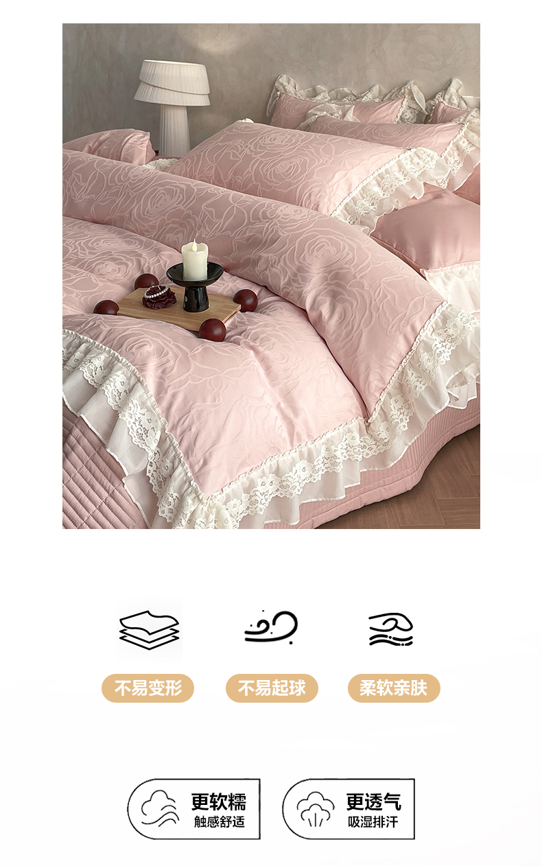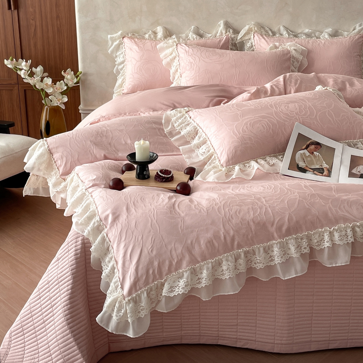 > 莱登卡奴 2026新款全棉纯棉A类60S水洗浮雕立体提花花边床盖款四件套-温馨系列 玫香浓粉
