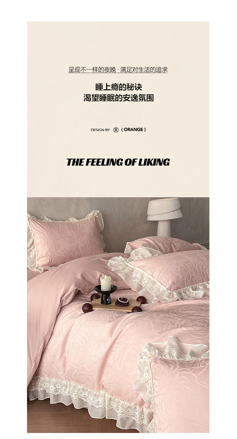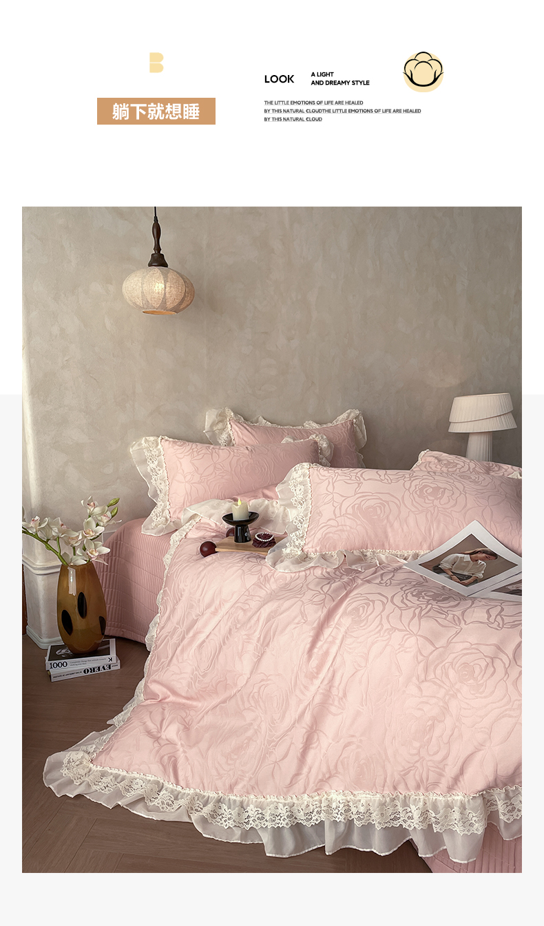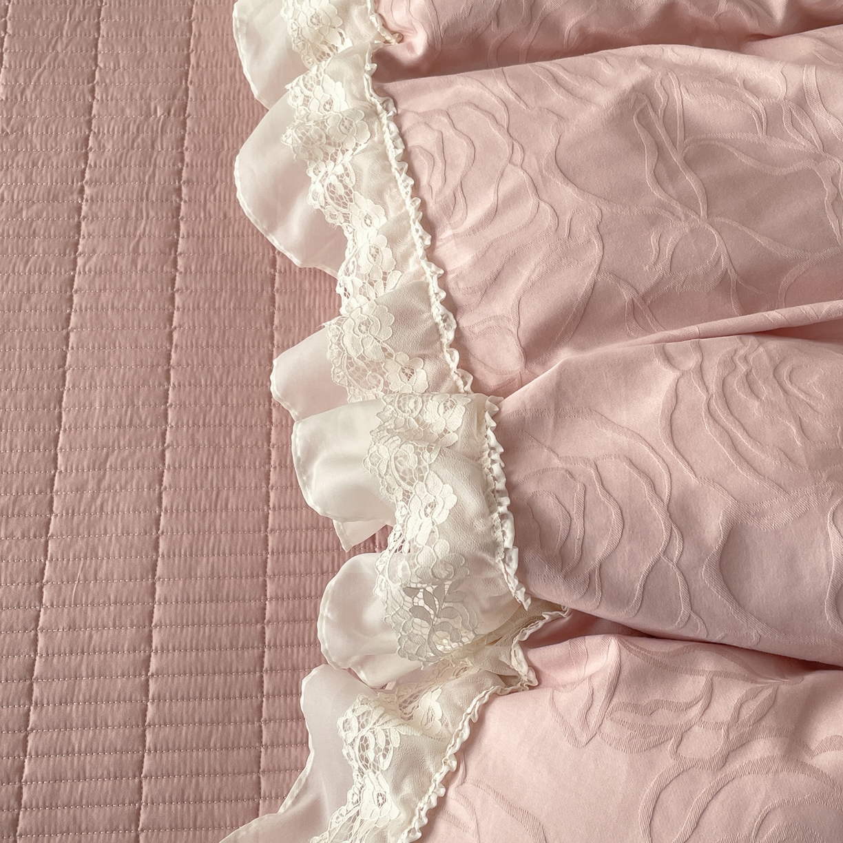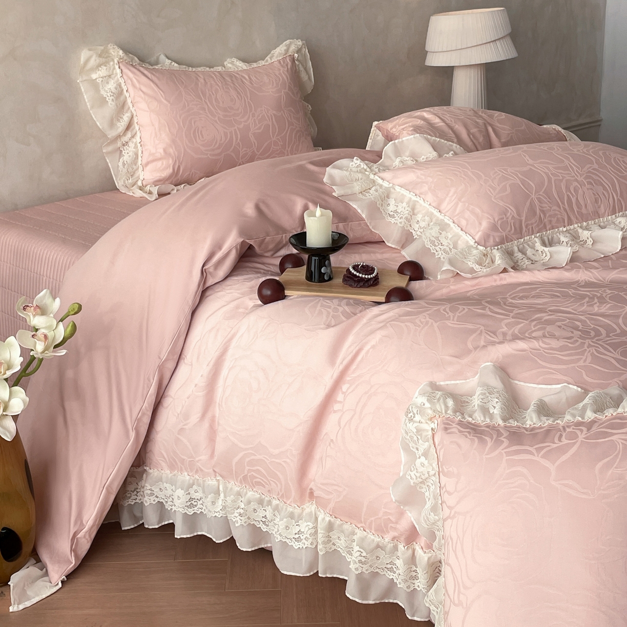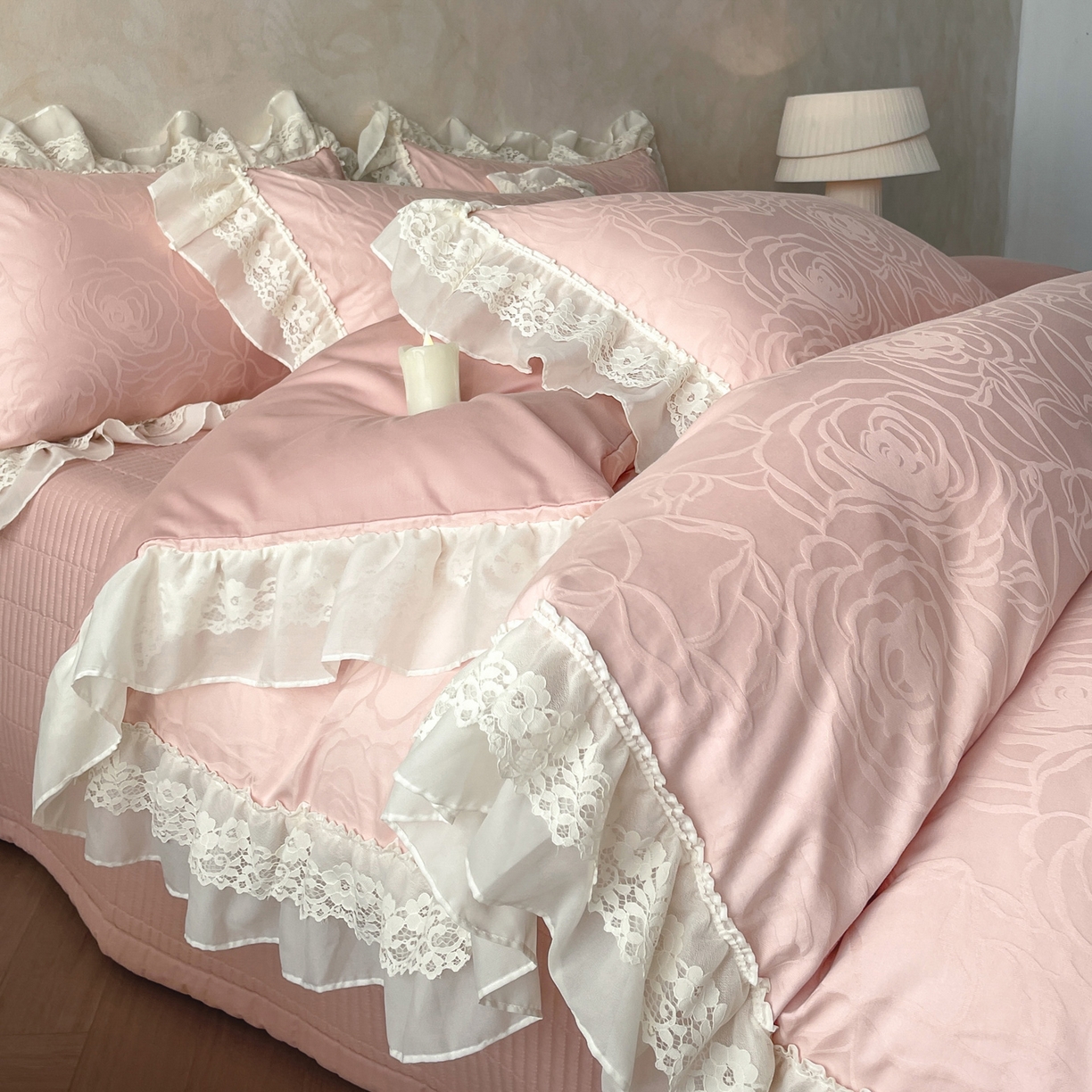 > 莱登卡奴 2026新款全棉纯棉A类60S水洗浮雕立体提花花边床盖款四件套-温馨系列 玫香浓粉