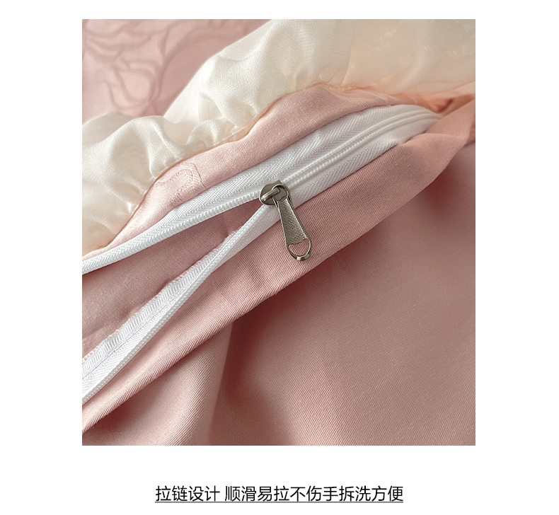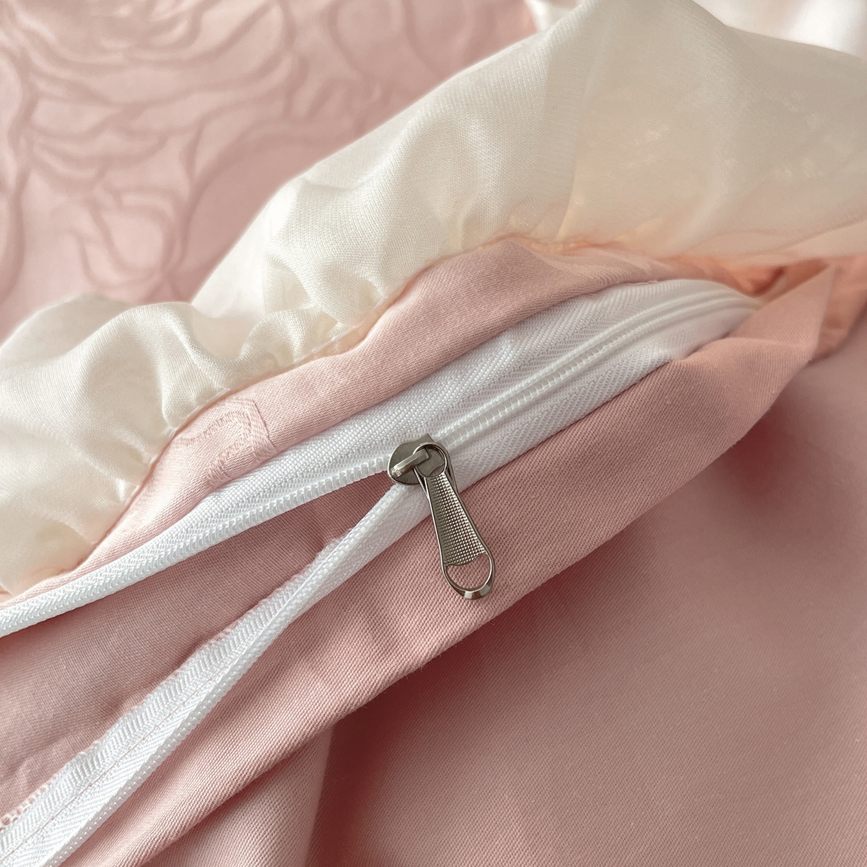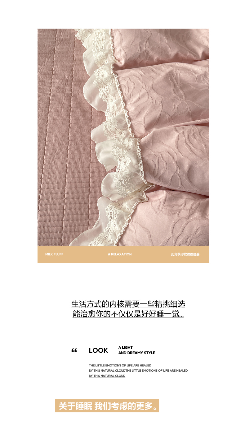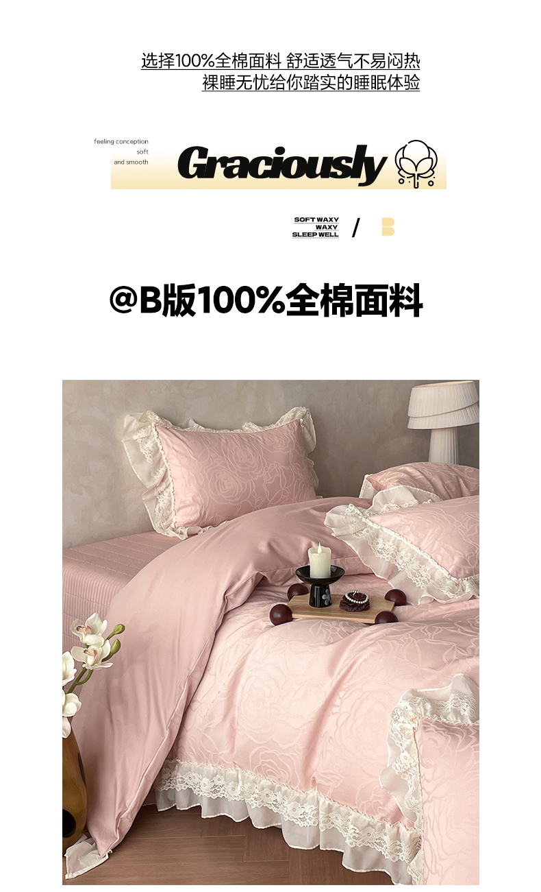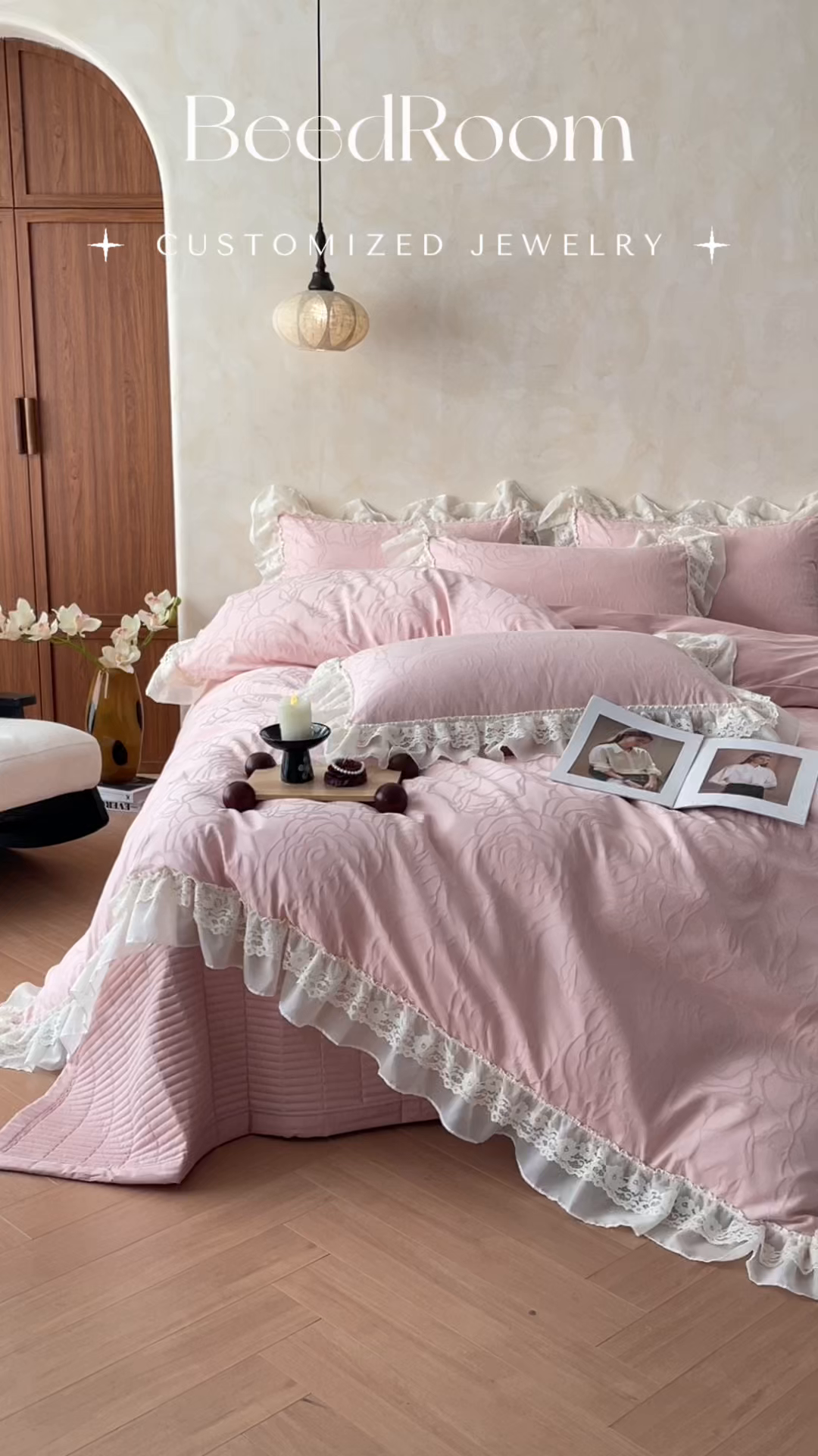 > 莱登卡奴 2026新款全棉纯棉A类60S水洗浮雕立体提花花边床盖款四件套-温馨系列 玫香浓粉