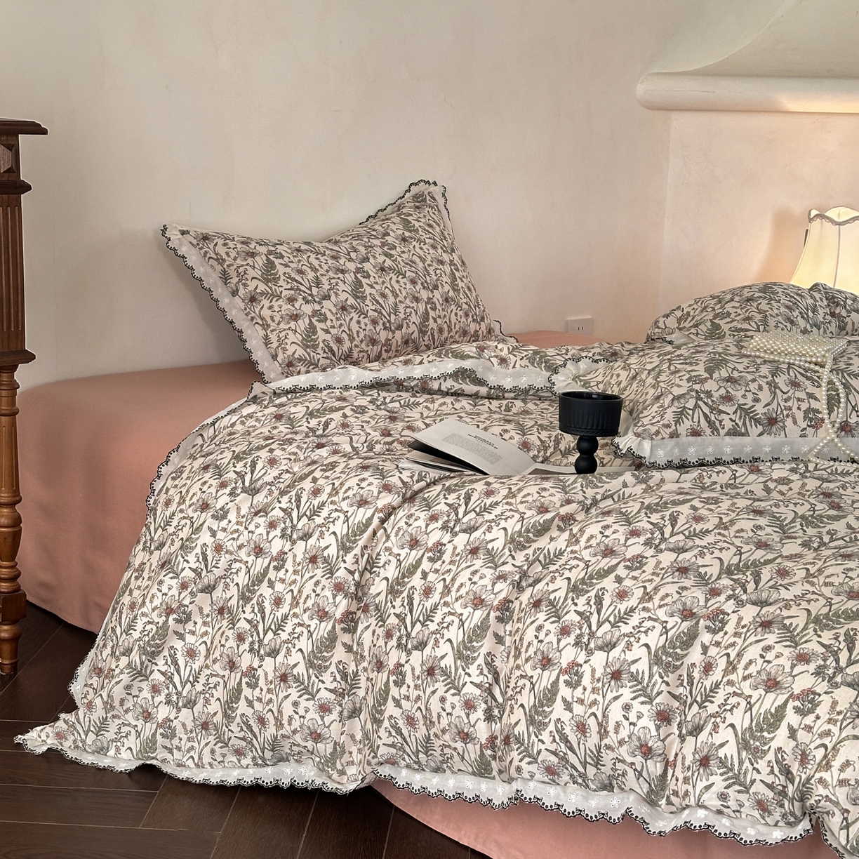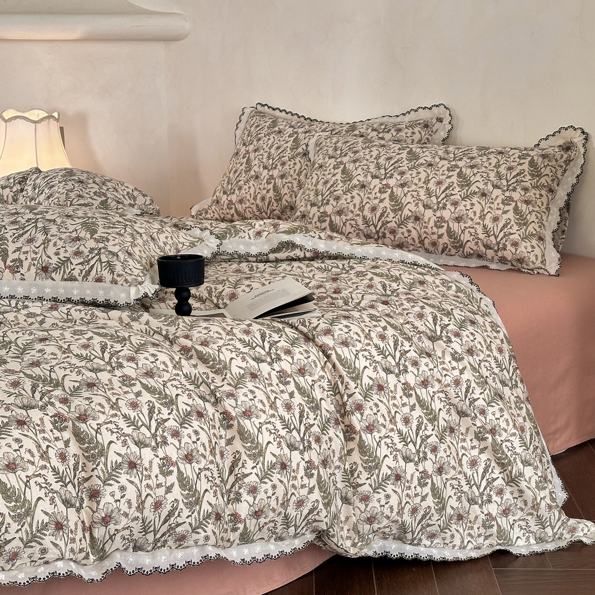 > 莱登卡奴 2026新款A类水洗棉麻复古花边麻棉四件套 初夕粉