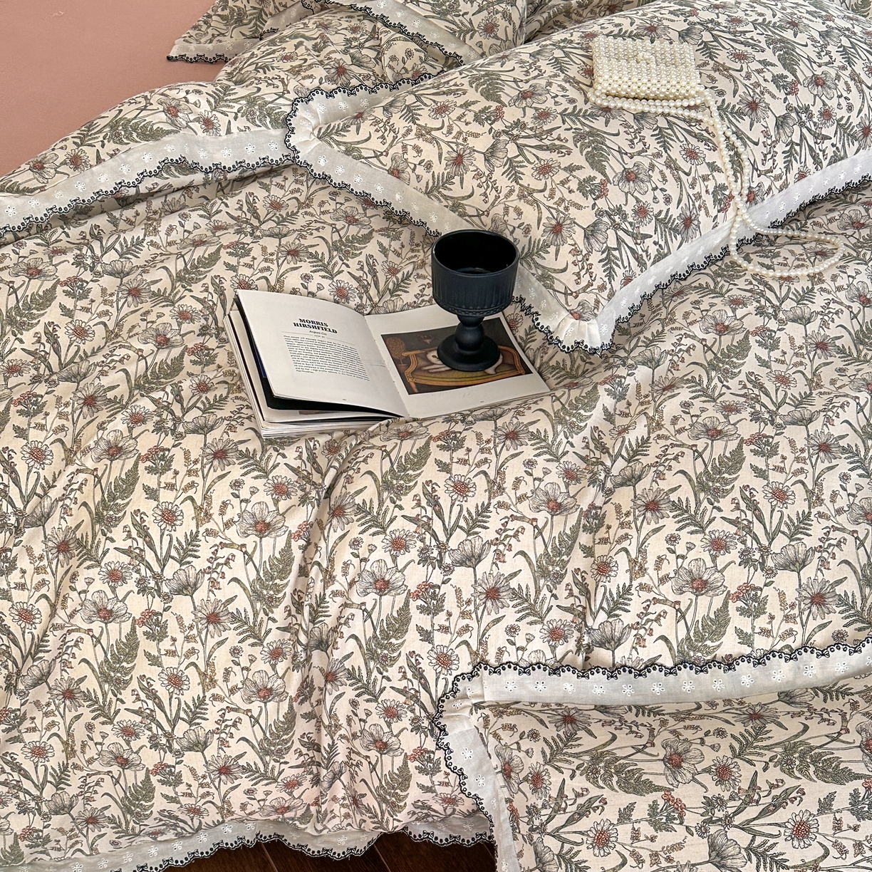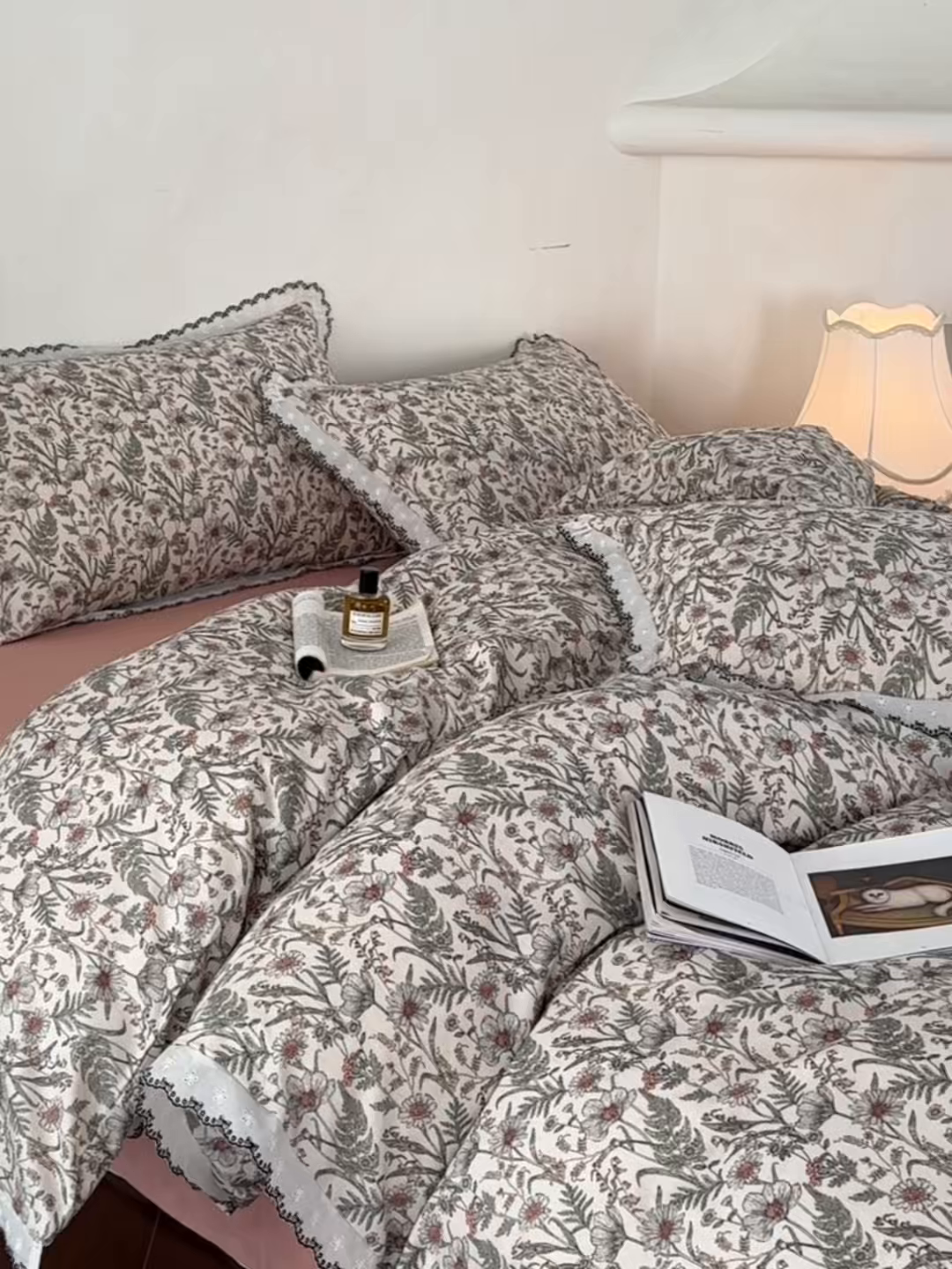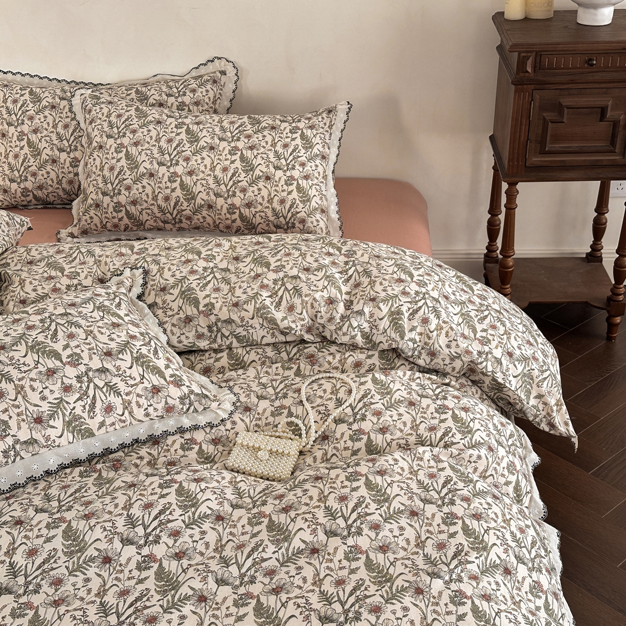 2026新款A类棉麻数码印花25%麻75%棉法式复古花边四件套