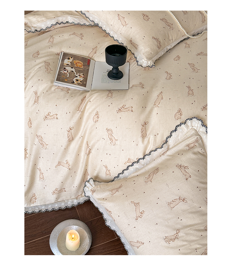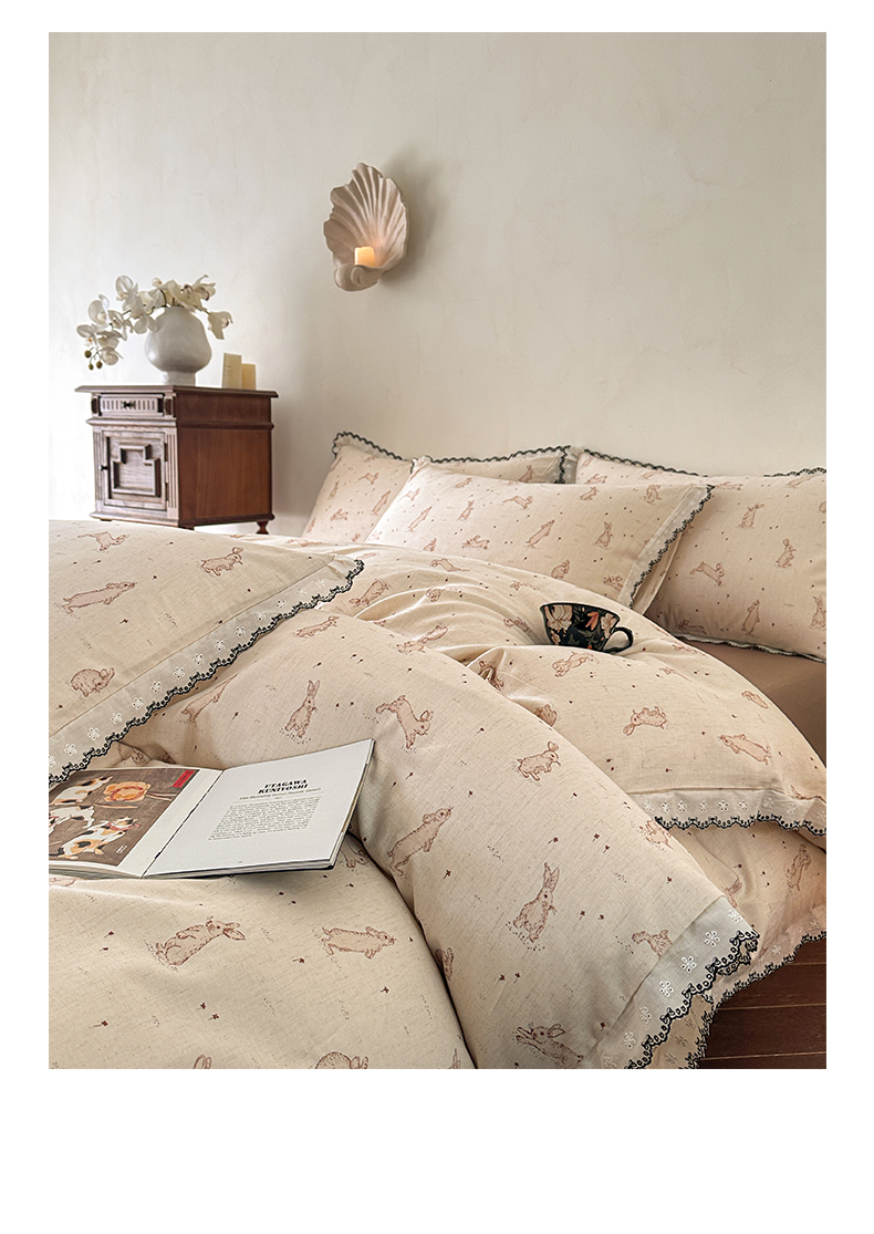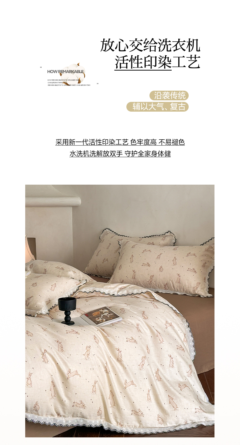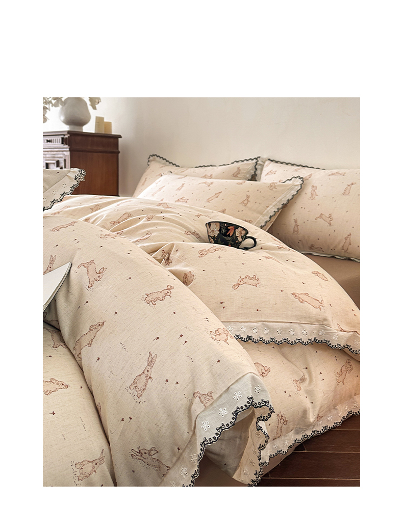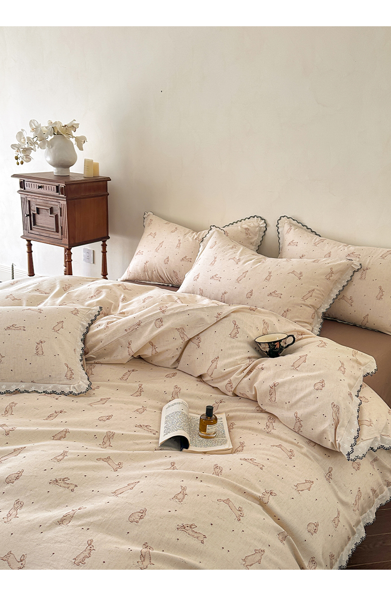 莱登卡奴 2026新款A类水洗棉麻复古花边麻棉四件套 欢乐兔
