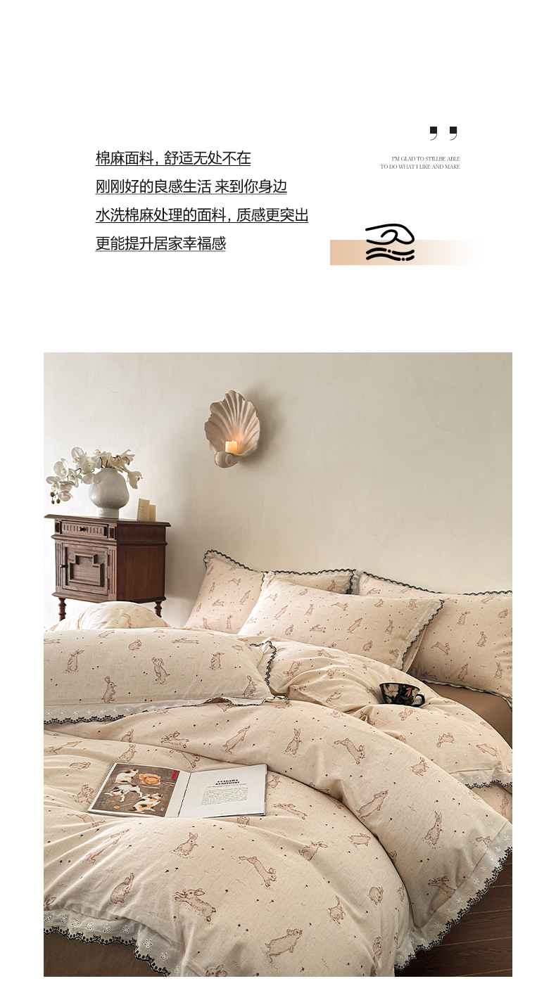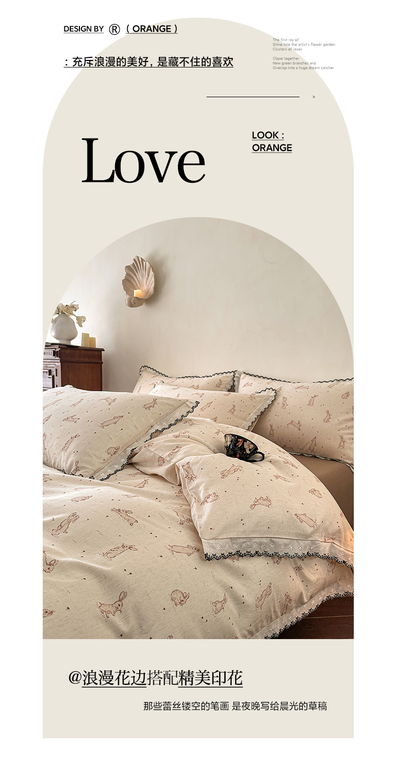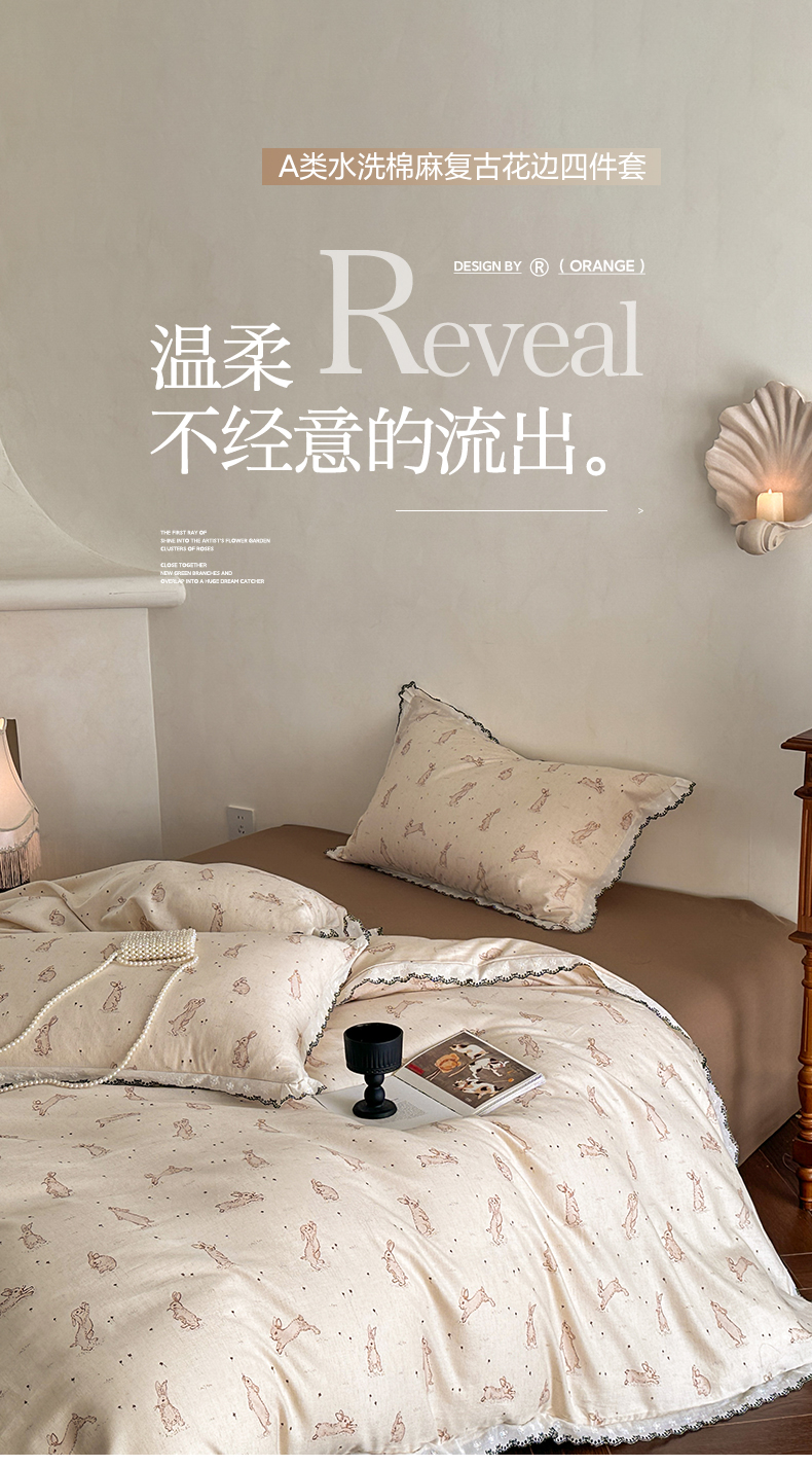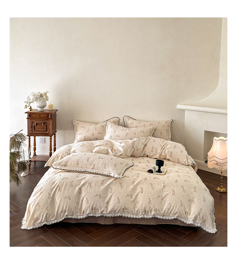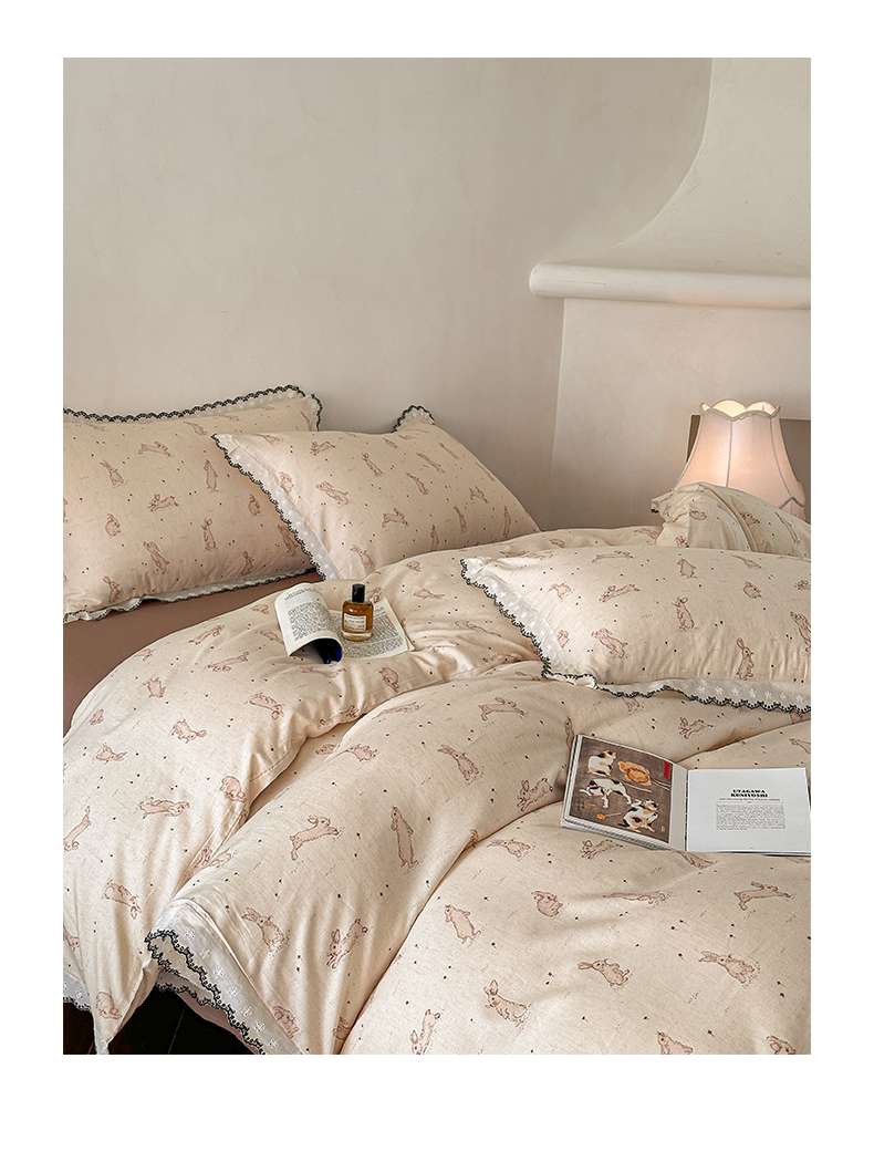 莱登卡奴 2026新款A类水洗棉麻复古花边麻棉四件套 欢乐兔