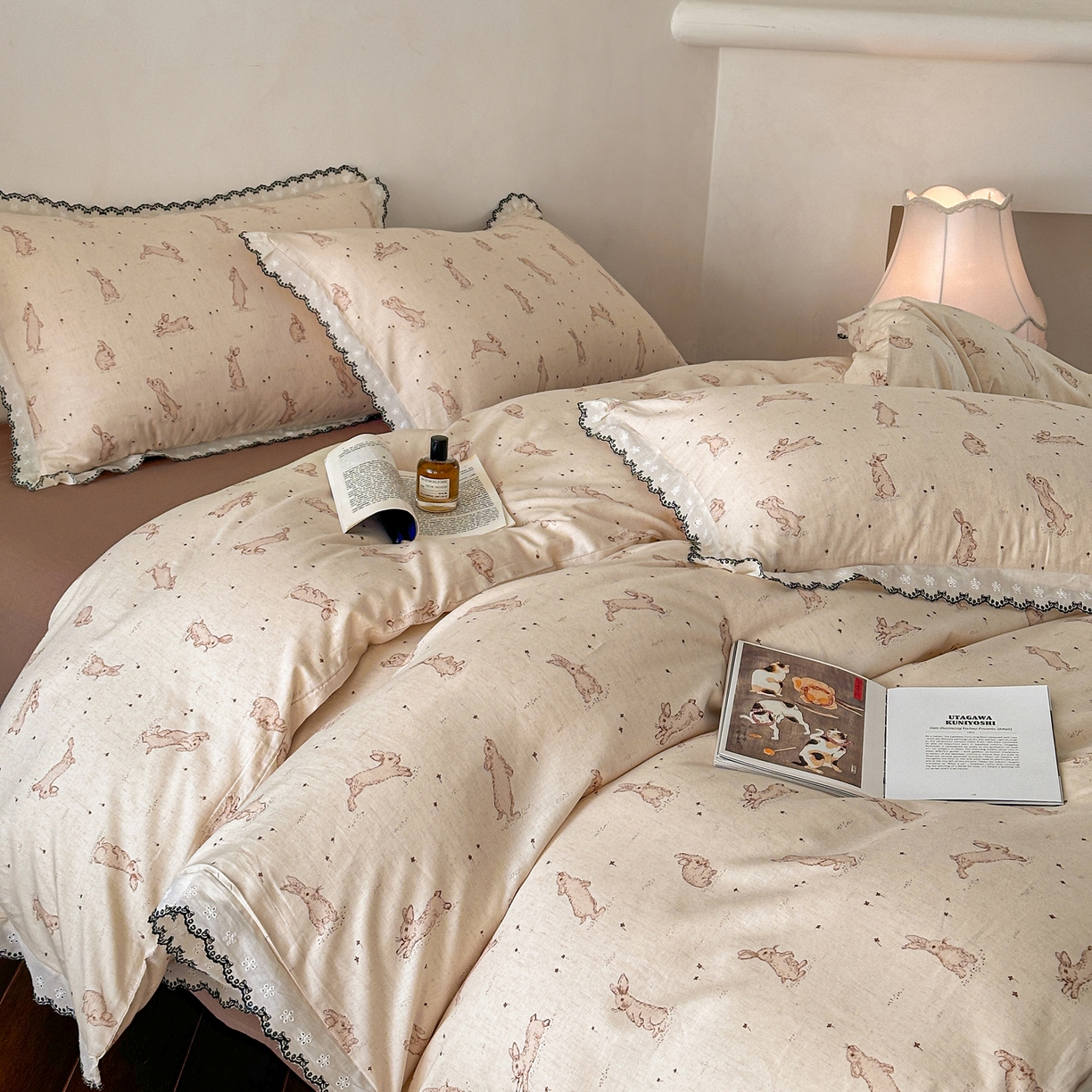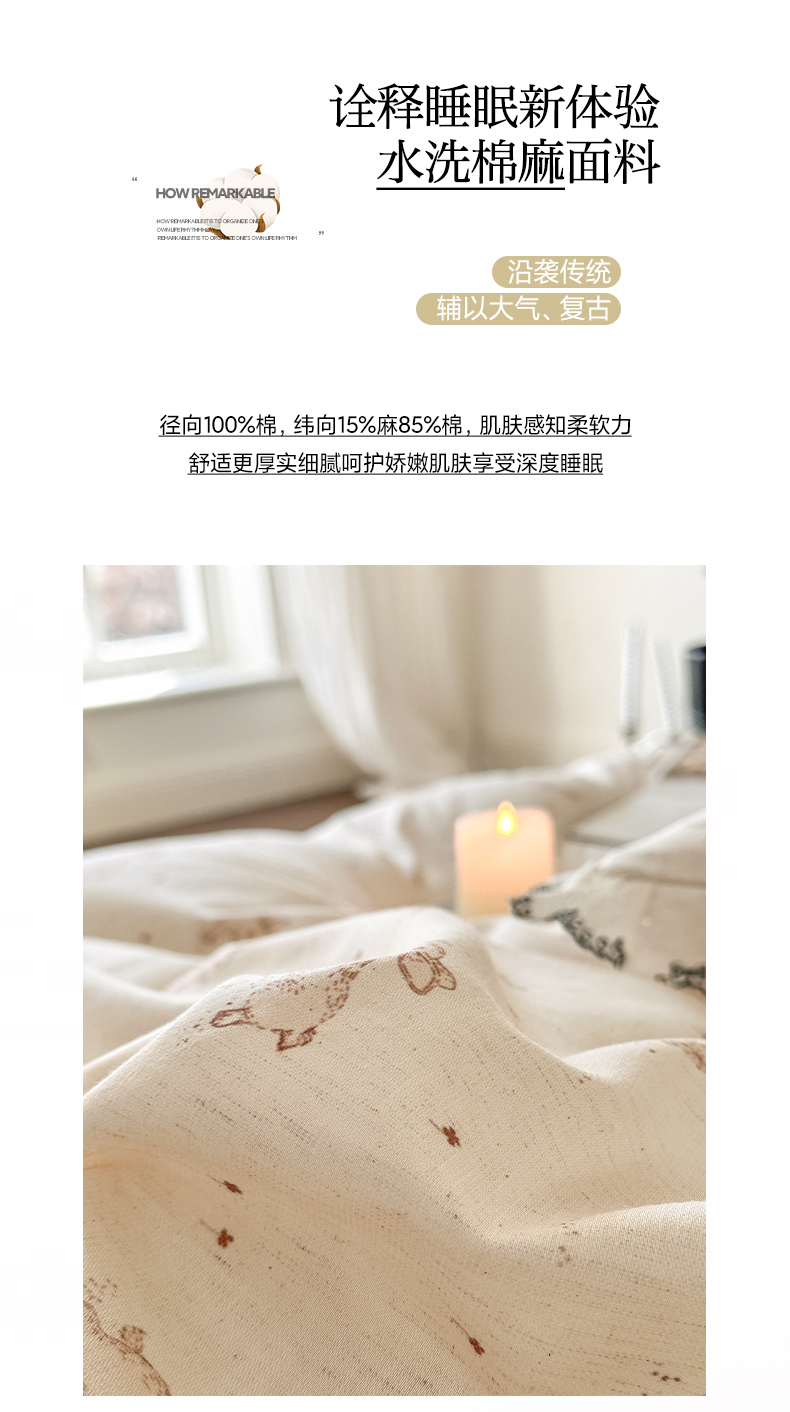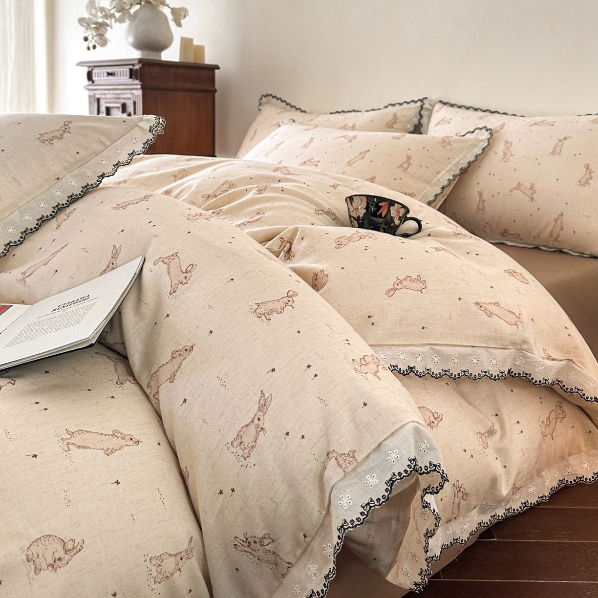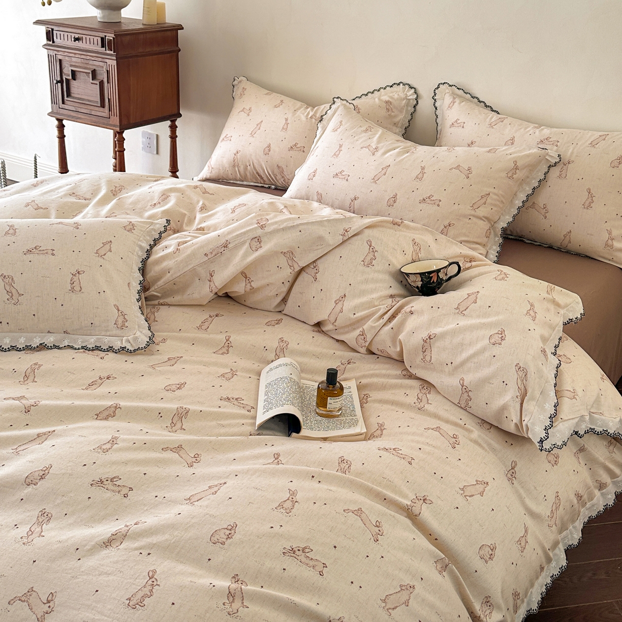 莱登卡奴 2026新款A类水洗棉麻复古花边麻棉四件套 欢乐兔