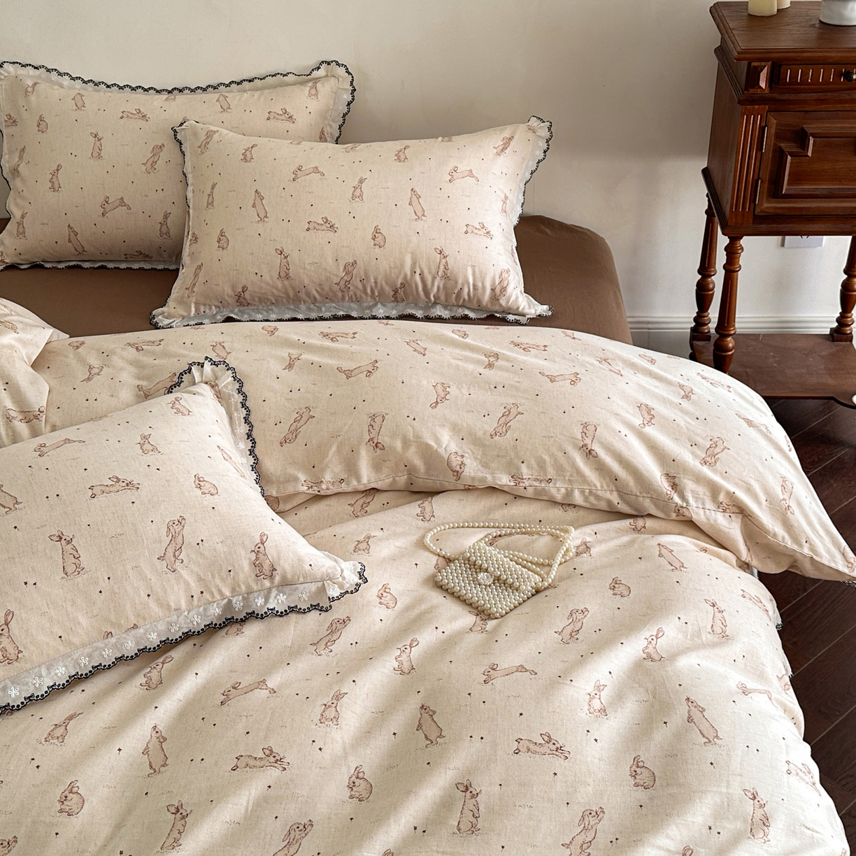 > 莱登卡奴 2026新款A类水洗棉麻复古花边麻棉四件套 欢乐兔