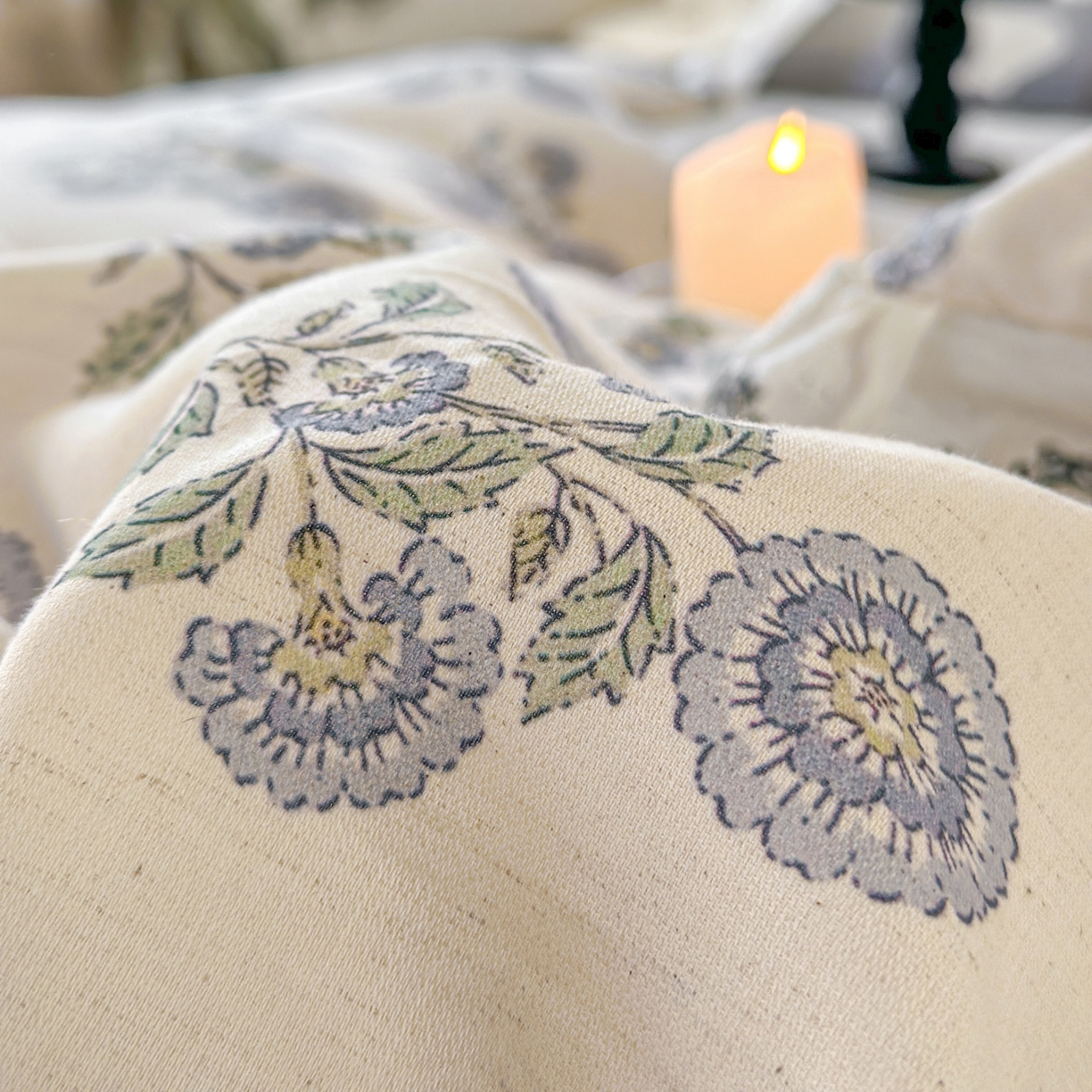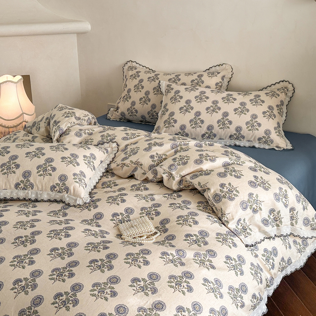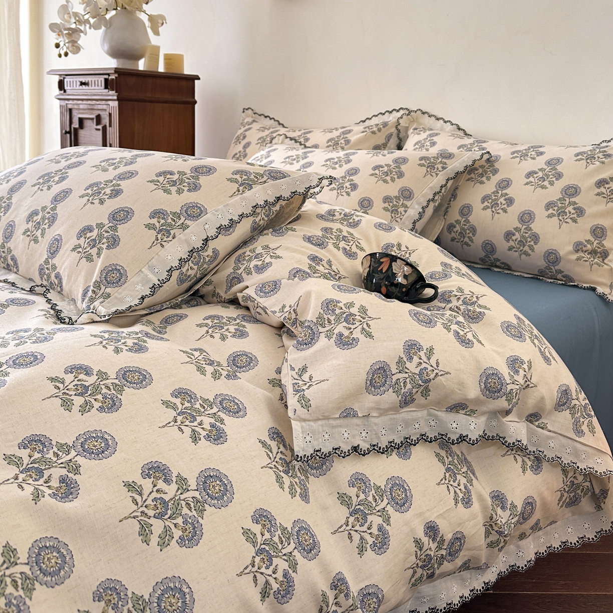> 莱登卡奴 2026新款A类水洗棉麻复古花边麻棉四件套 清澜