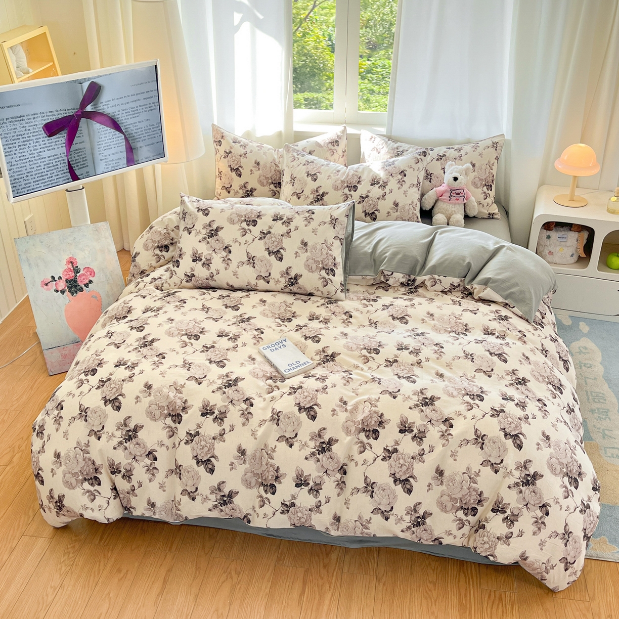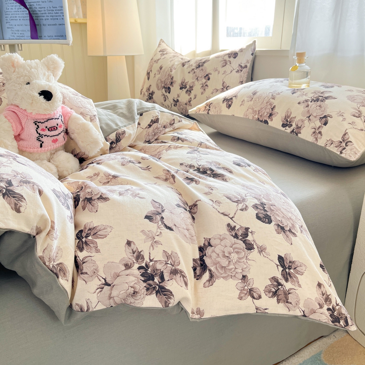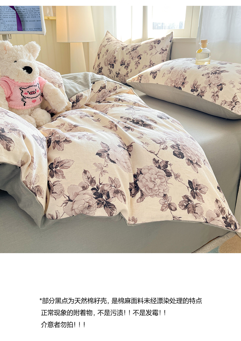 > 莱登卡奴 2026新款A类水洗棉麻小清新印花四件套 墨幽灰