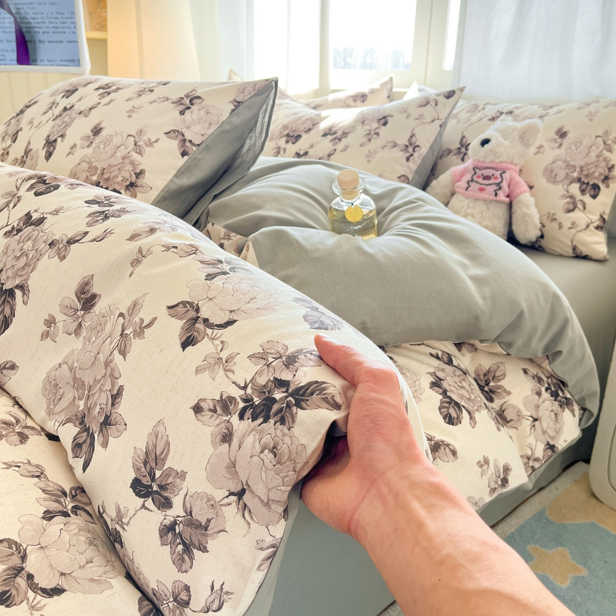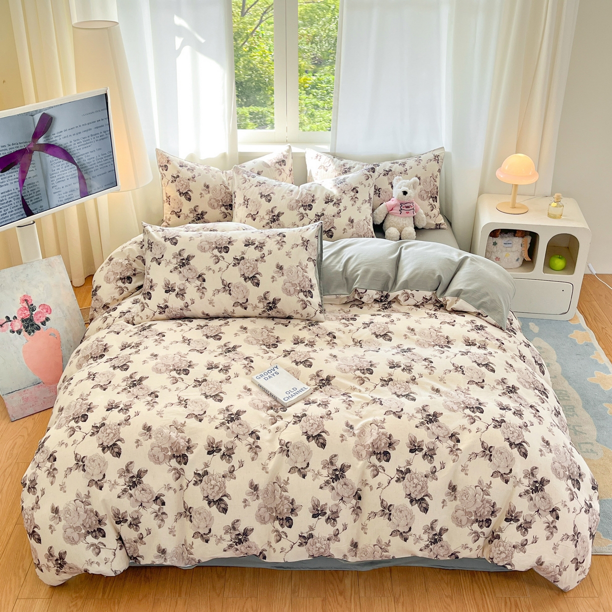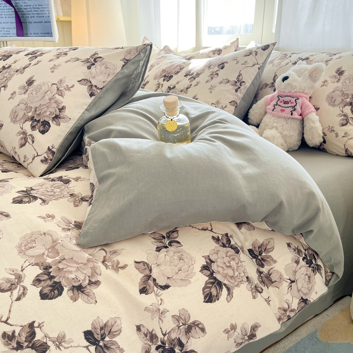 > 莱登卡奴 2026新款A类水洗棉麻小清新印花四件套 墨幽灰