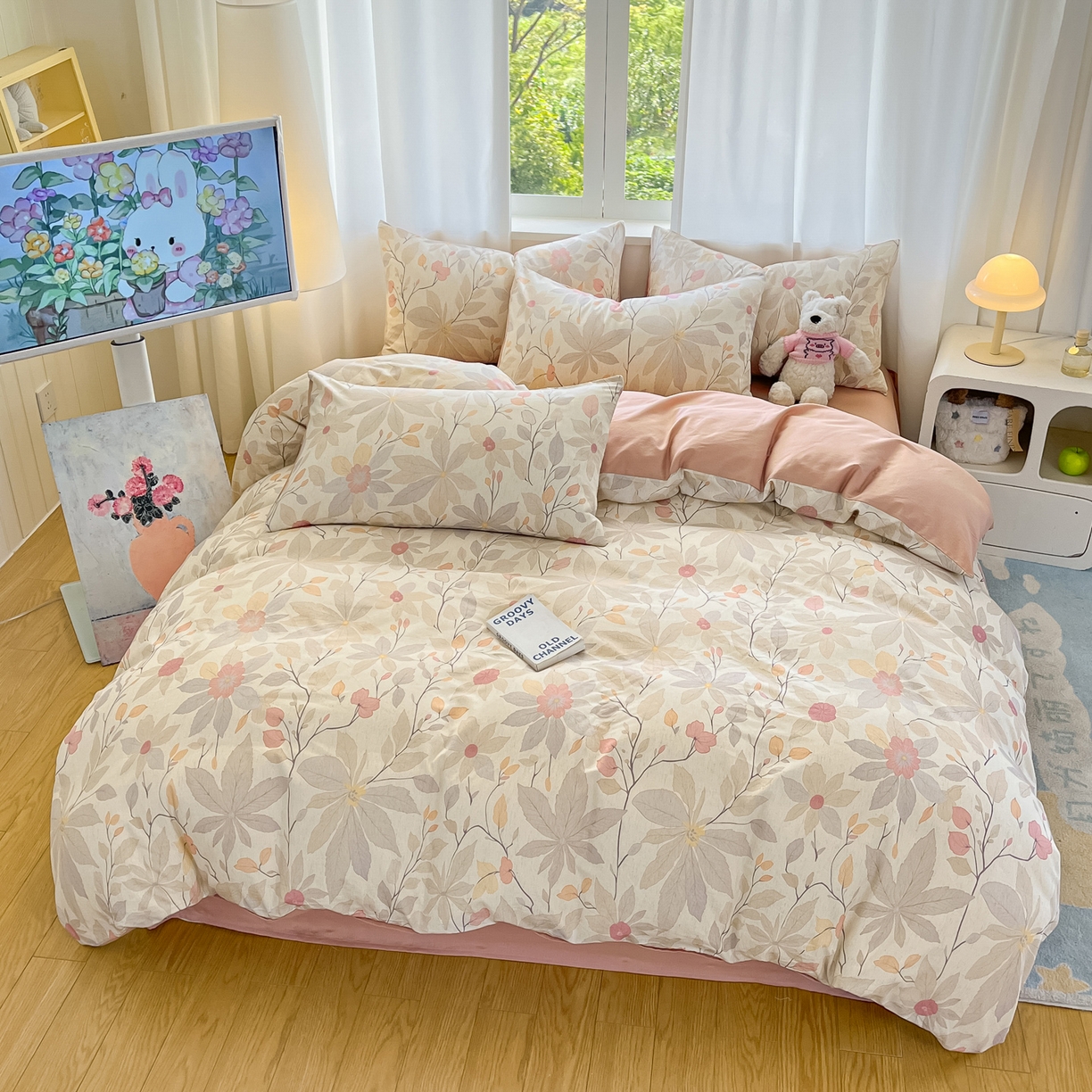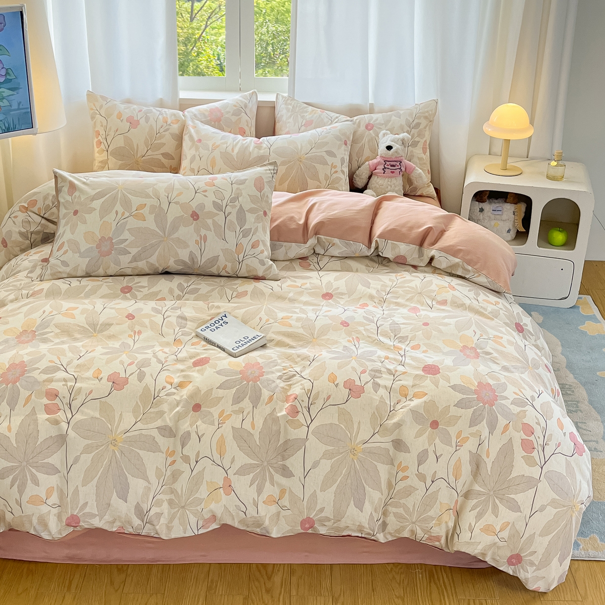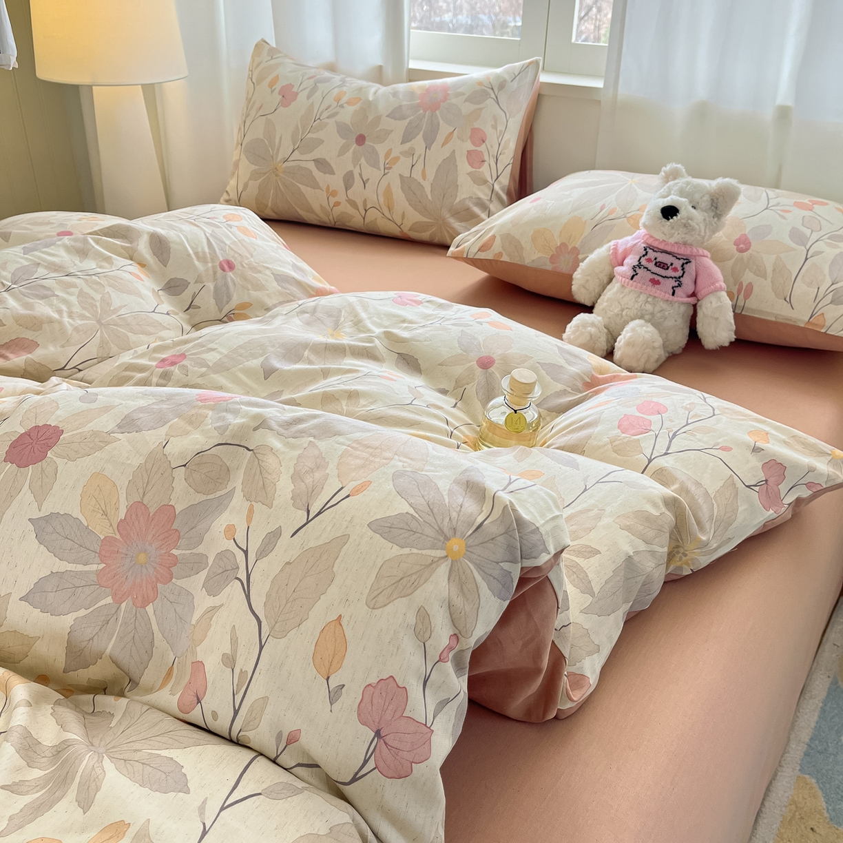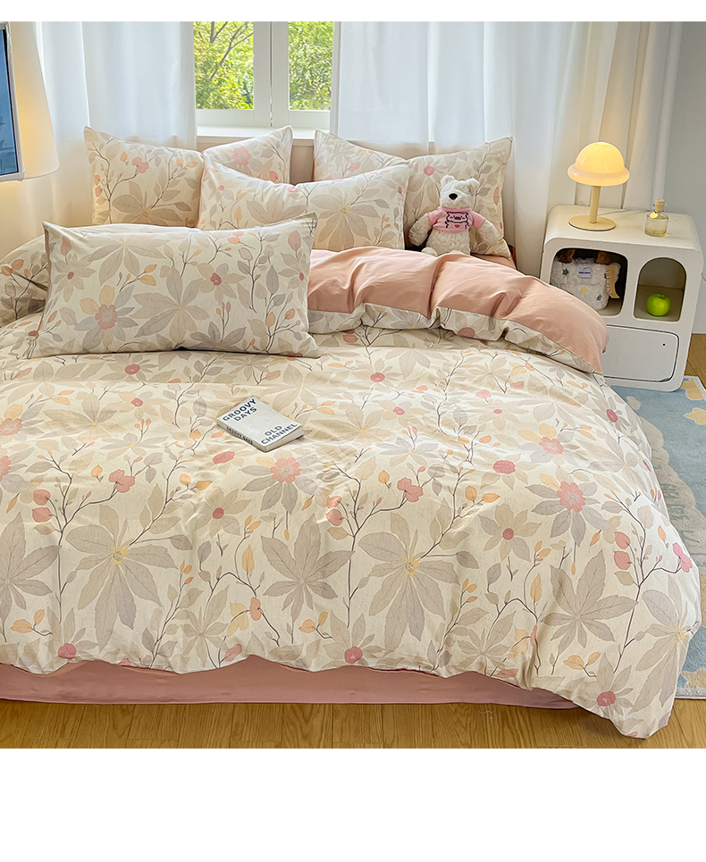 > 莱登卡奴 2026新款A类水洗棉麻小清新印花四件套 彤彩粉