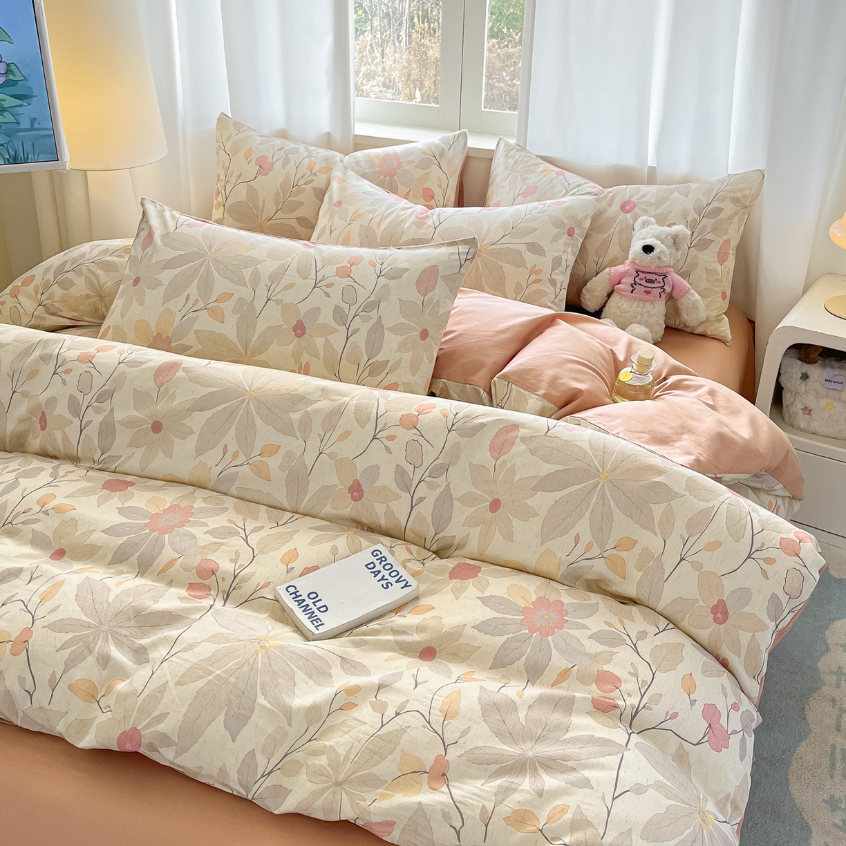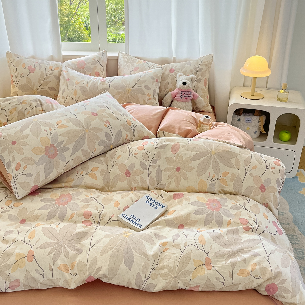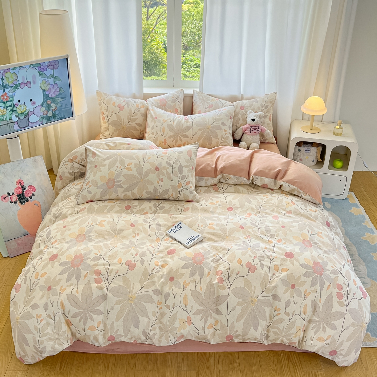 > 莱登卡奴 2026新款A类水洗棉麻小清新印花四件套 彤彩粉
