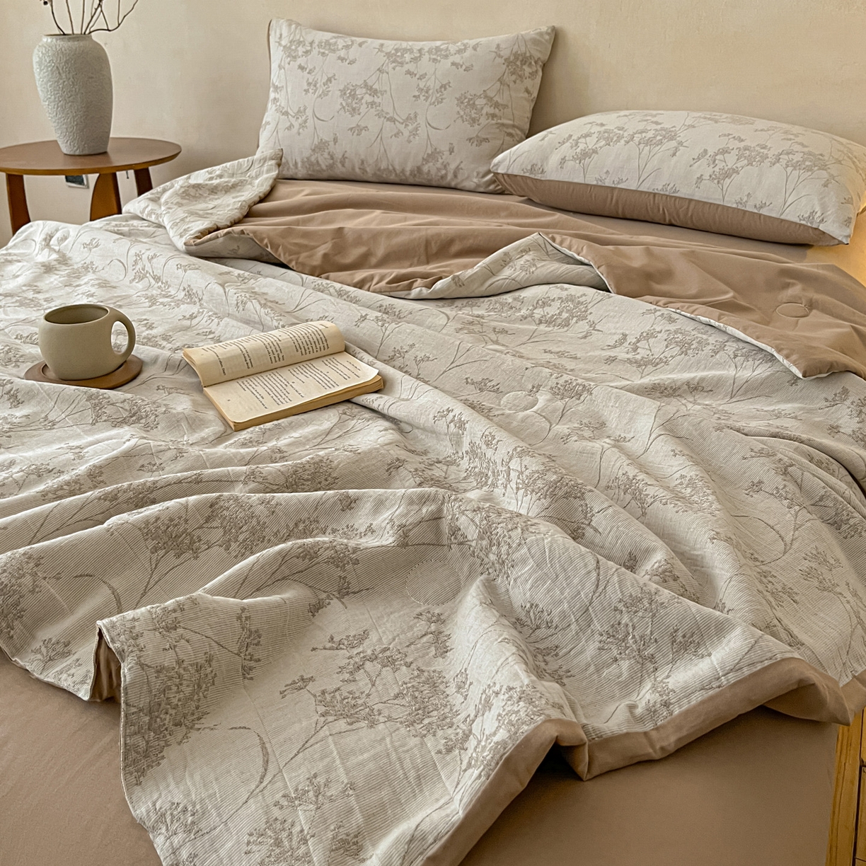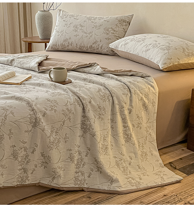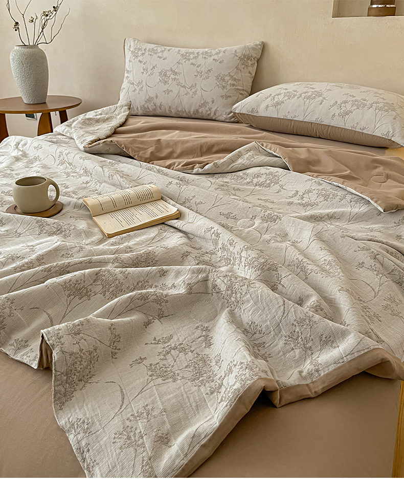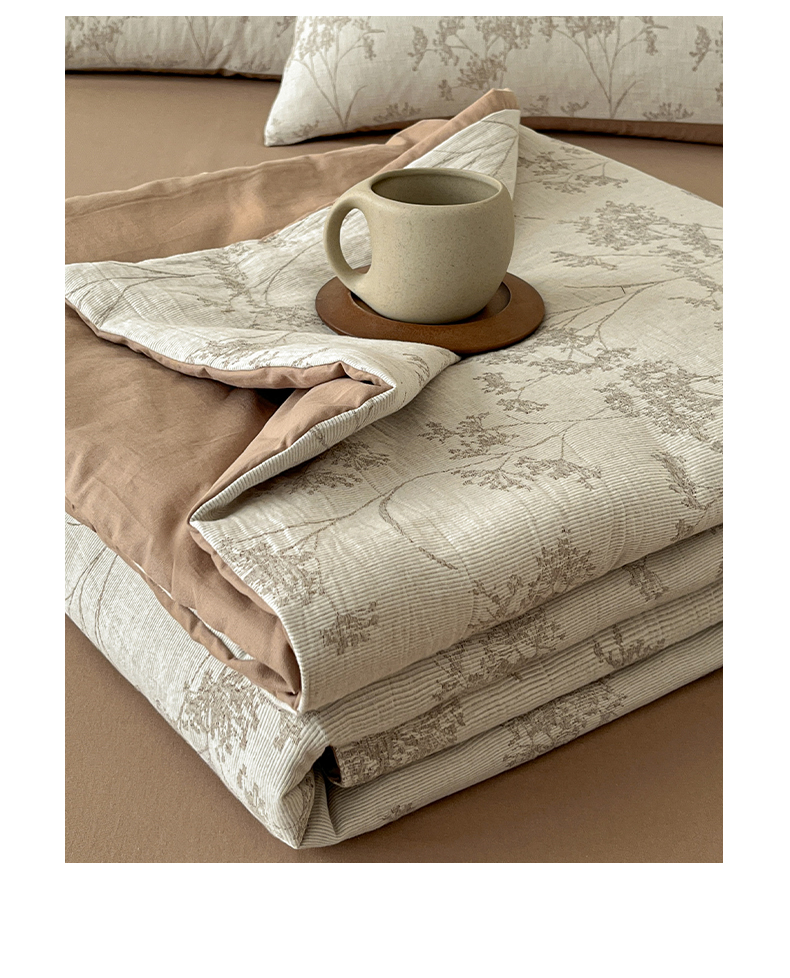 > 莱登卡奴 2026新款全棉A类三层纱水洗棉提花大豆夏被夏凉被空调被四件套 琼枝咖