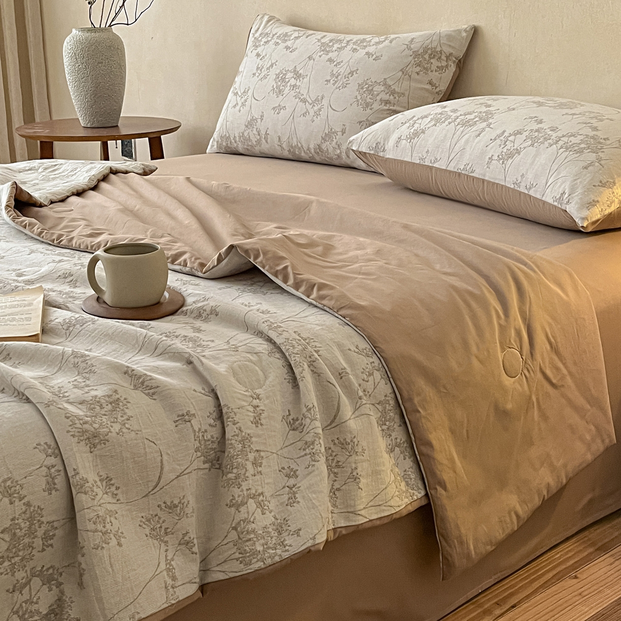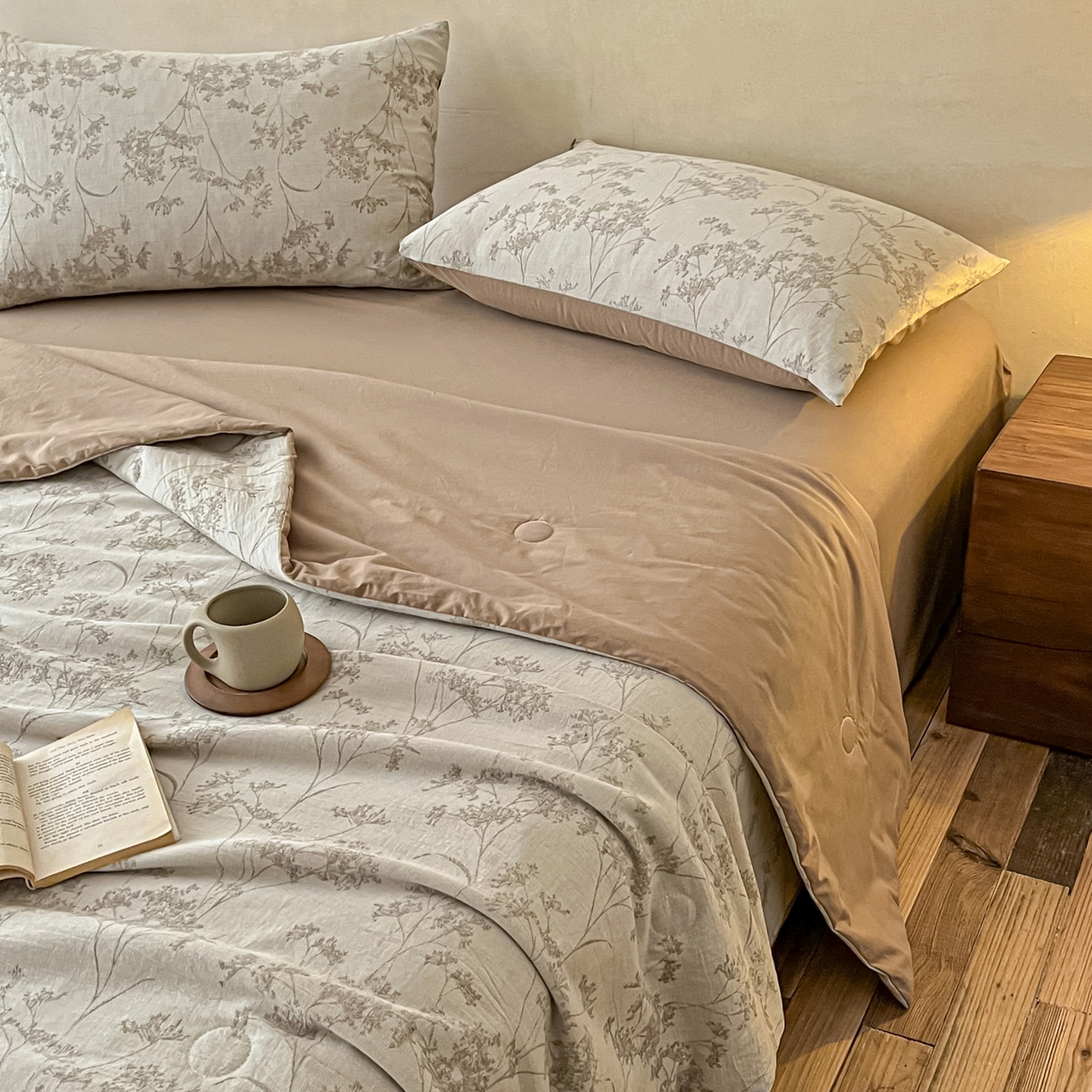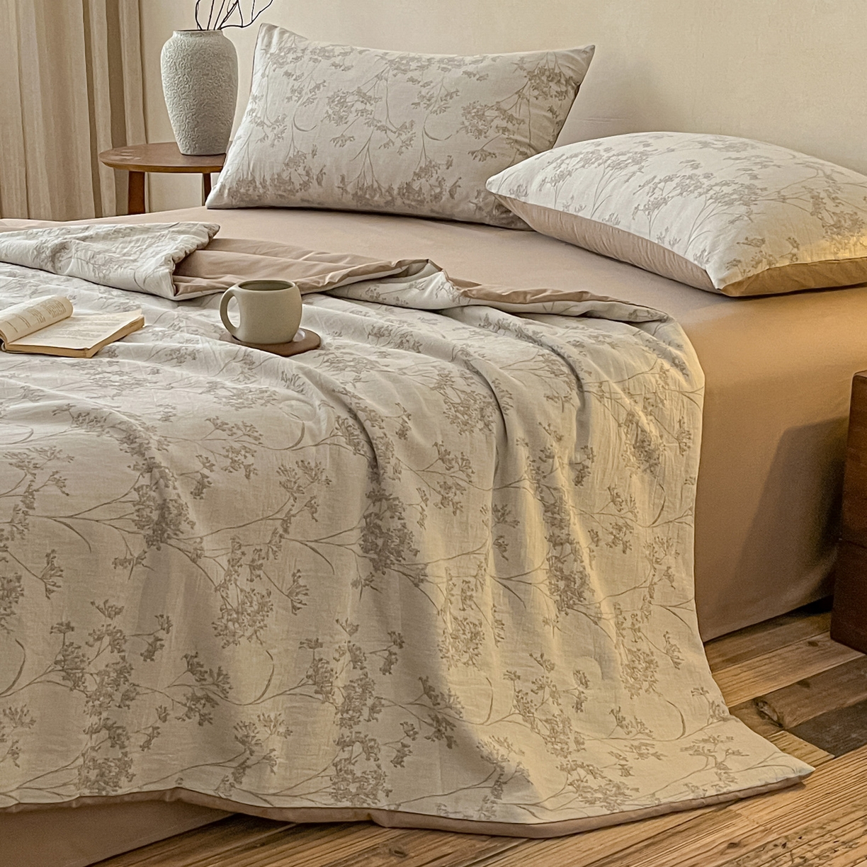 > 莱登卡奴 2026新款全棉A类三层纱水洗棉提花大豆夏被夏凉被空调被四件套 琼枝咖