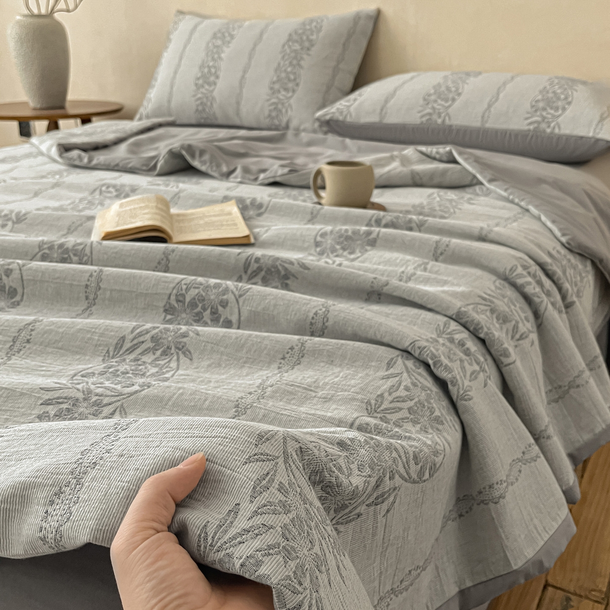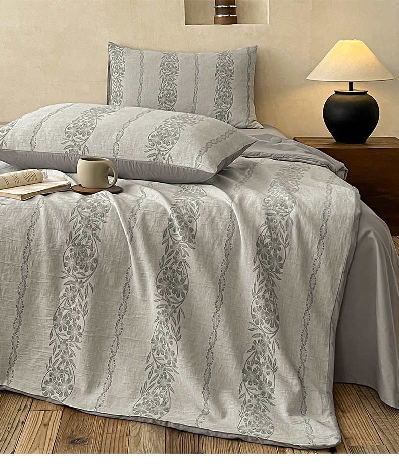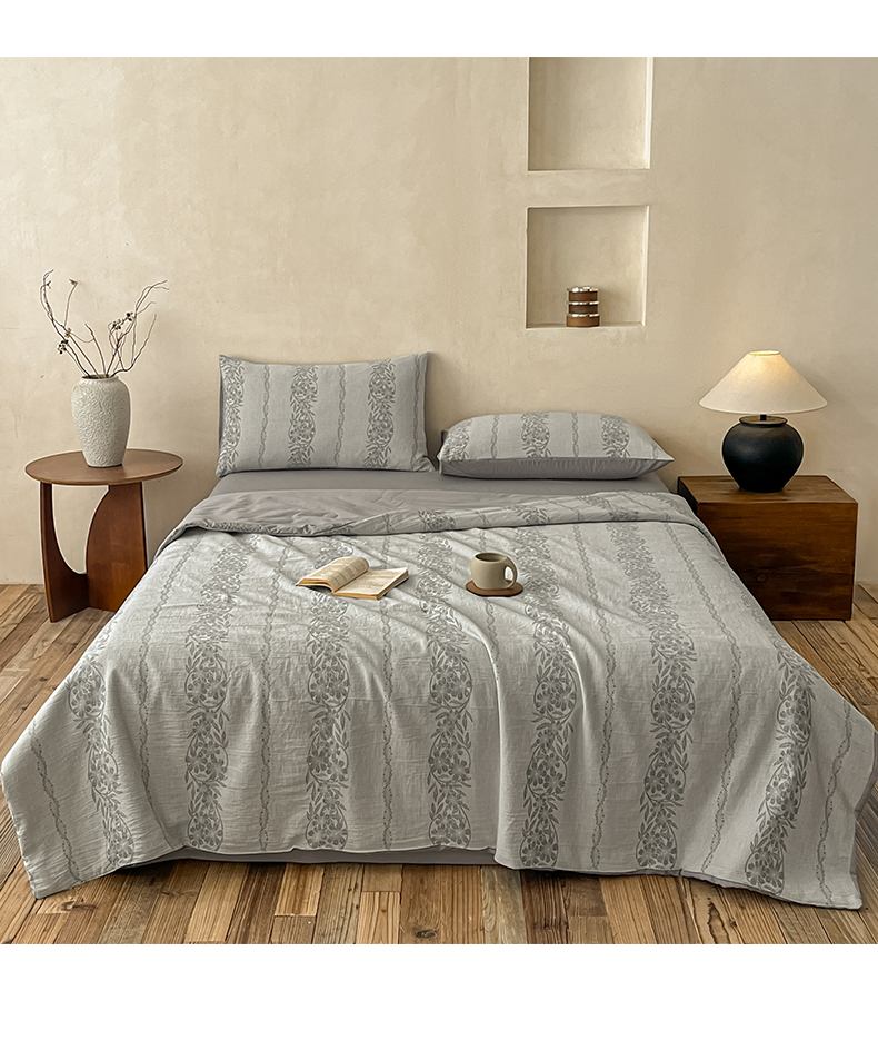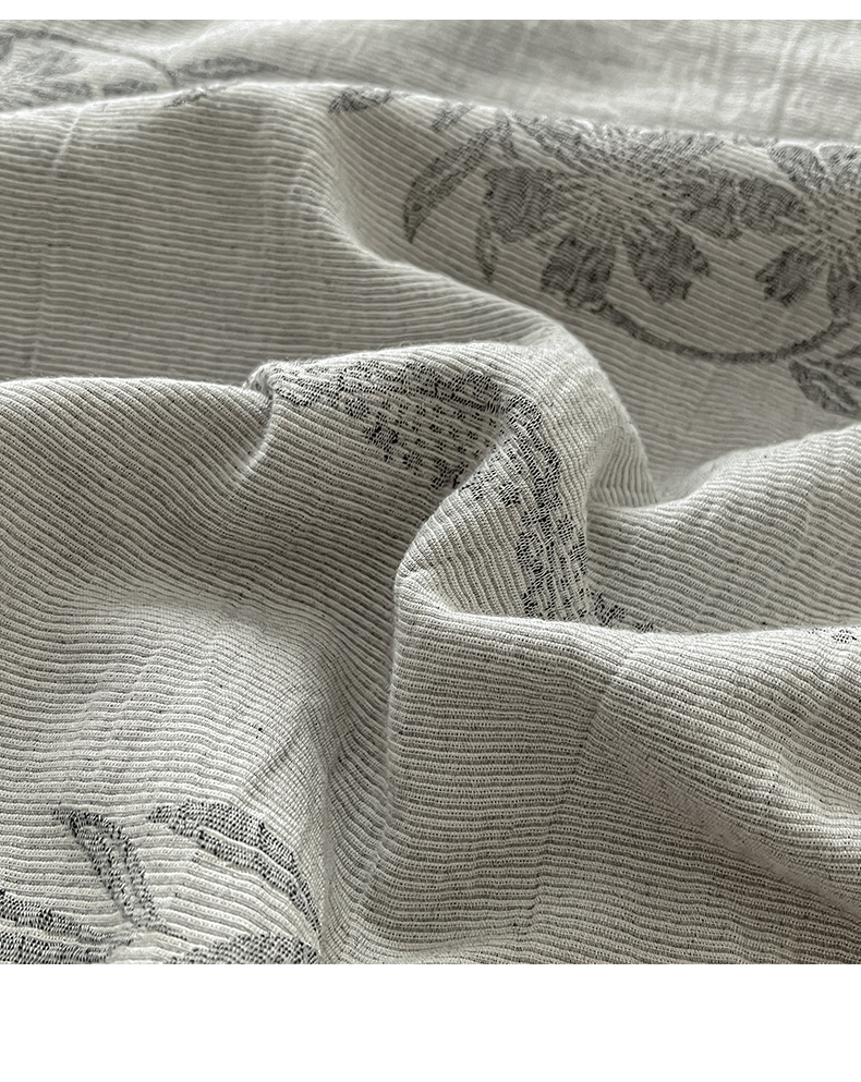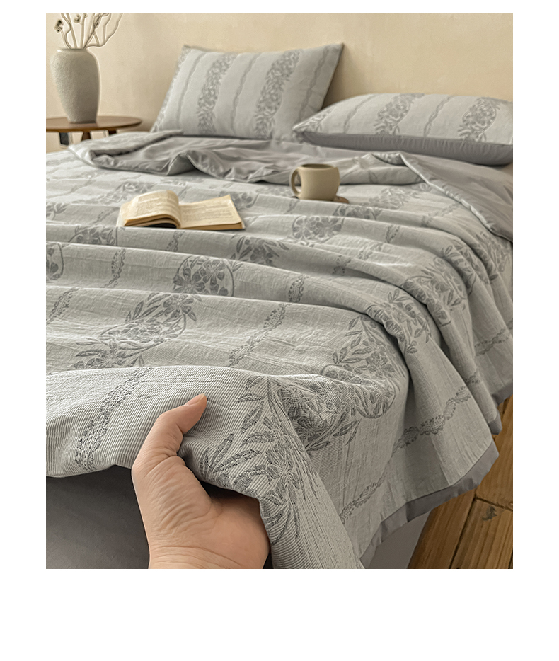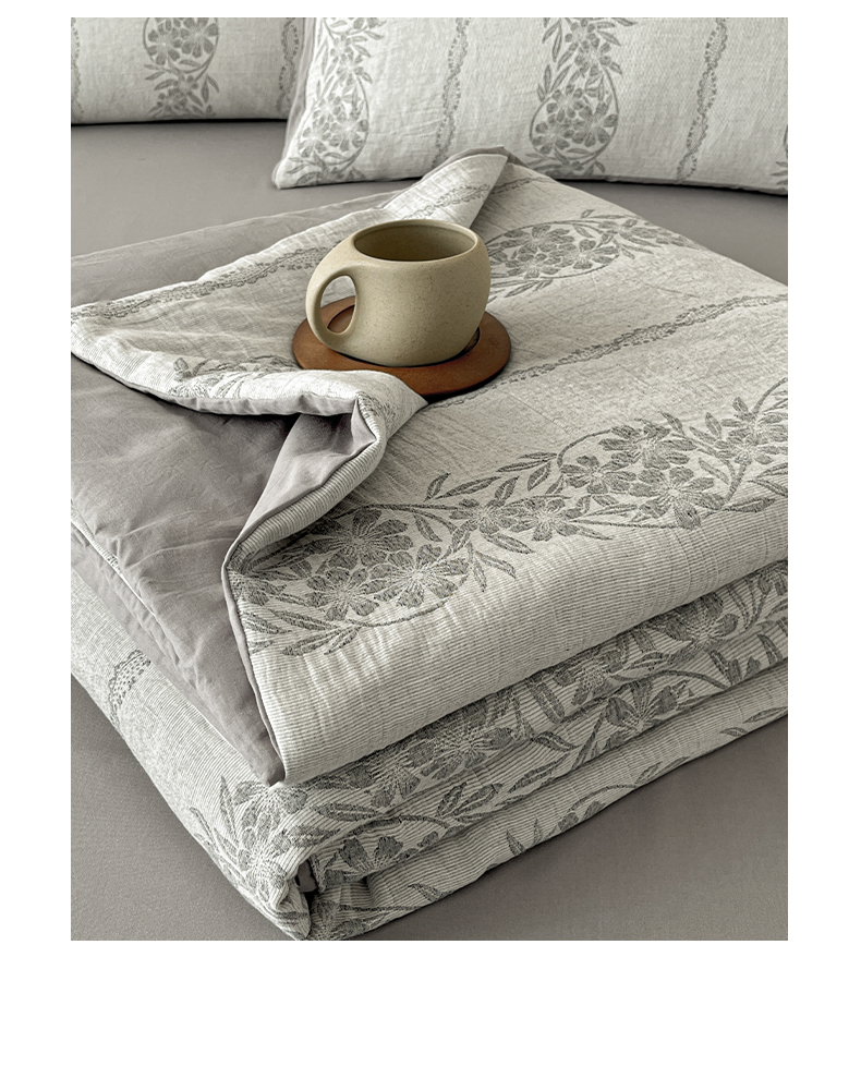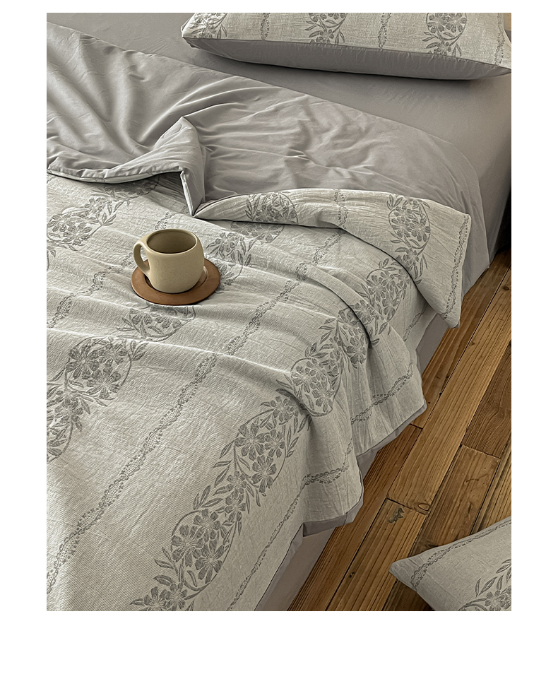 > 莱登卡奴 2026新款全棉A类三层纱水洗棉提花大豆夏被夏凉被空调被四件套 条蔓初暖灰