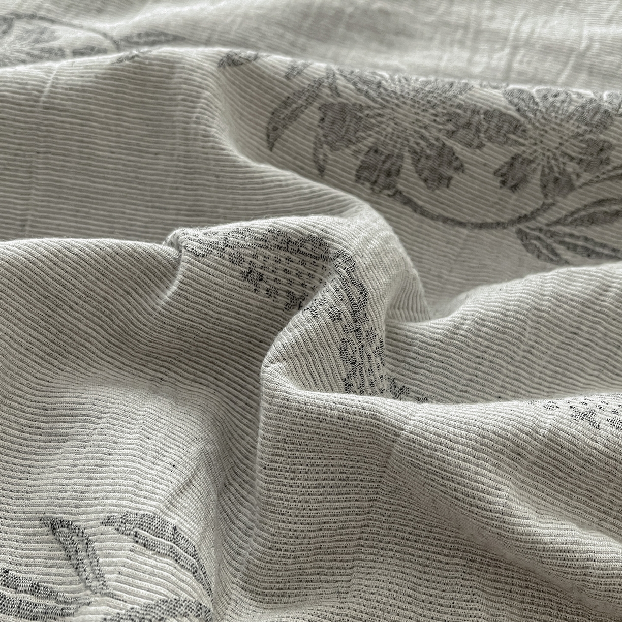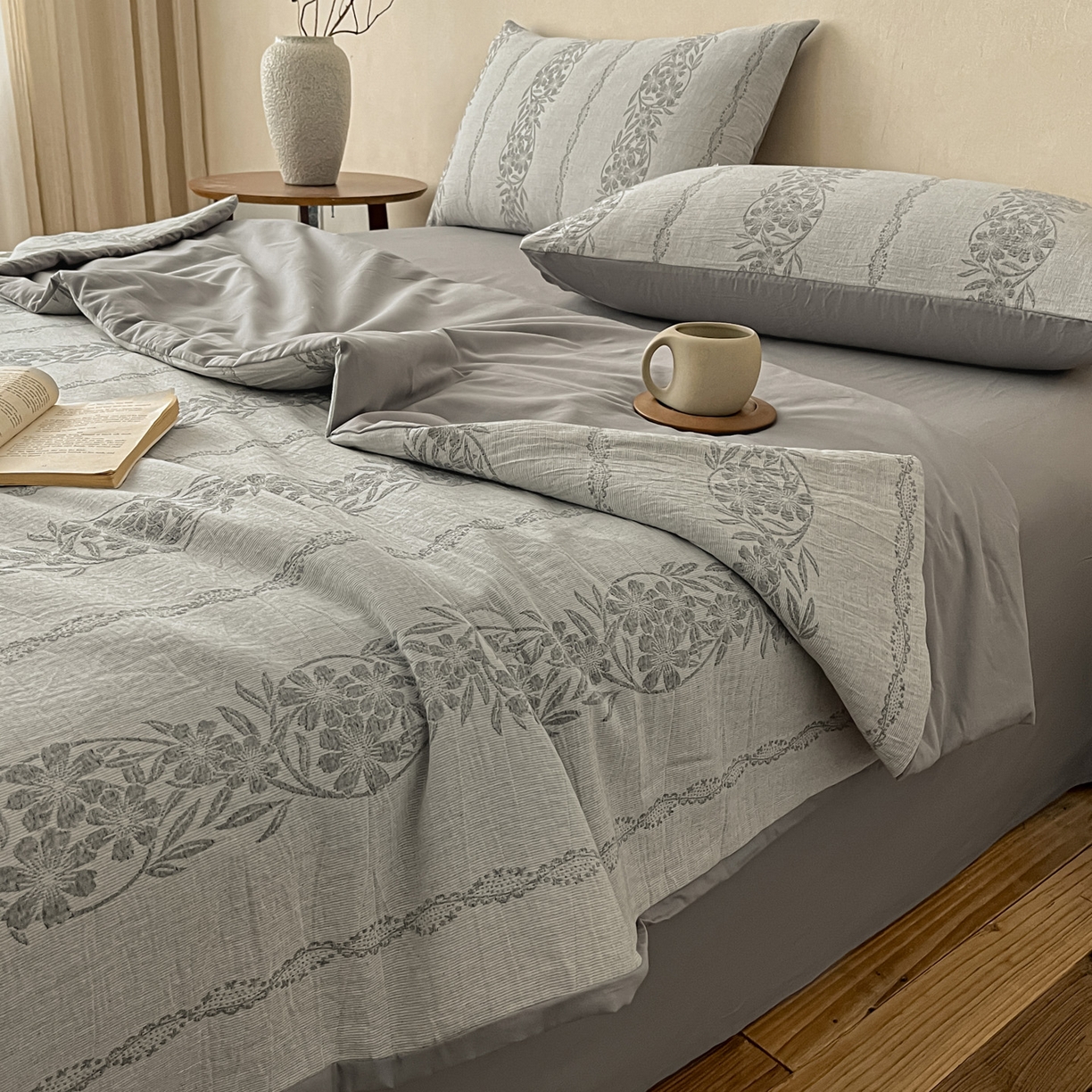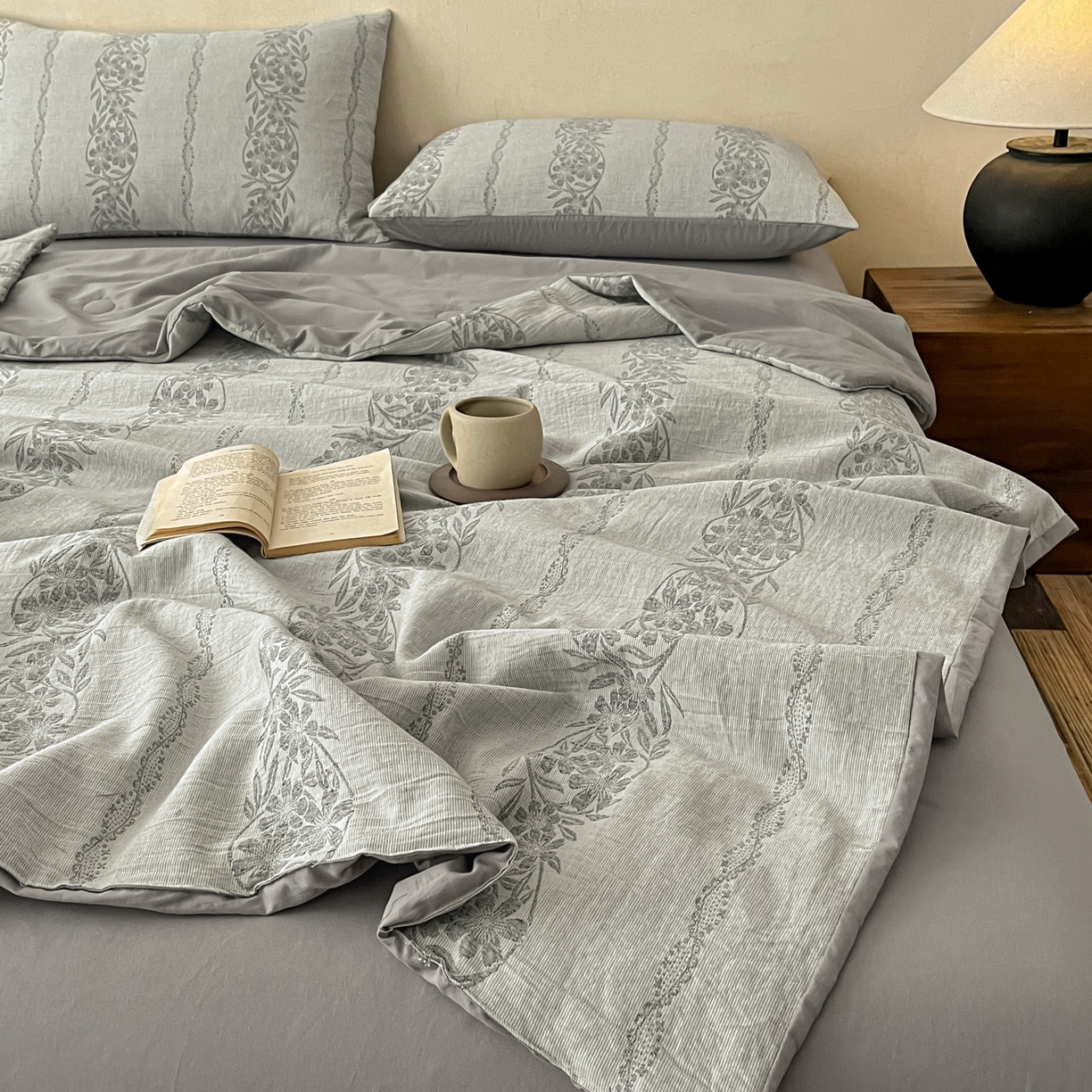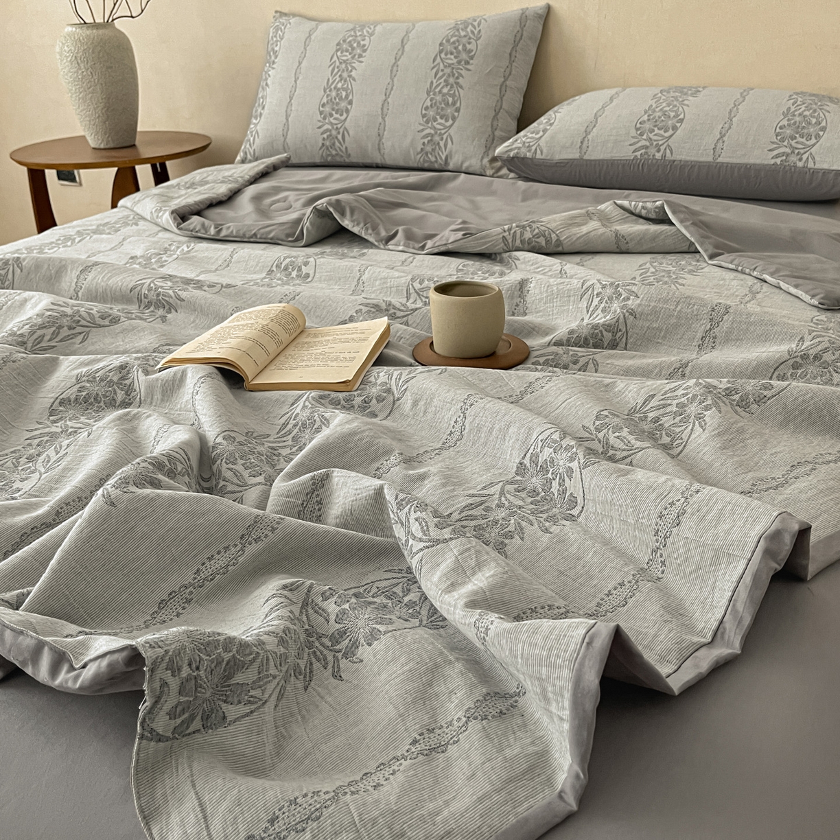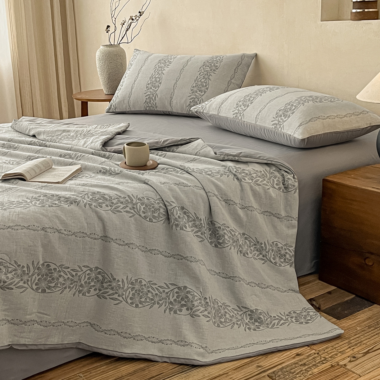 > 莱登卡奴 2026新款全棉A类三层纱水洗棉提花大豆夏被夏凉被空调被四件套 条蔓初暖灰