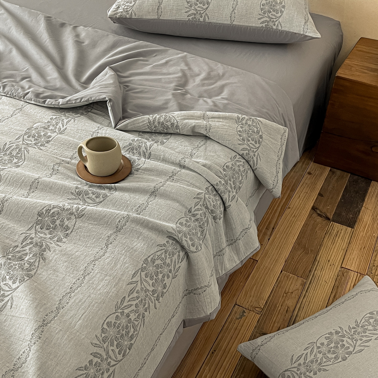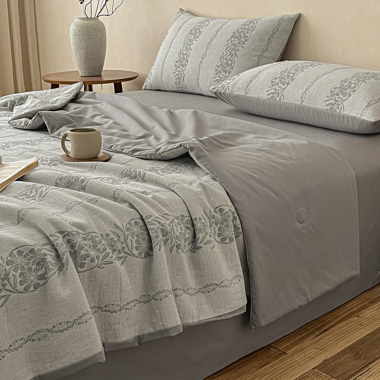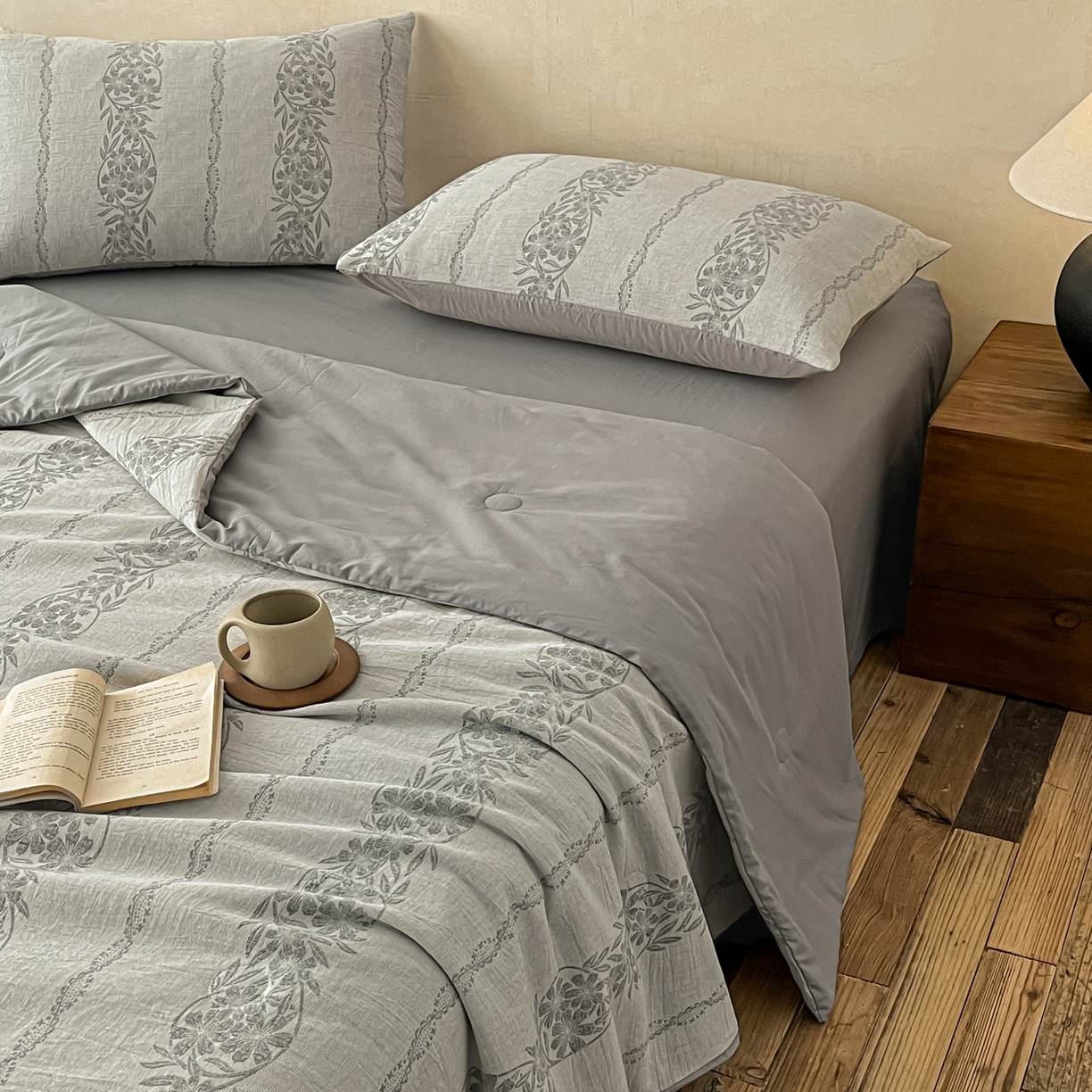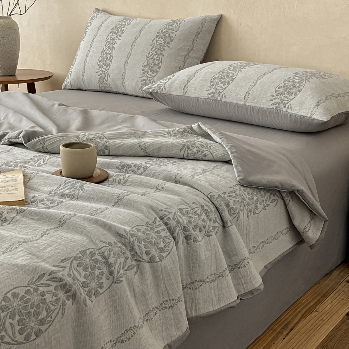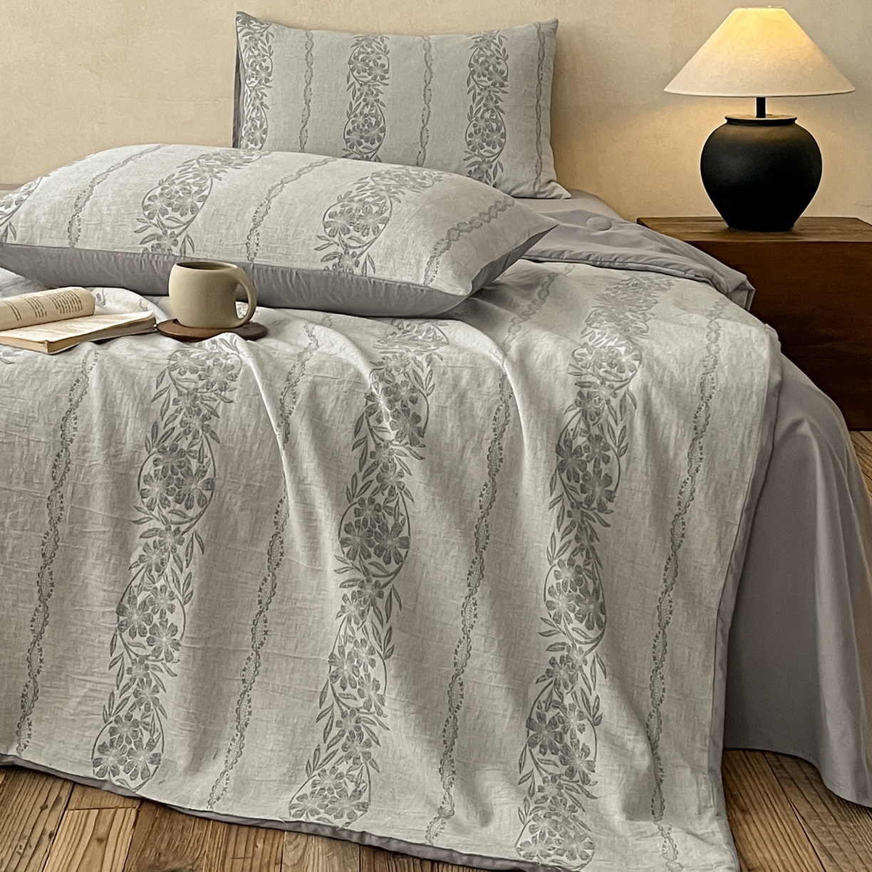 > 莱登卡奴 2026新款全棉A类三层纱水洗棉提花大豆夏被夏凉被空调被四件套 条蔓初暖灰