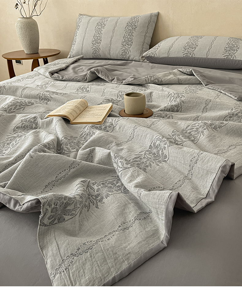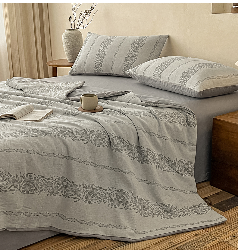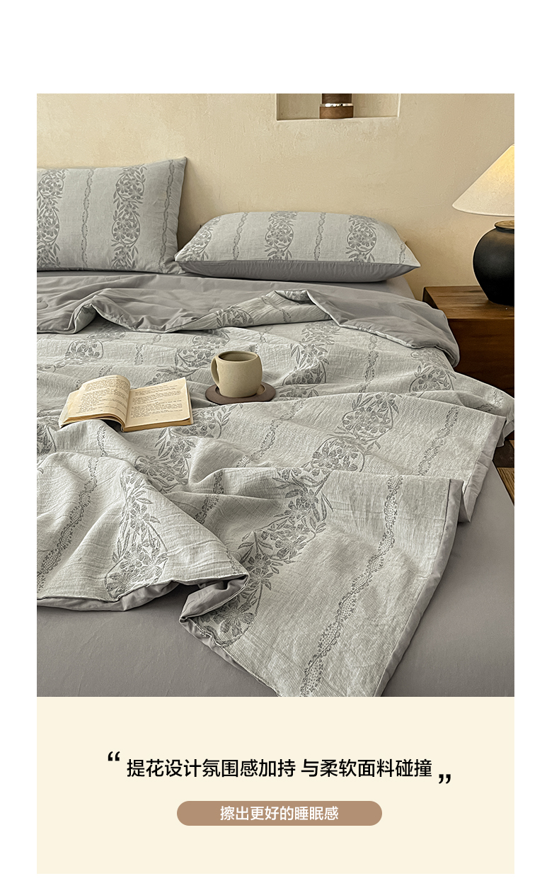 莱登卡奴 2026新款全棉A类三层纱水洗棉提花大豆夏被夏凉被空调被四件套 条蔓初暖灰