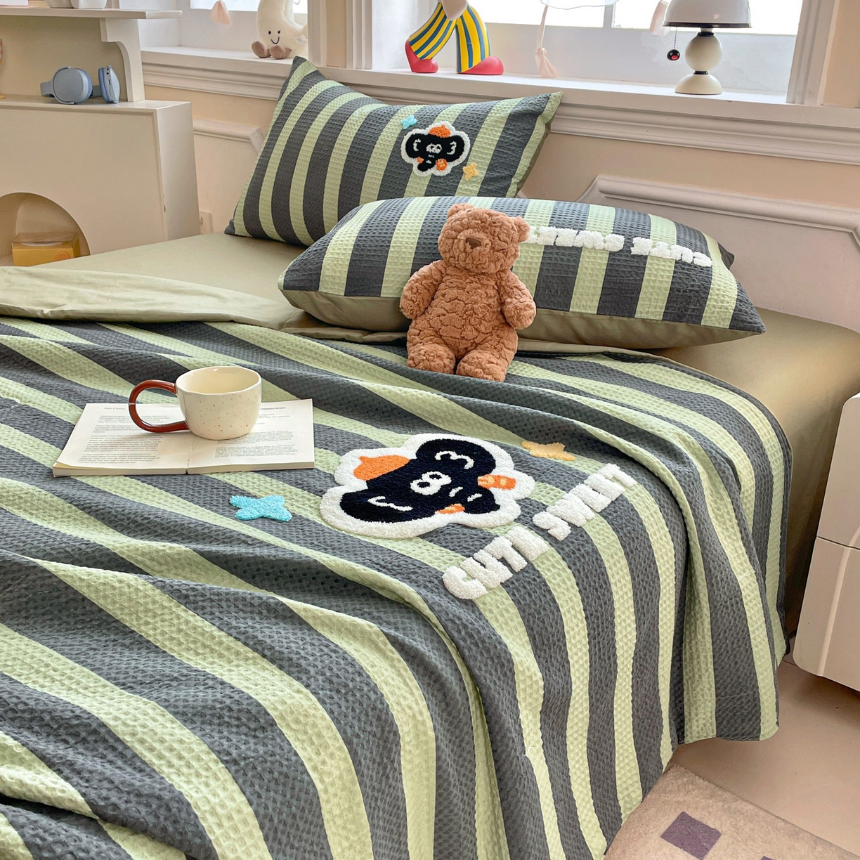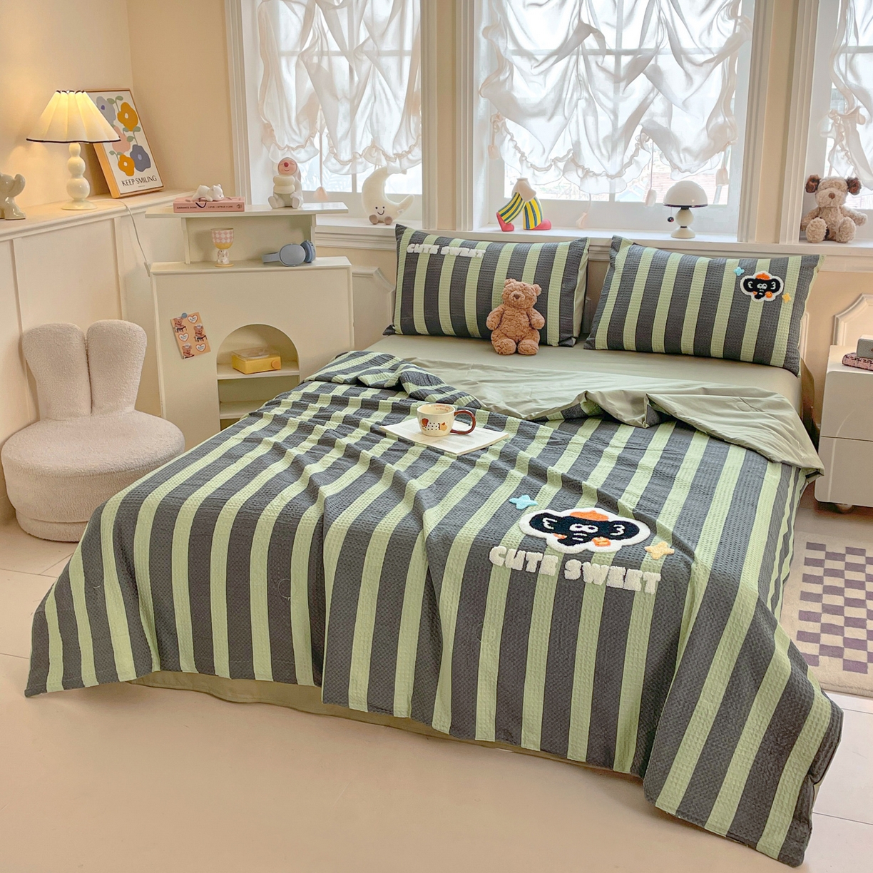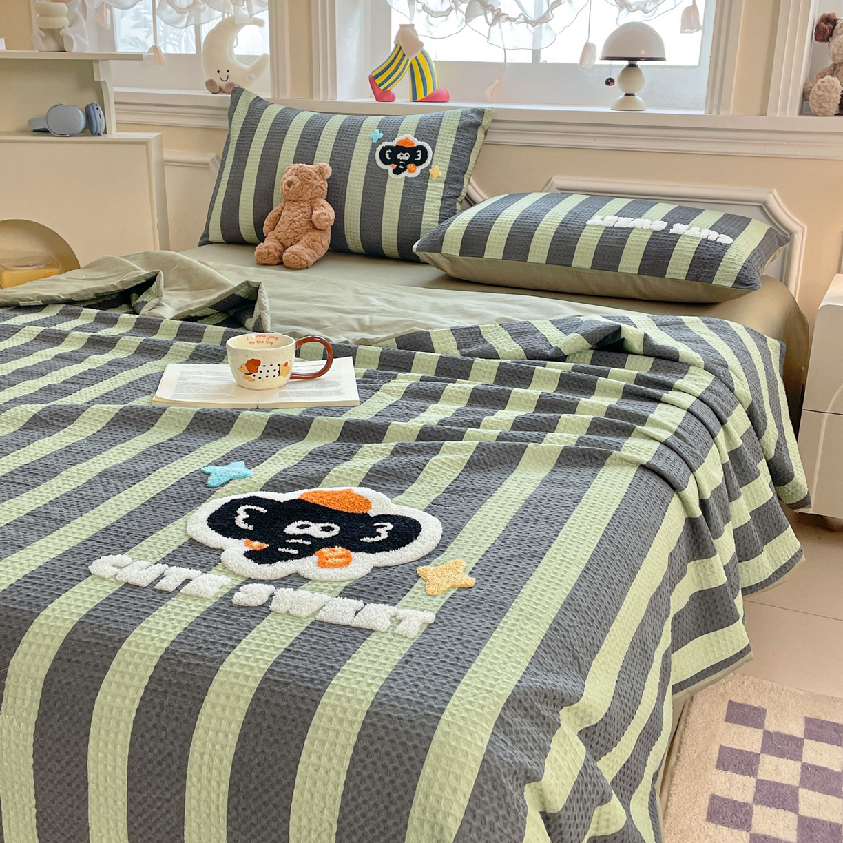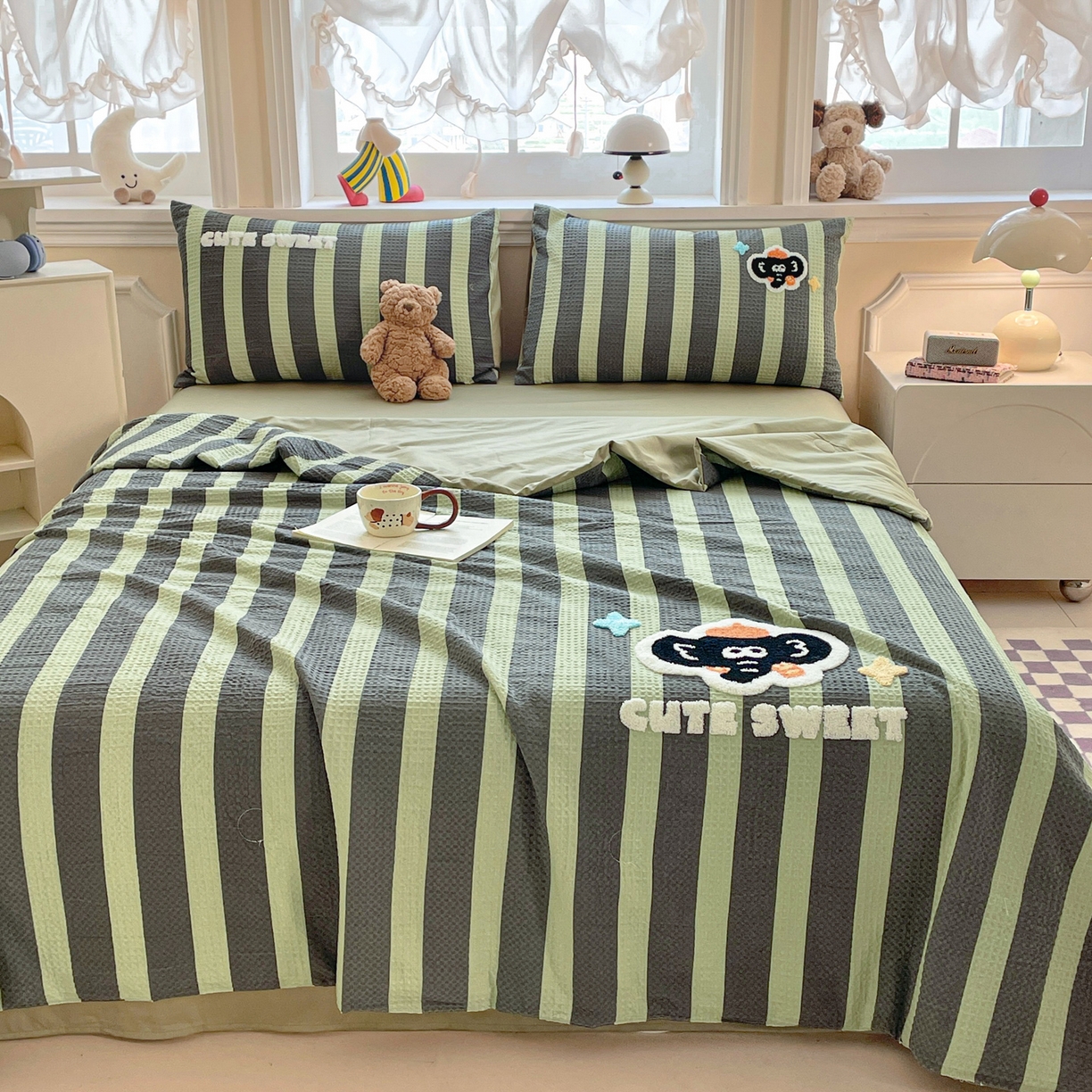 > 莱登卡奴 2026春夏新款全棉A类水洗华夫格毛巾绣大豆夏被夏凉被空调被四件套系列 春生抹茶绿