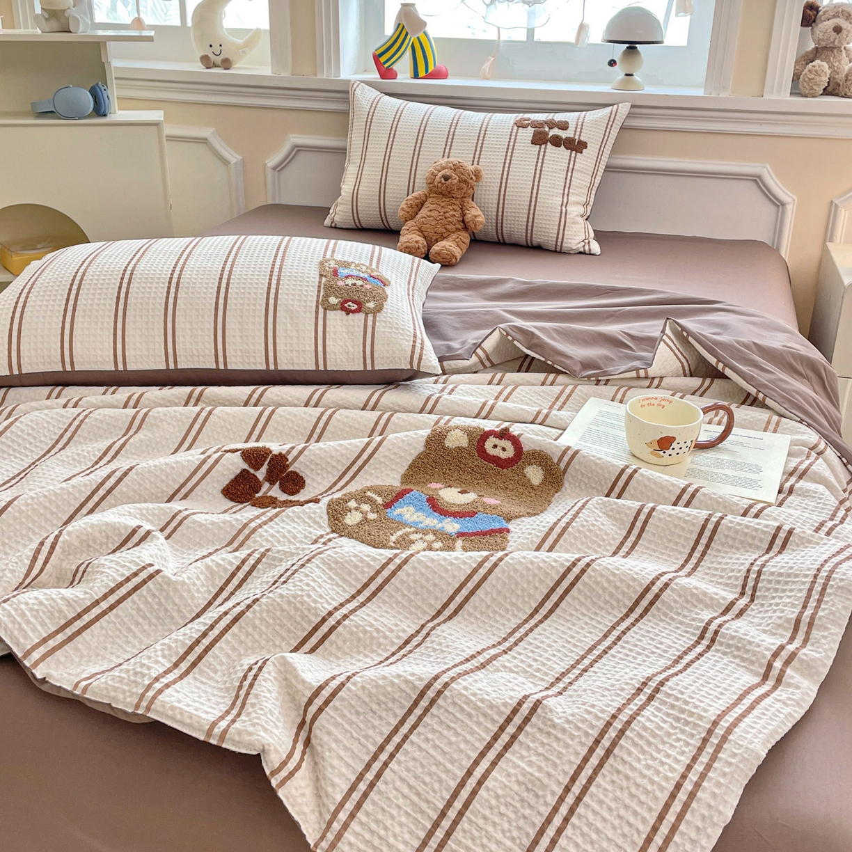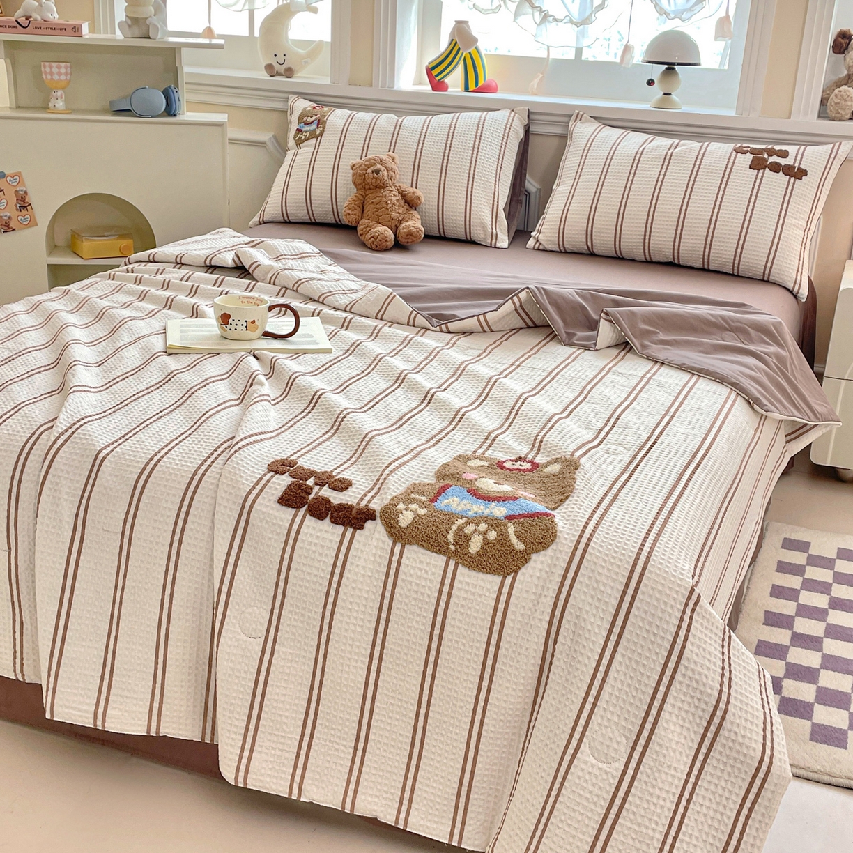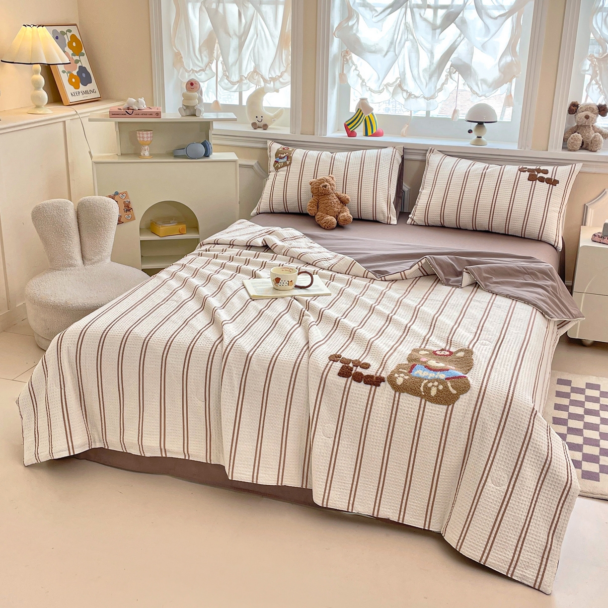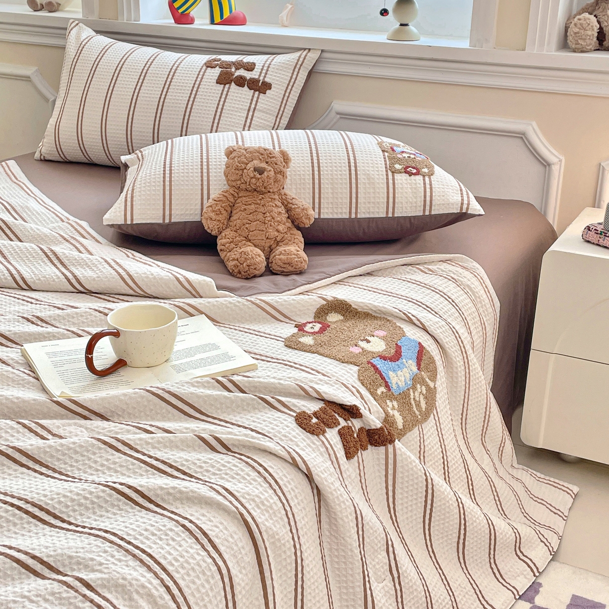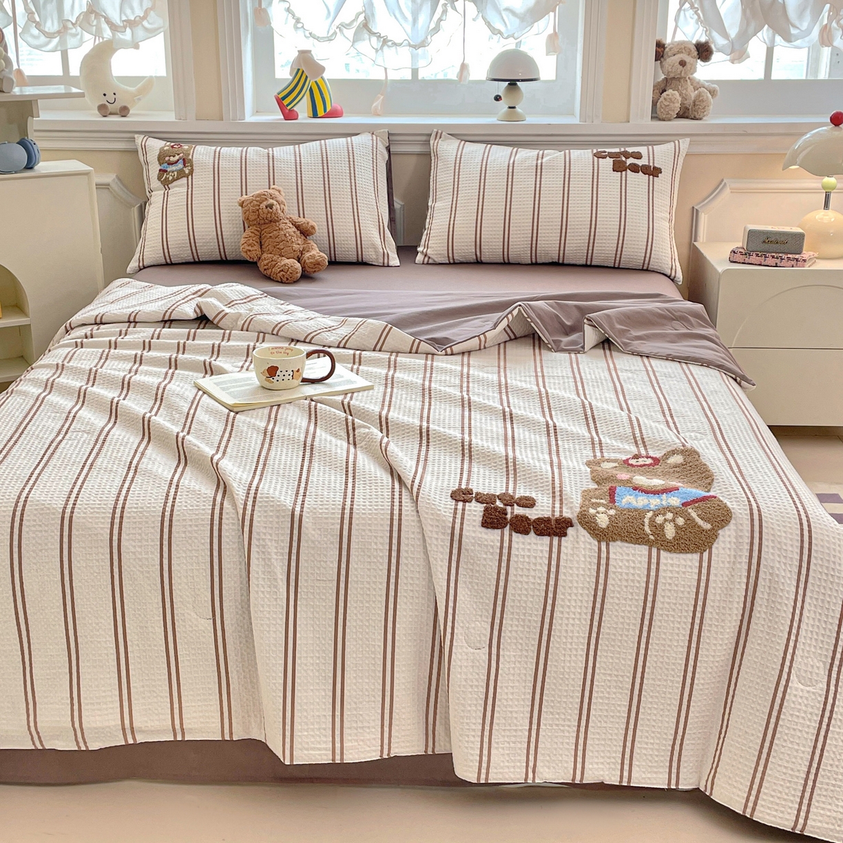 > 莱登卡奴 2026春夏新款全棉A类水洗华夫格毛巾绣大豆夏被夏凉被空调被四件套系列 风月茶褐