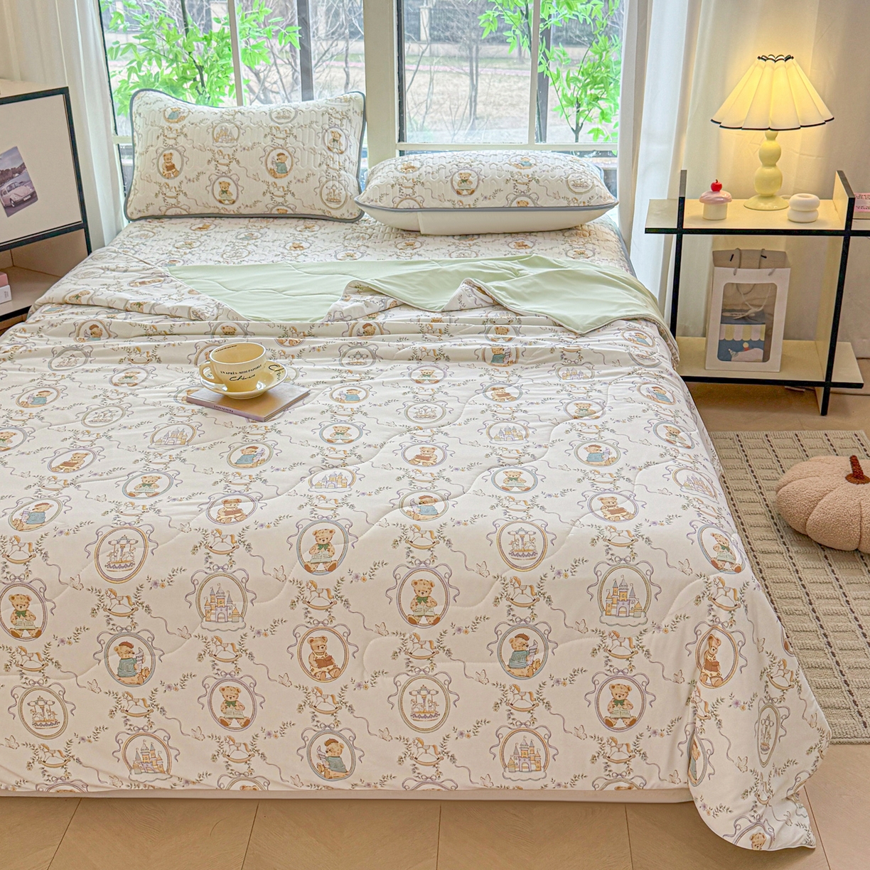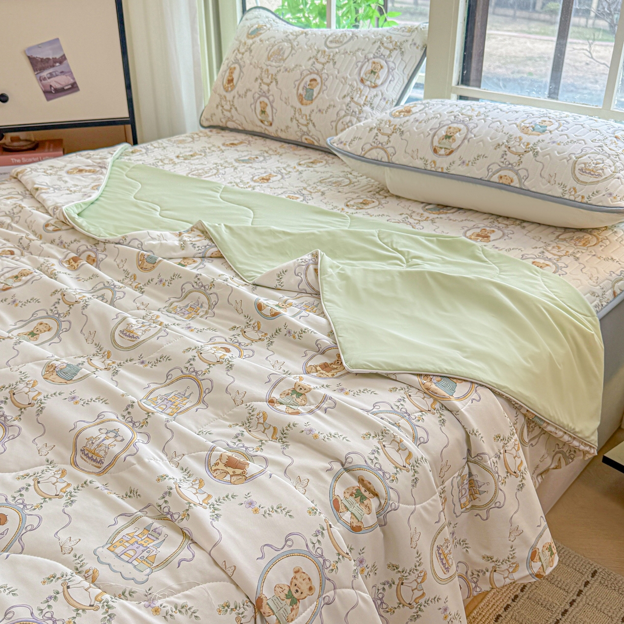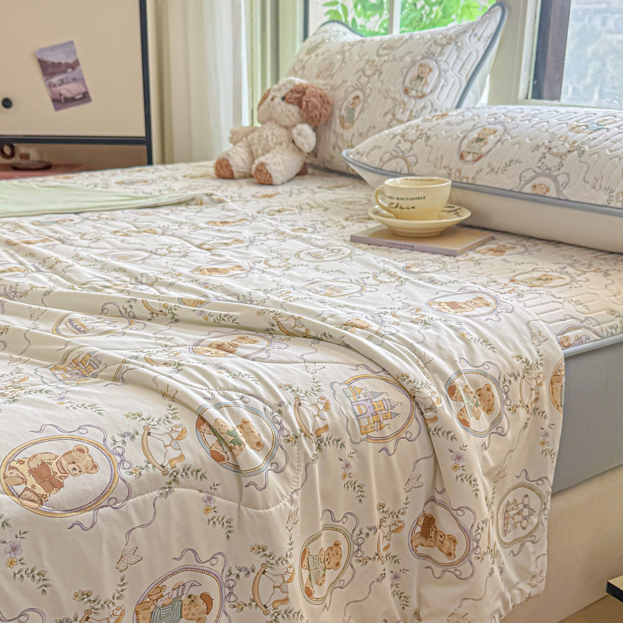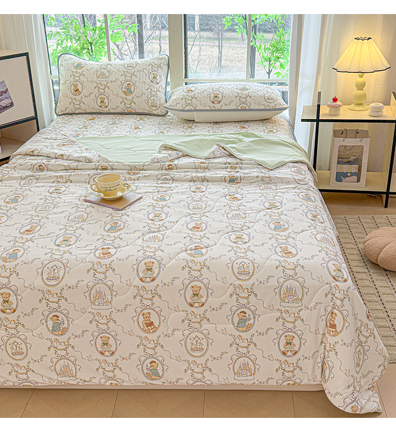 > 莱登卡奴 2026新款新款A类凉感丝锦氨数码印花夏被四件套 熊堡轻梦