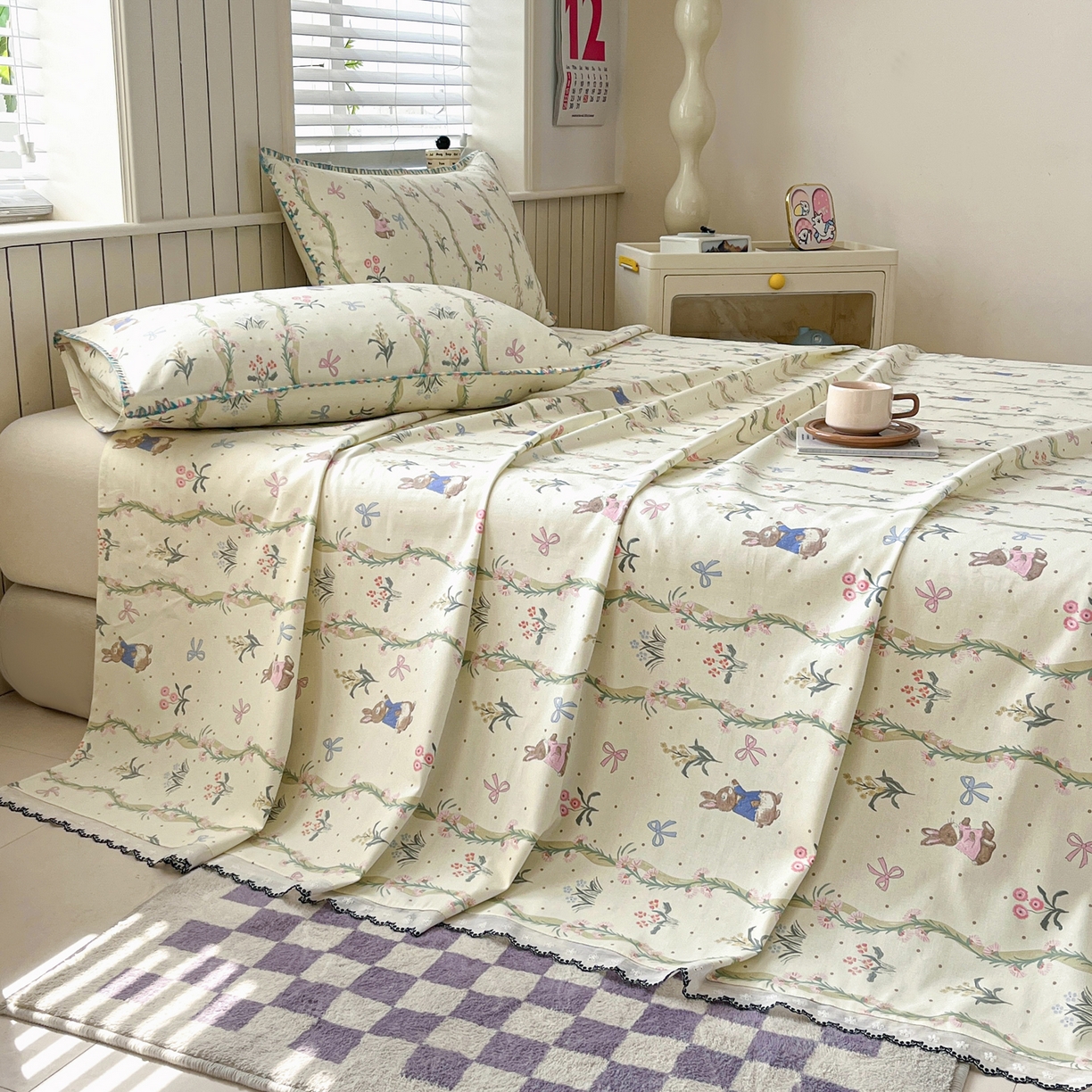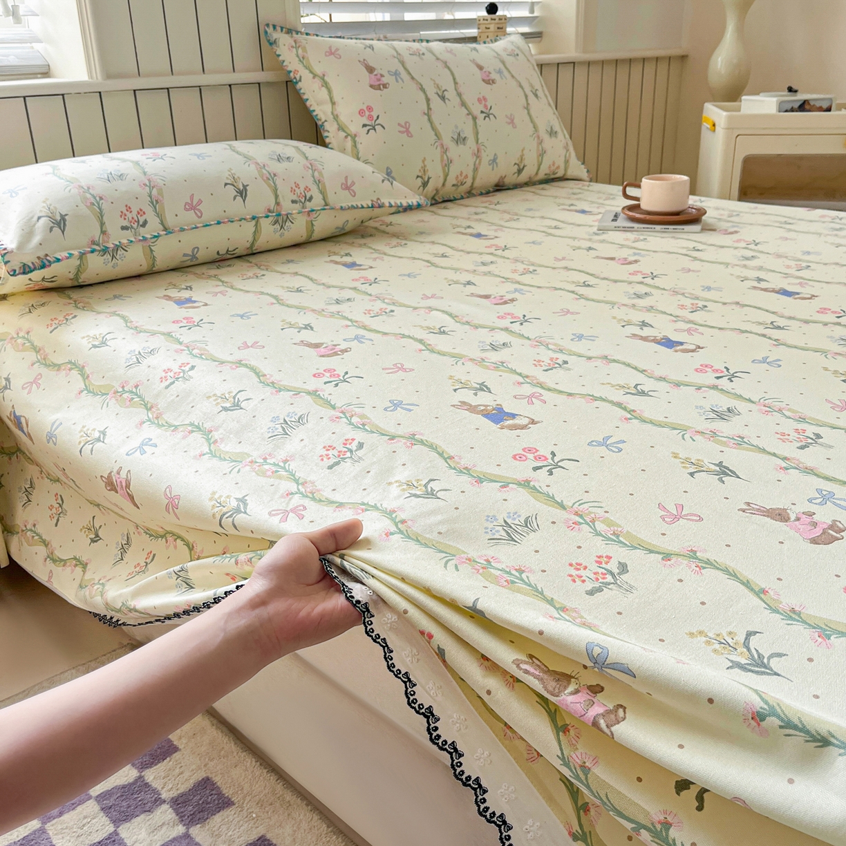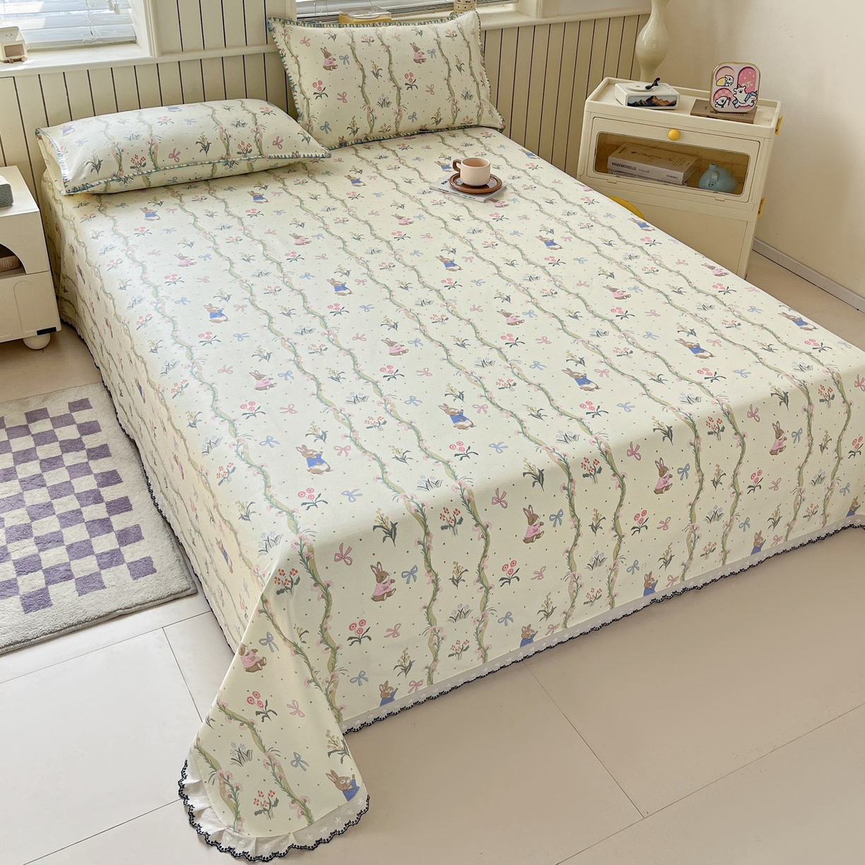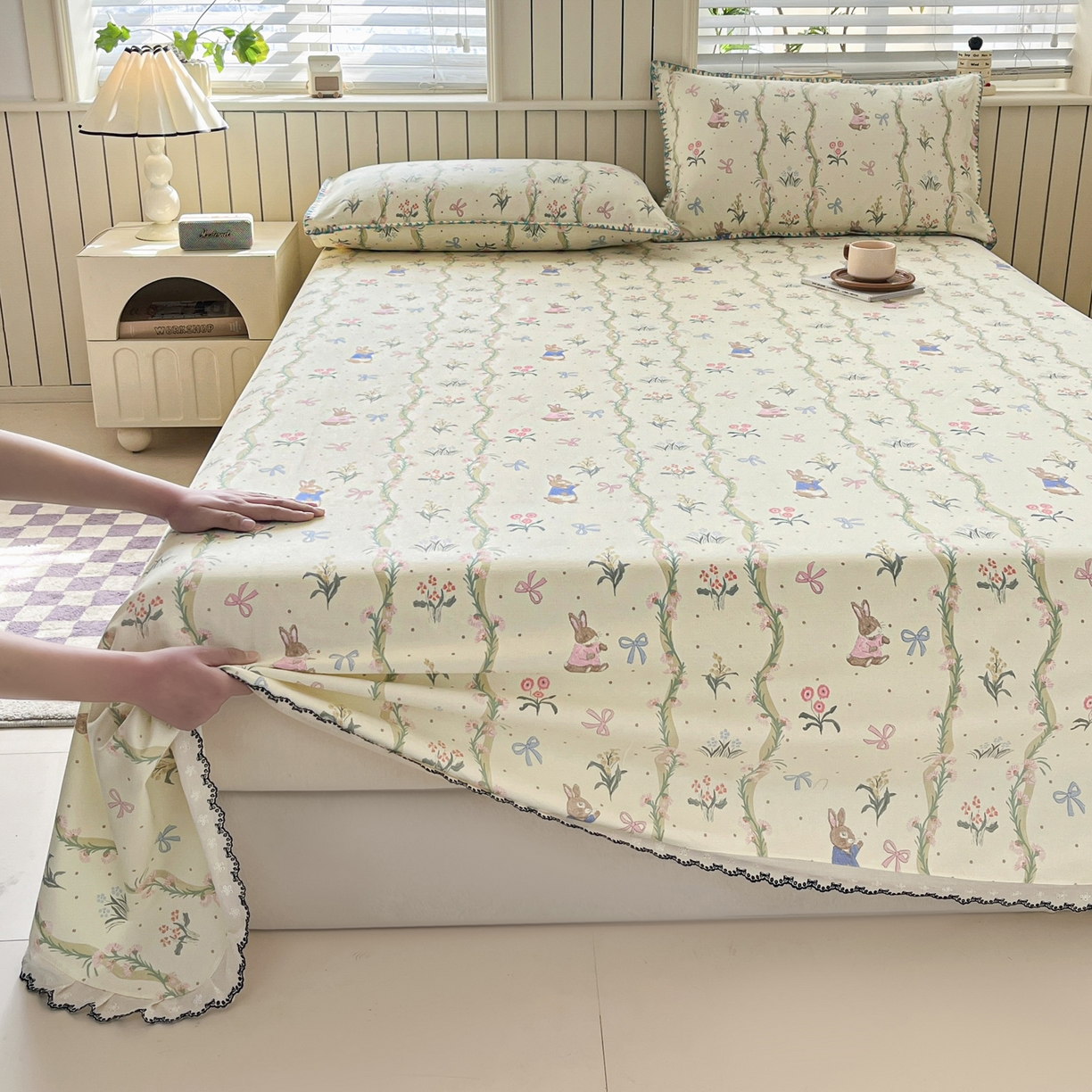> 莱登卡奴 2026新款A类100%全棉老粗布花边款单品系列床单 花边-藤蔓兔