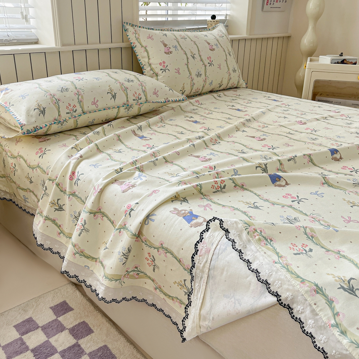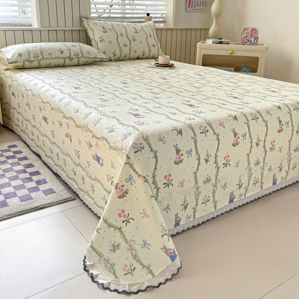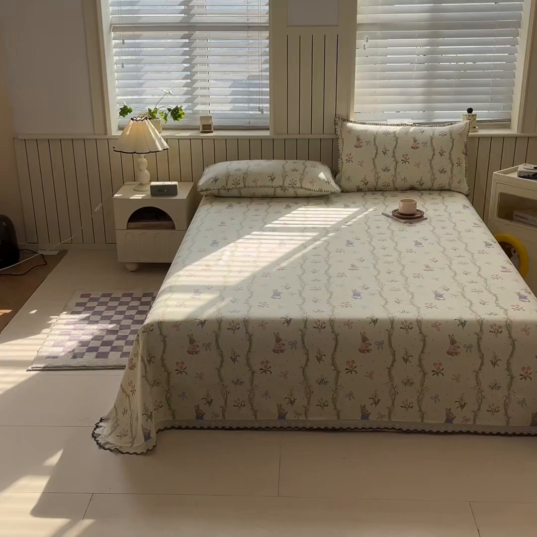 莱登卡奴 2026新款A类100%全棉老粗布花边款单品系列床单 花边-藤蔓兔