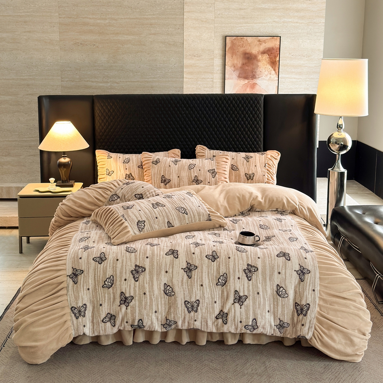 莱登卡奴 2025新款高克重牛奶绒雕花法式轻奢款床单床裙系列四件套 轻奢蝶舞-杏色