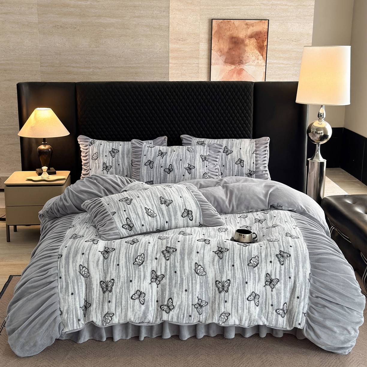 莱登卡奴 2025新款高克重牛奶绒雕花法式轻奢款床单床裙系列四件套 轻奢蝶舞-银灰