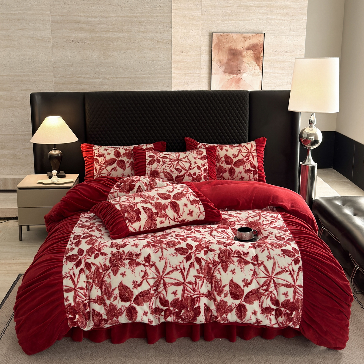 莱登卡奴 2025新款高克重牛奶绒雕花法式轻奢款床单床裙系列四件套 轻奢花语-酒红