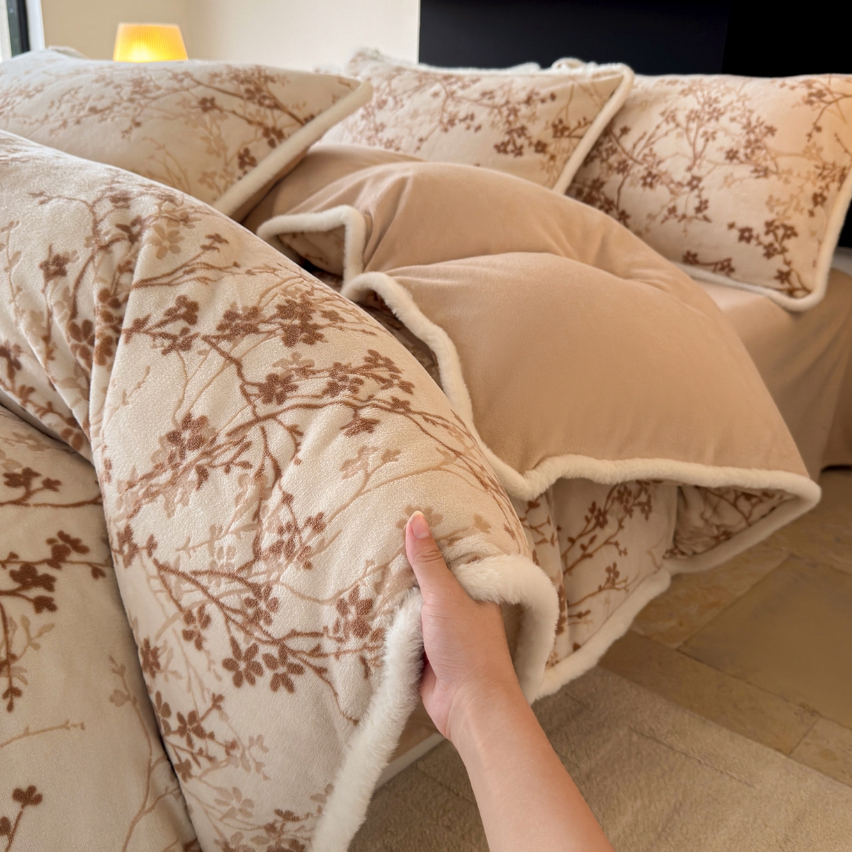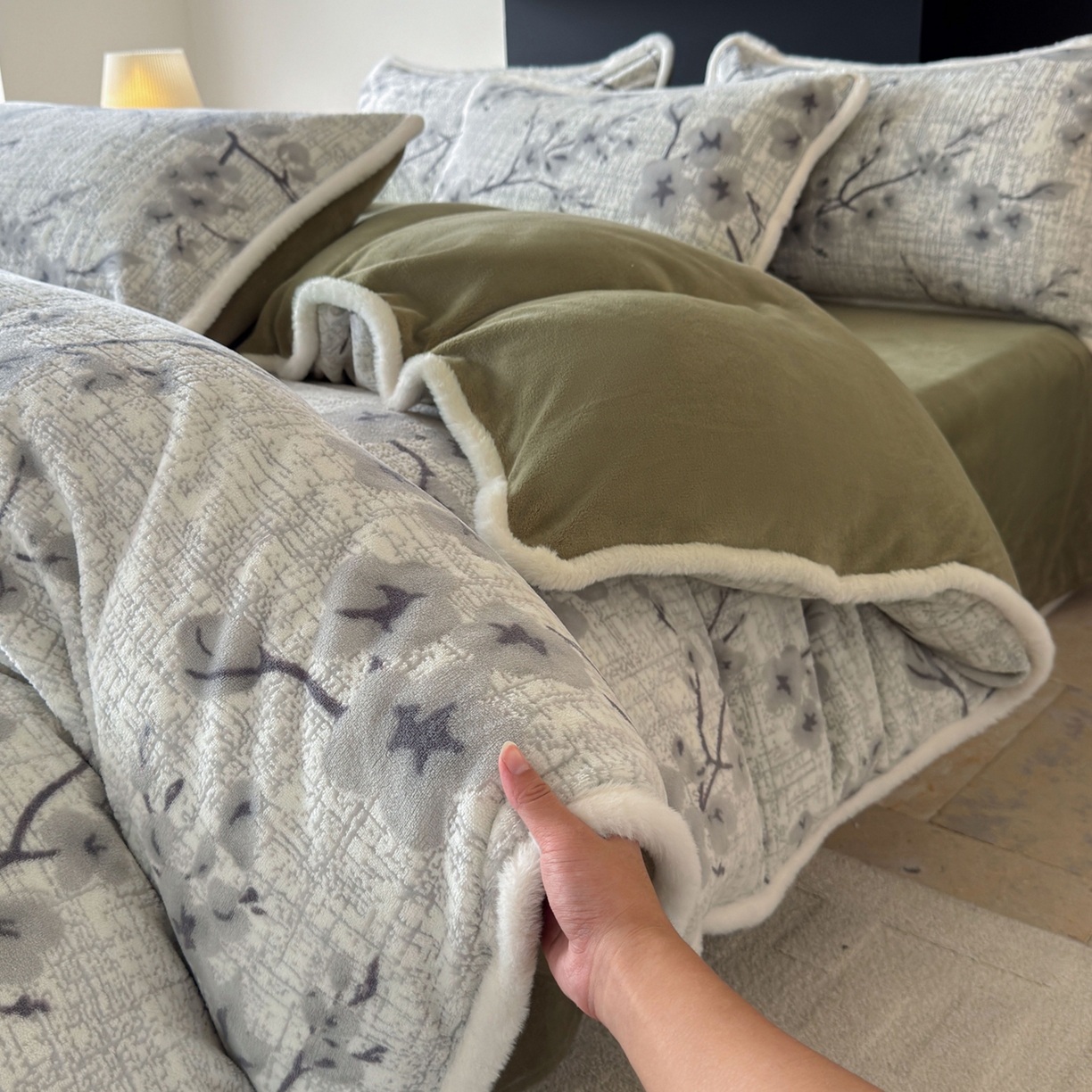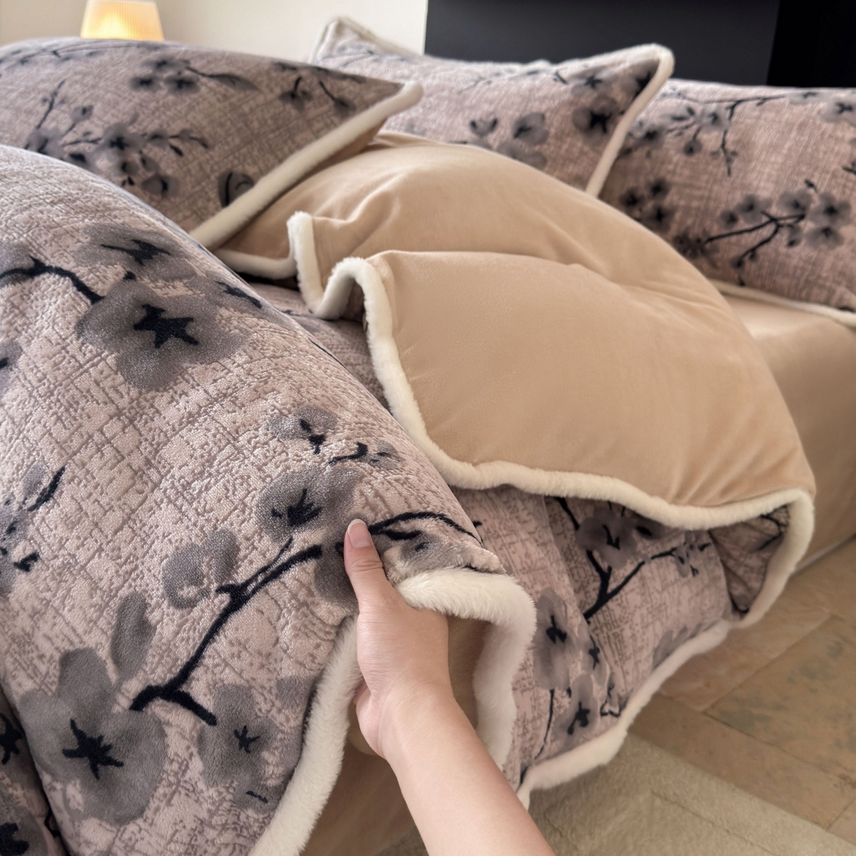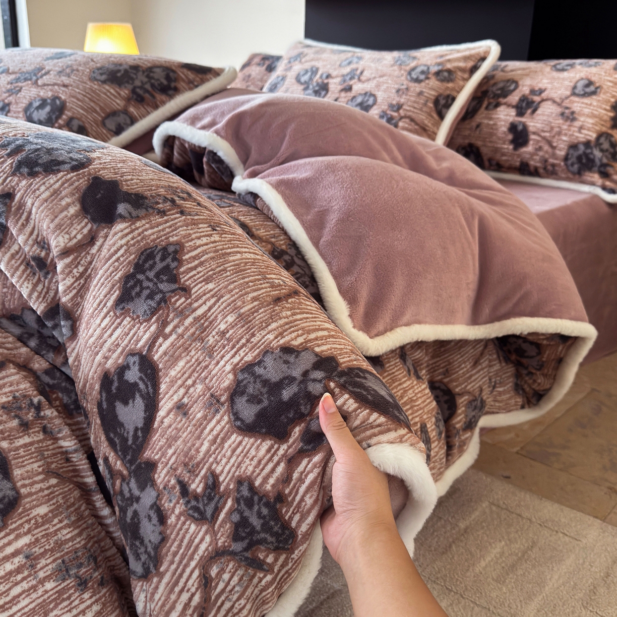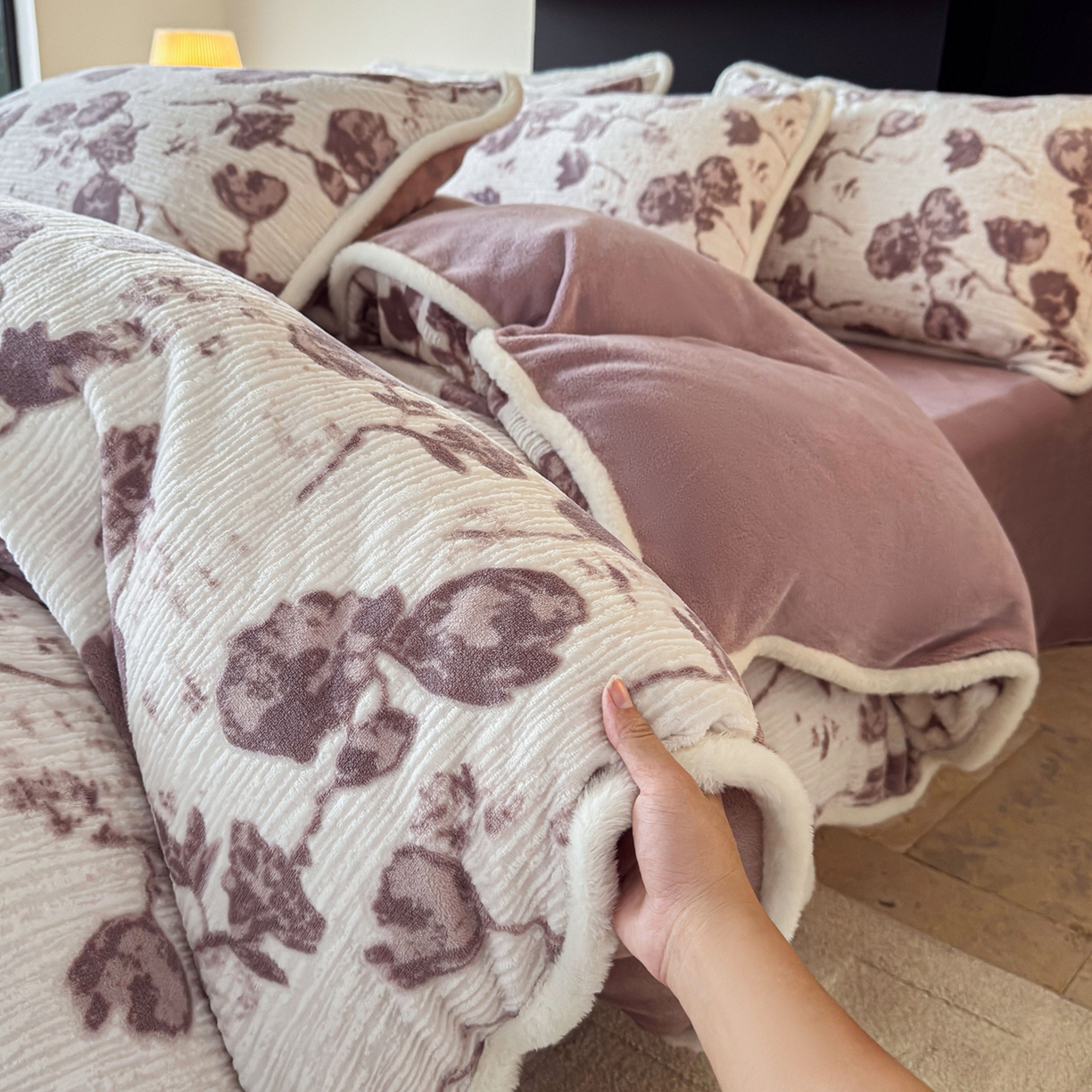 莱登卡奴 - 产品中心-2025新款高克重牛奶绒雕花兔毛包边款系列四件套