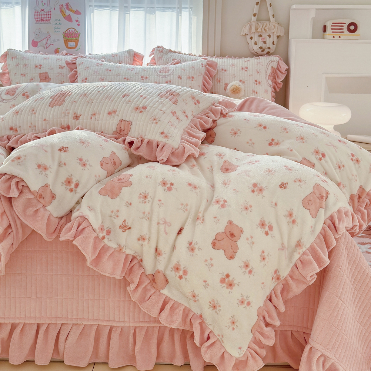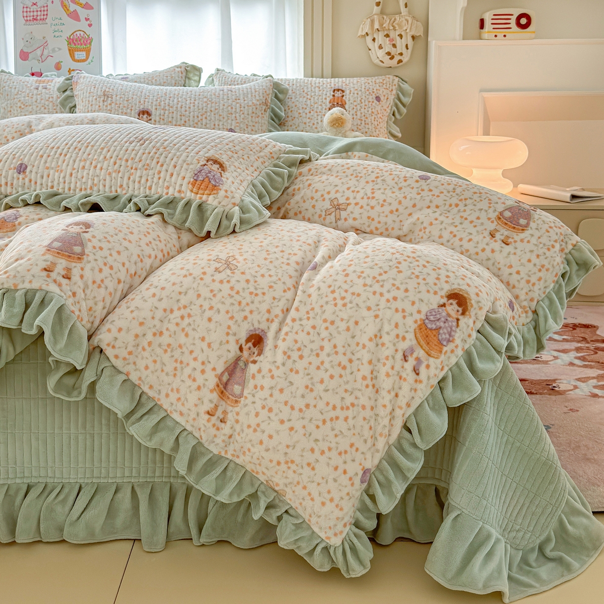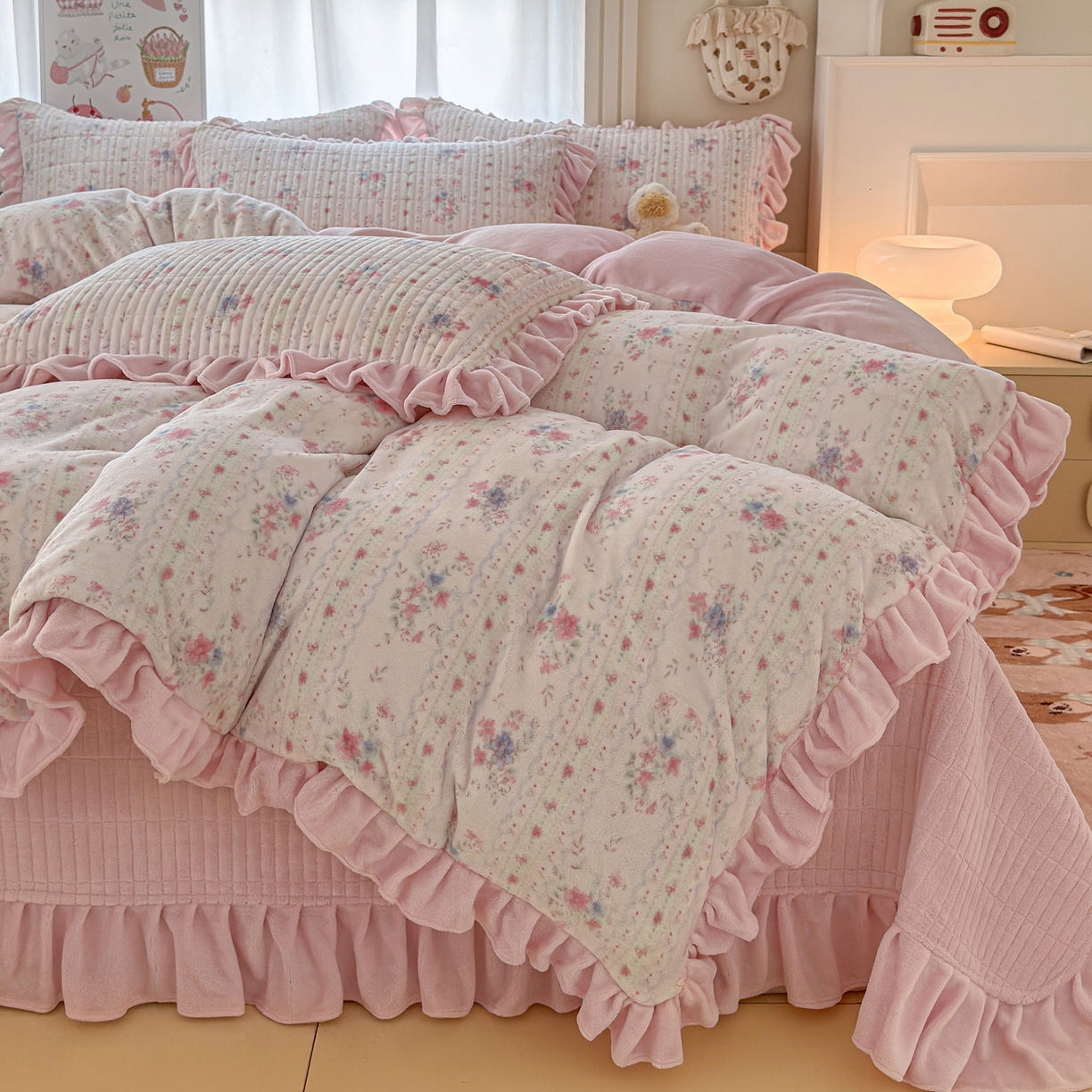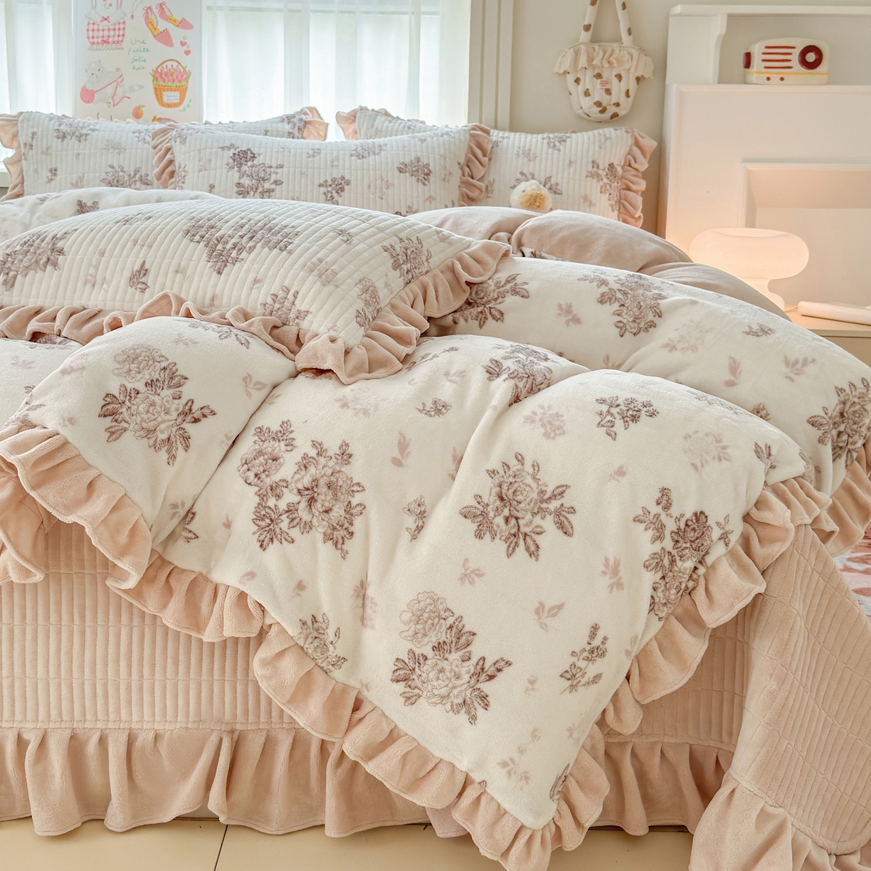 莱登卡奴 - 产品中心-2025新款高克重牛奶绒花边床盖款系列四件套