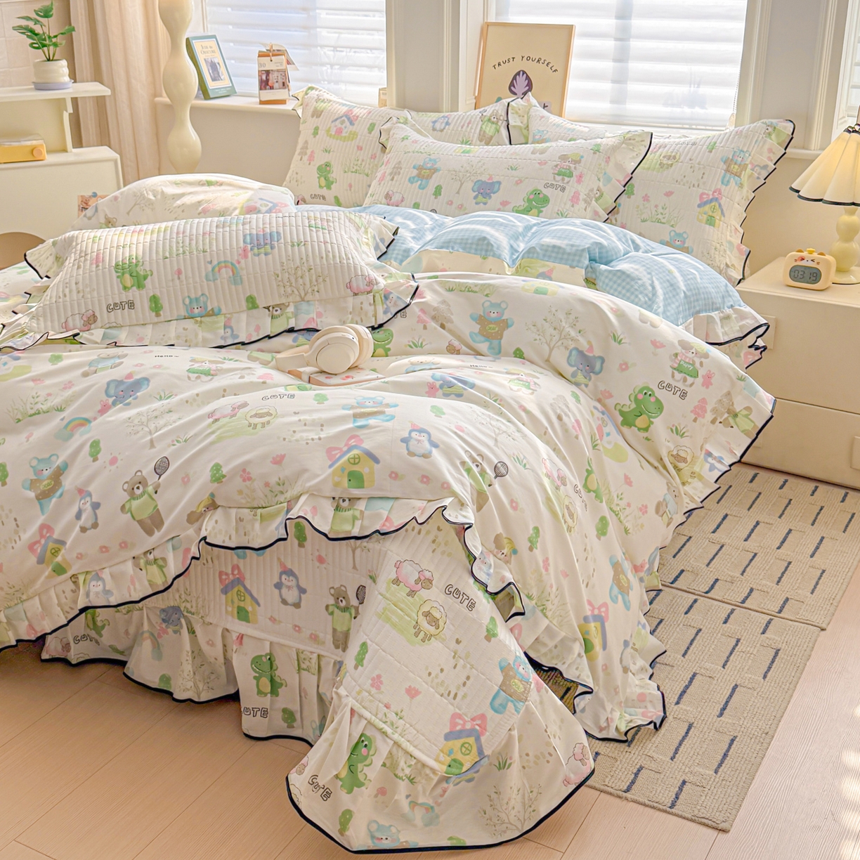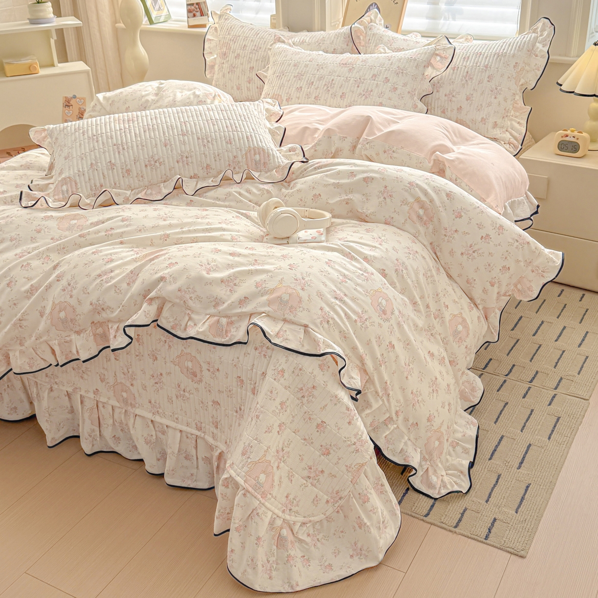 莱登卡奴 2026新款全棉A类小清新花边床盖款系列四件套 小熊与小兔