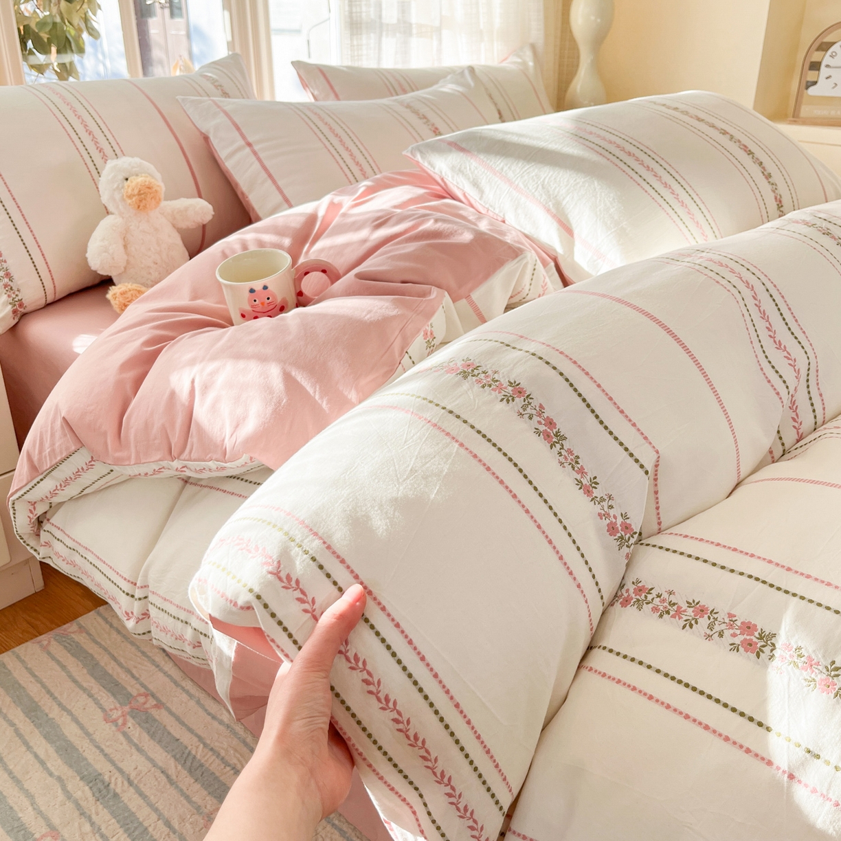 莱登卡奴 2026新款全棉纯棉A类水洗棉色织提花剪花系列四件套 纹络花时粉