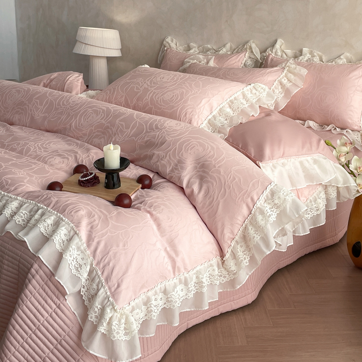 2026新款全棉纯棉A类60S水洗浮雕立体提花花边床盖款四件套-温馨系列